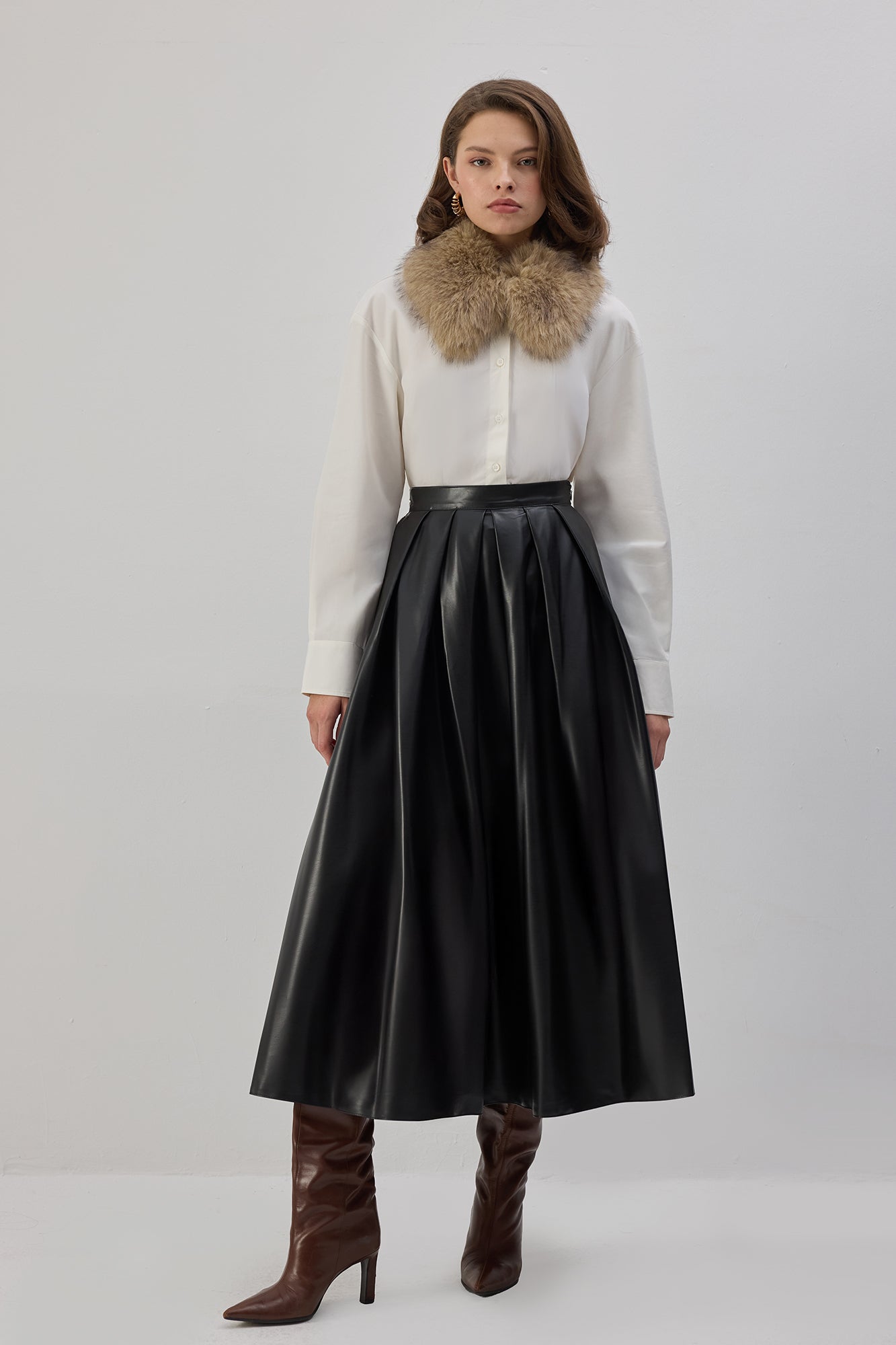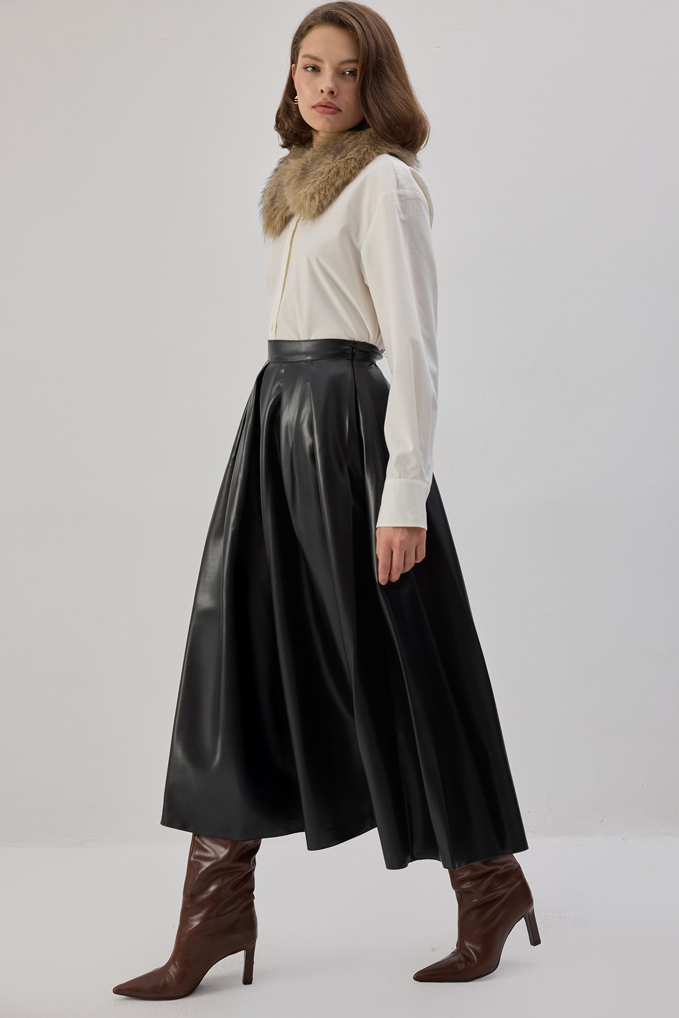 Pileli. Yanı fermuar kapamalı. Yüksek bel. Midi boy. Vegan deri etek.