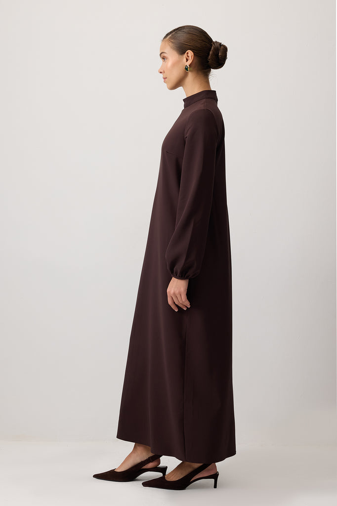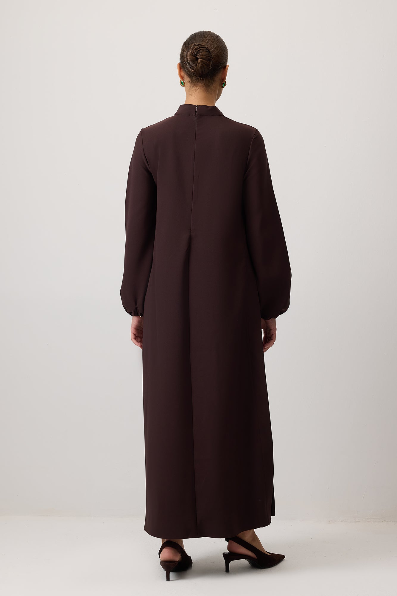 Krep. Dik yaka. Kol ucu büzgülü. Yanlar pile detaylı. Gizli fermuar kapamalı.