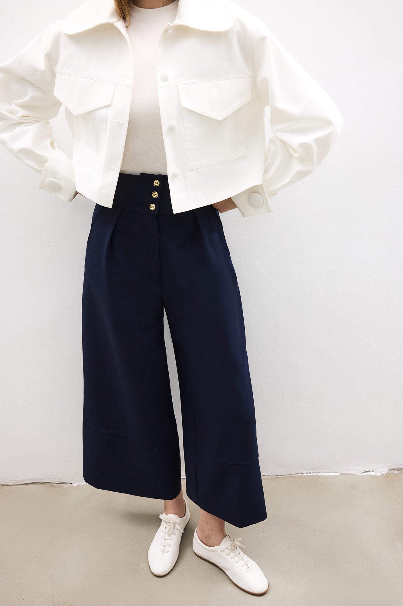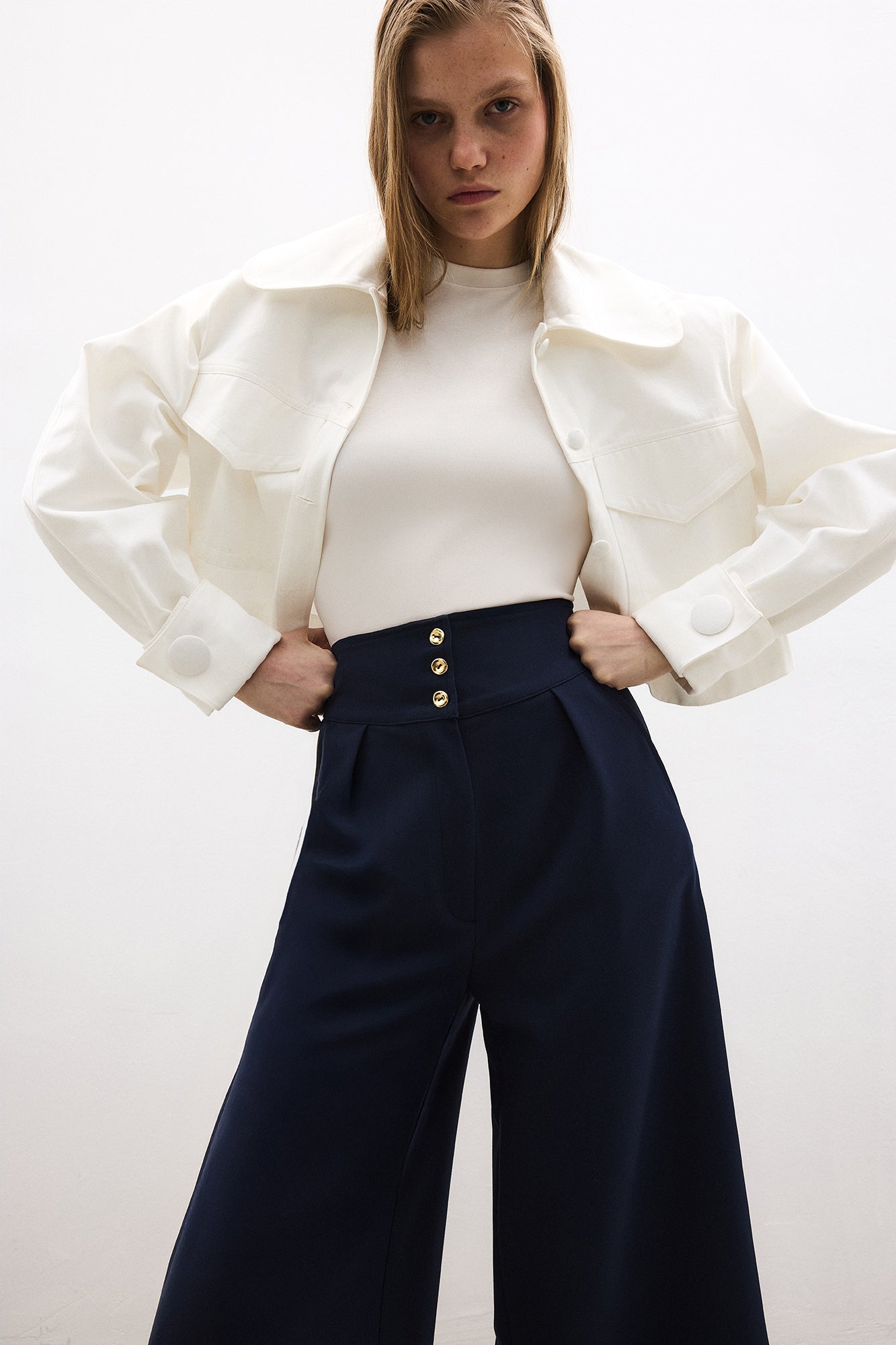 Yüksek bel. Yan cepli. Düğme ve fermuar kapamalı. Geniş paça. Pile detaylı.