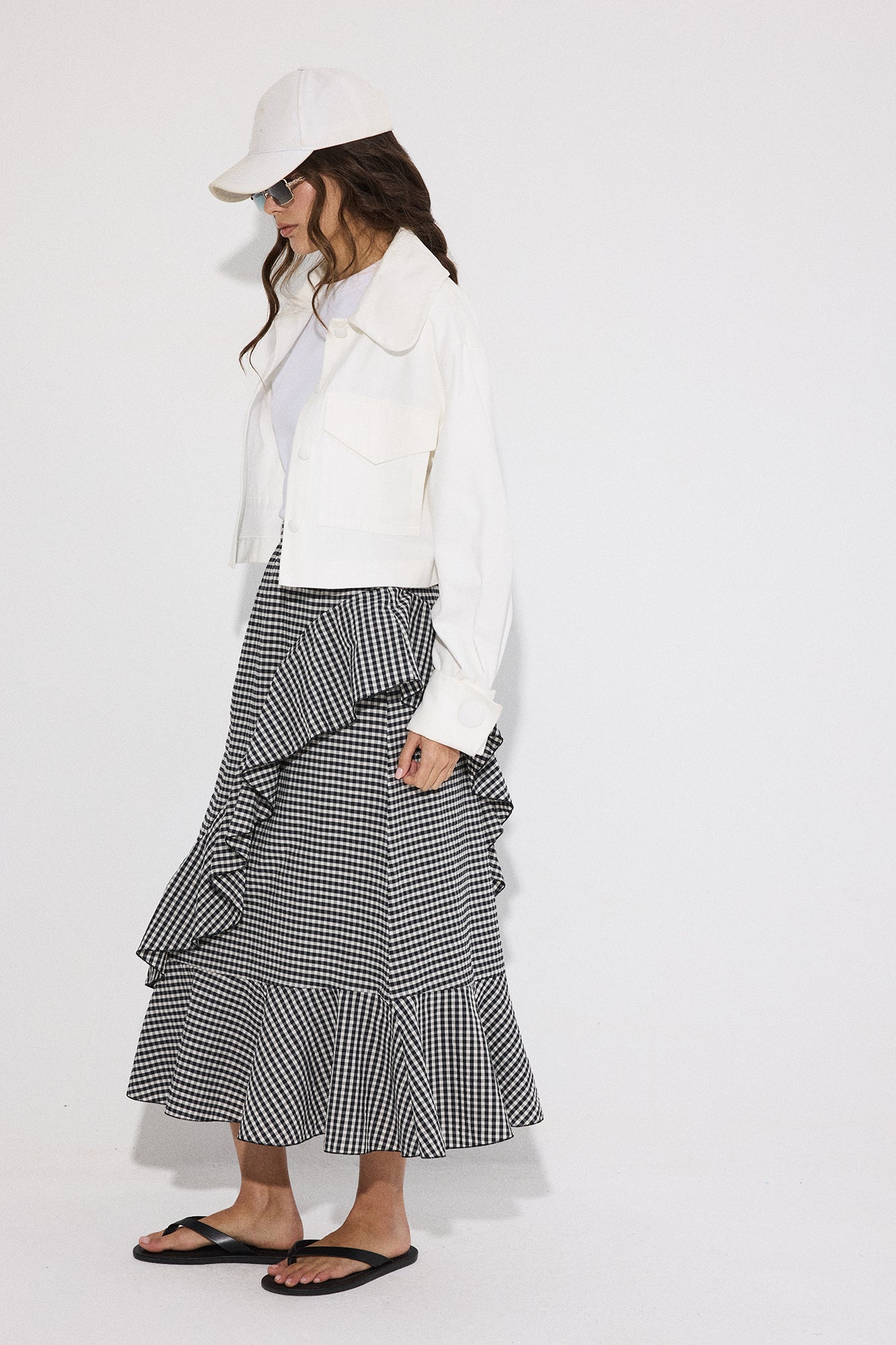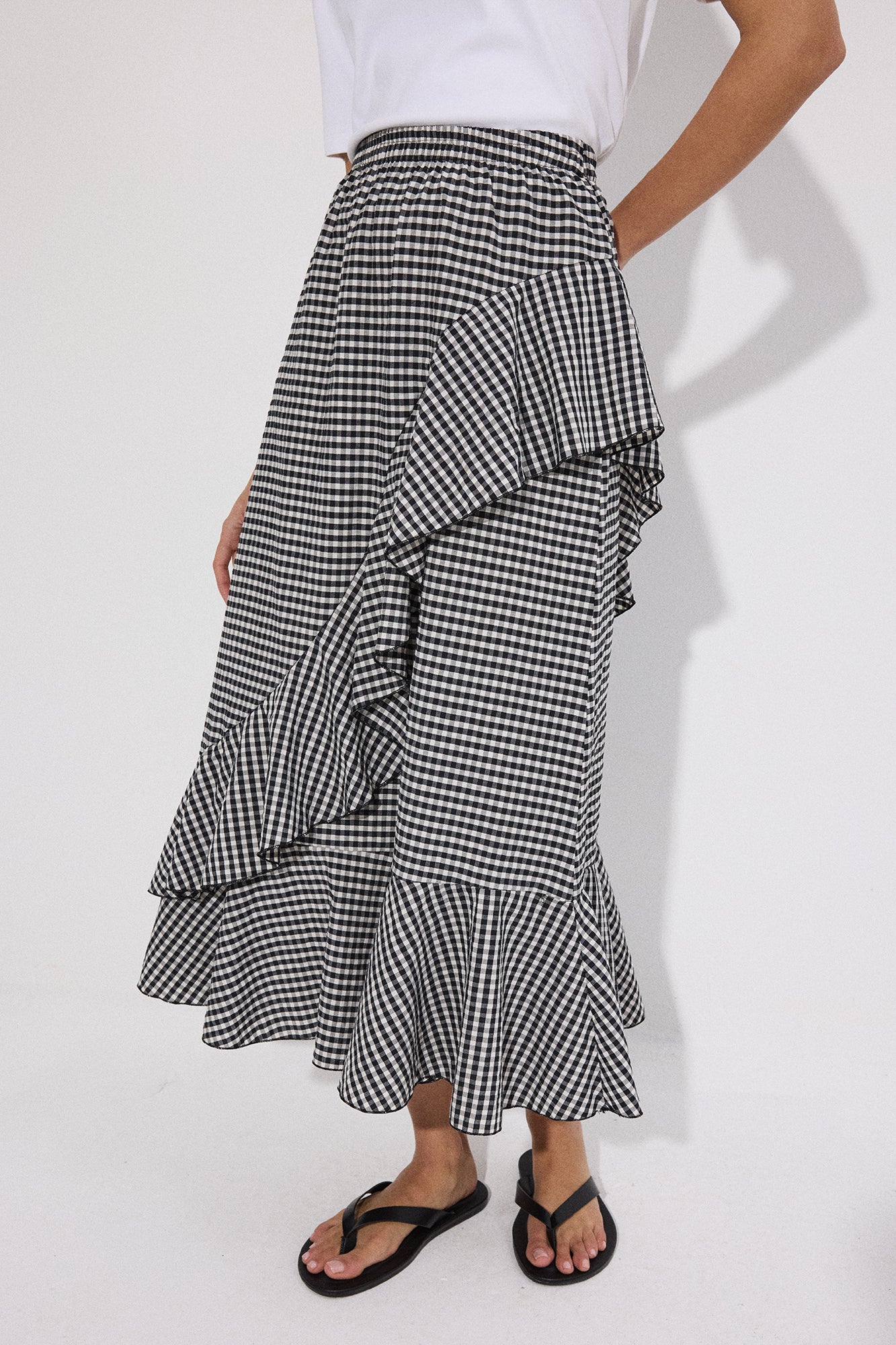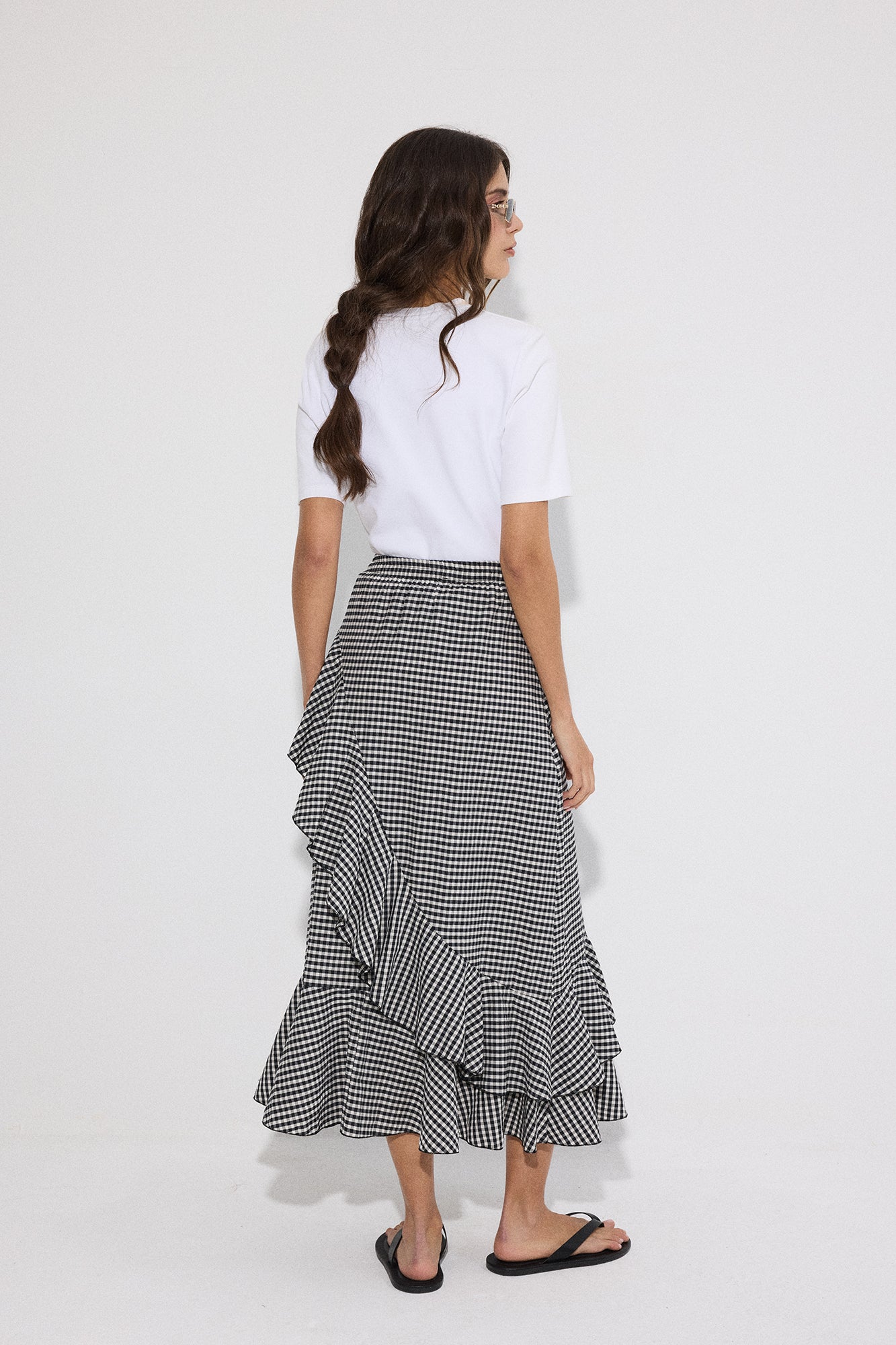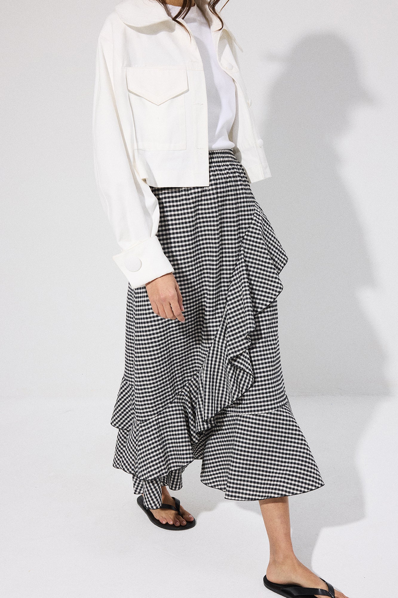 Yüksek bel. Beli lastikli. Midi boy. Siyah-beyaz pötikare desen. Asimetrik fırfır ve volan detaylı.
