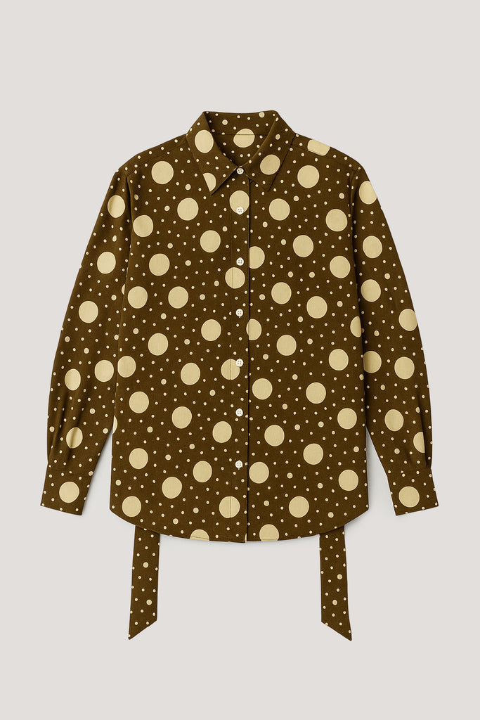 Klasik yaka. Uzun kollu. Balon kol formunda. Puantiye desenli gömlek.