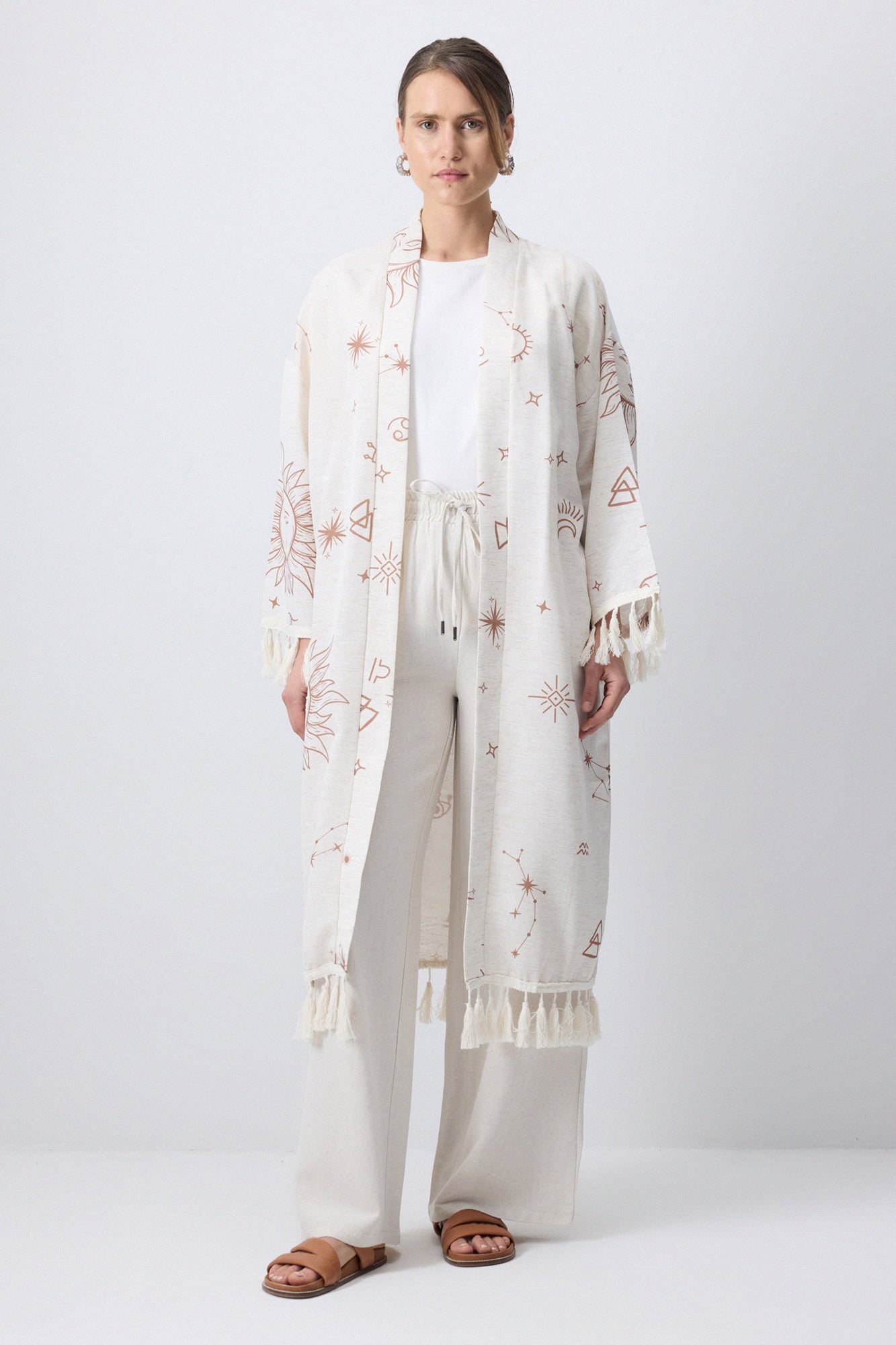 Uzun boy. Uzun kollu ve düşük omuzlu. Kol ucu püskül detaylı. Desenli.