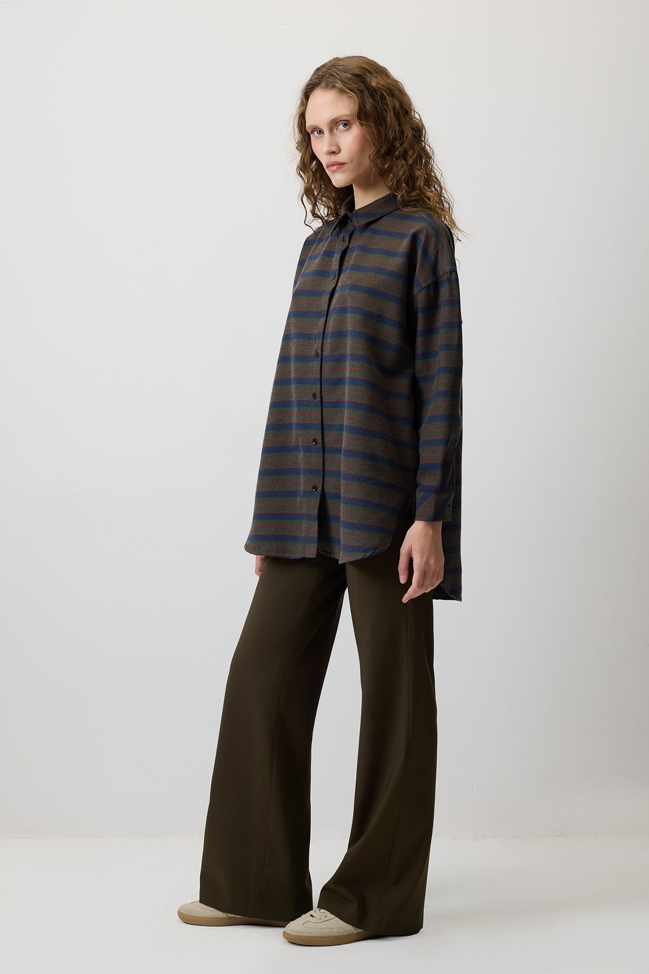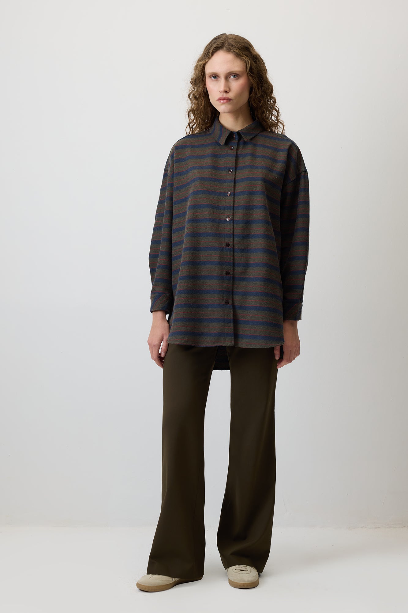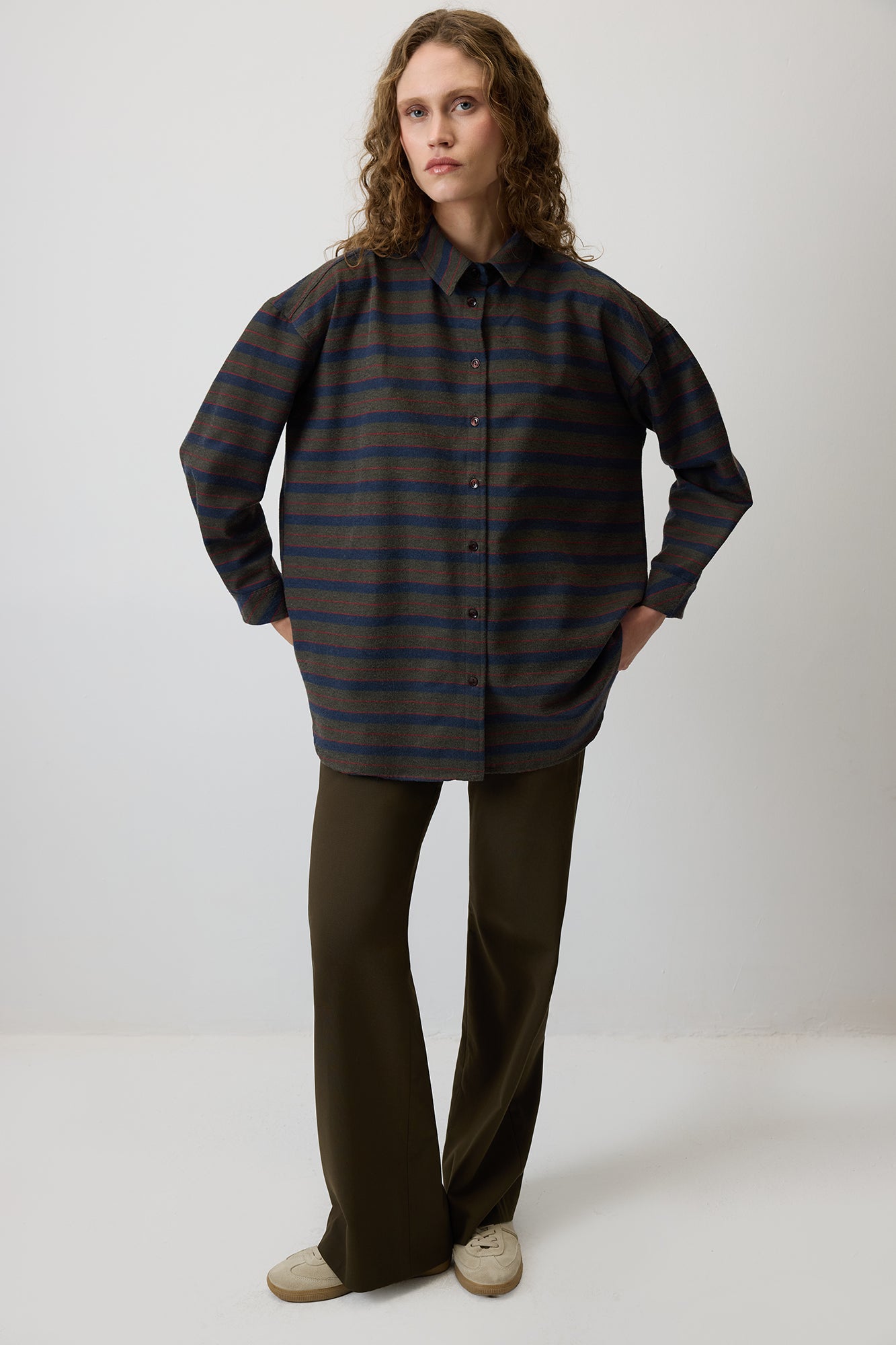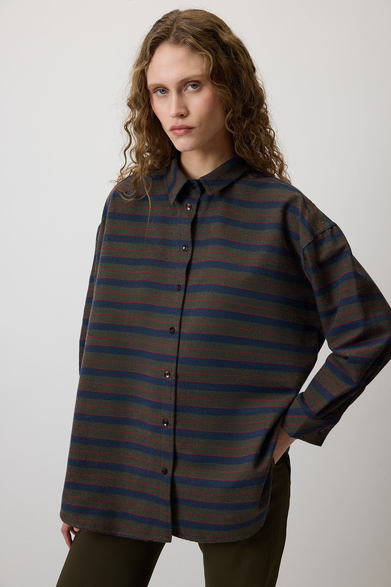 Çizgili gömlek. Önden düğmeli. Uzun kollu.