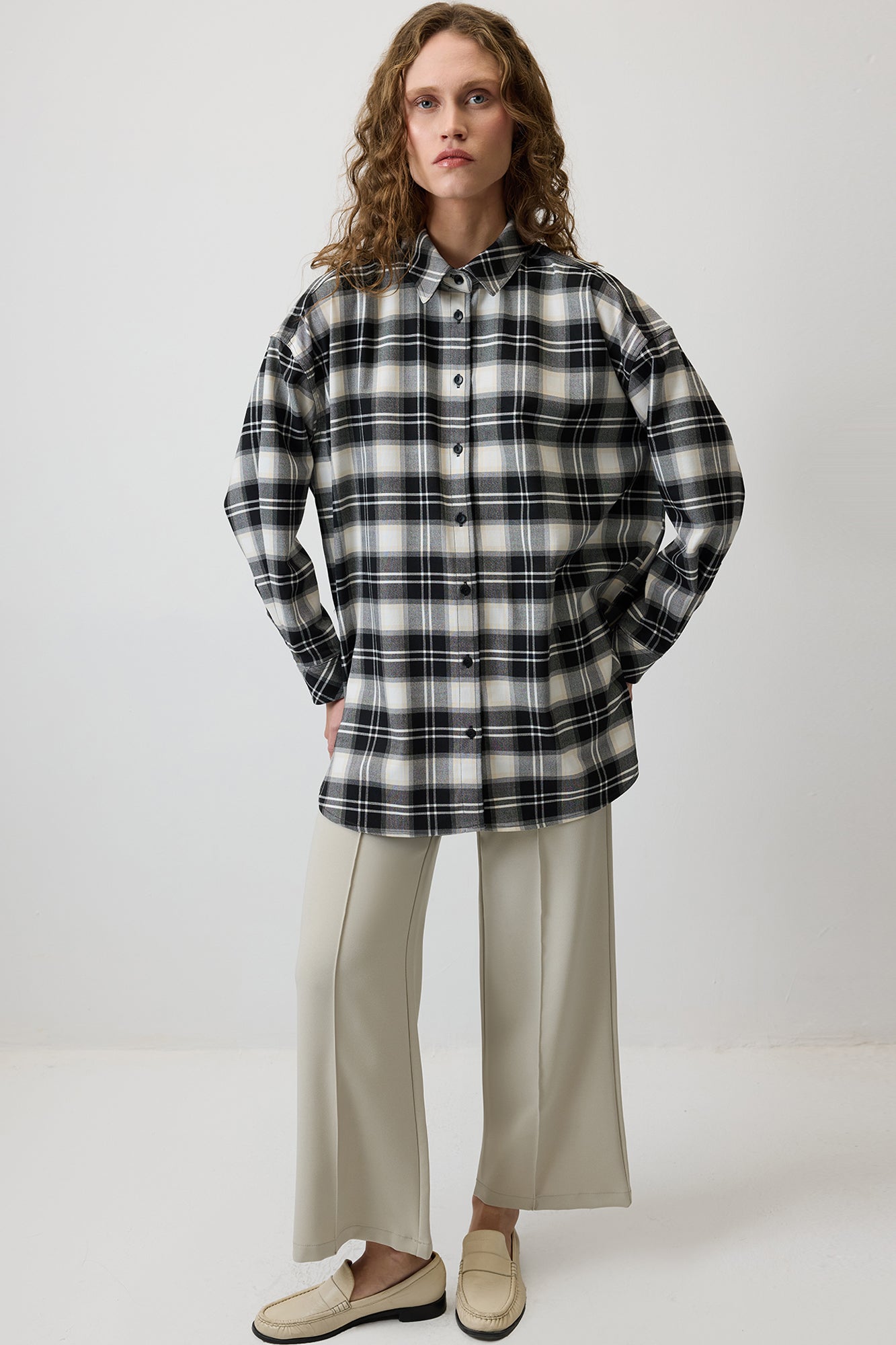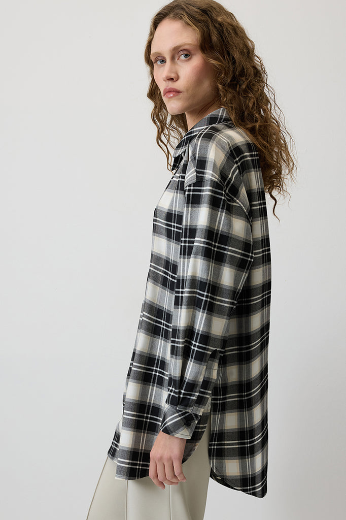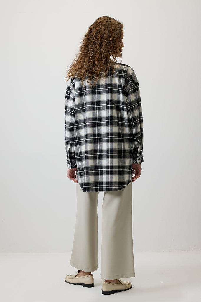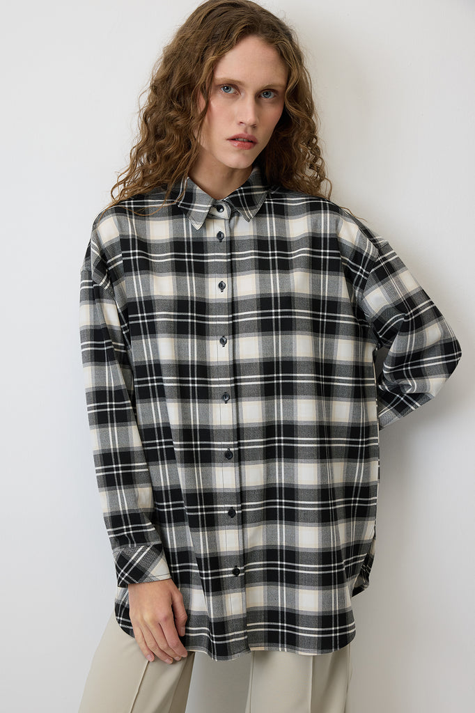 Klasik yaka. Uzun kollu ve düşük omuzlu. Manşetleri düğme kapamalı. Ekoseli. Önden düğme kapamalı.