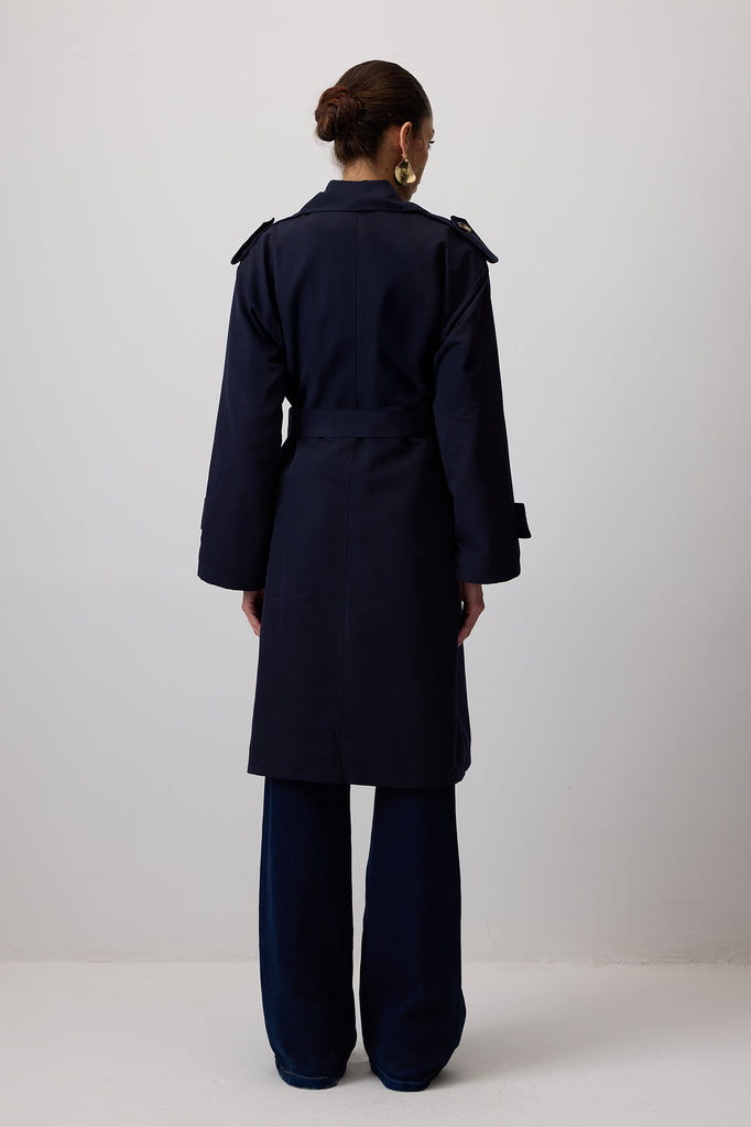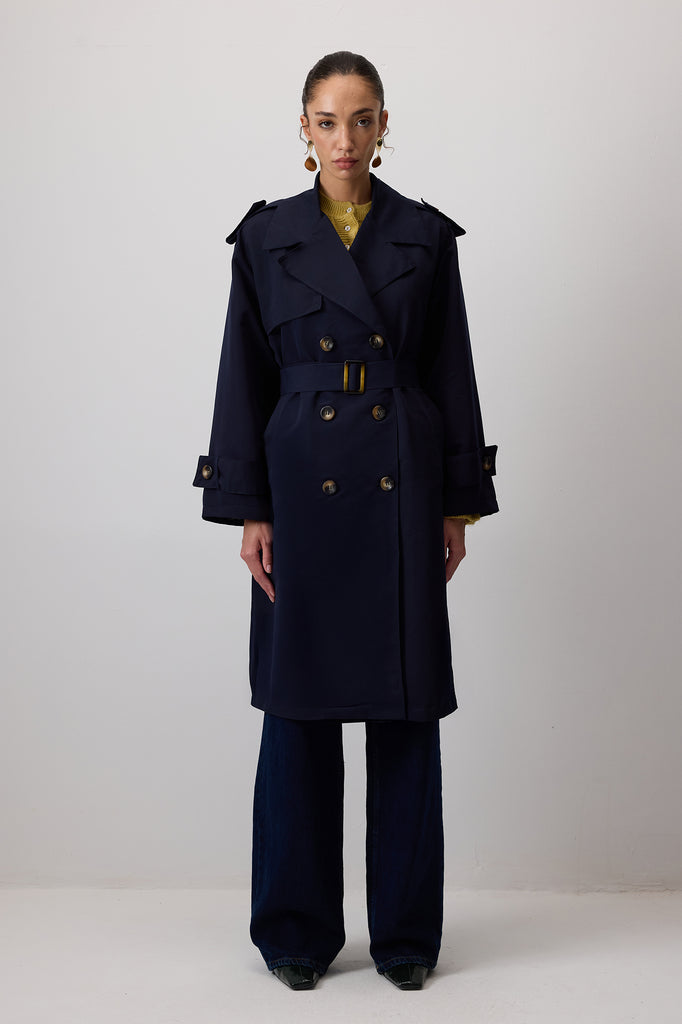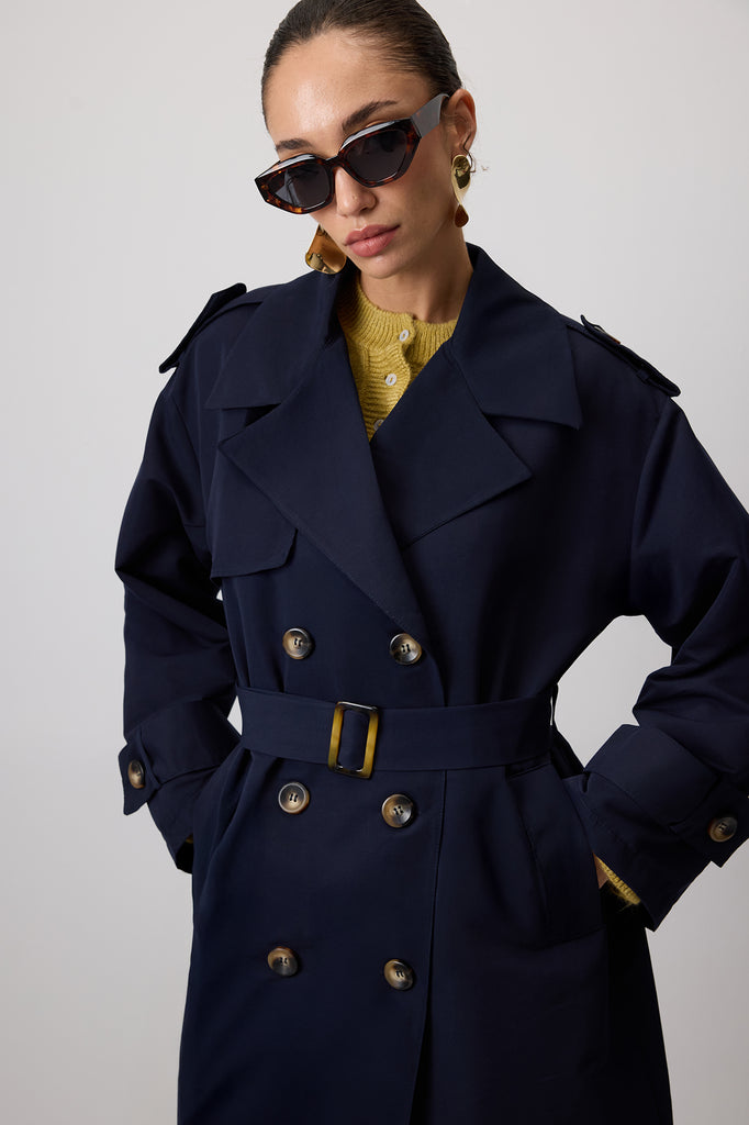 Kemerli trençkot. Geniş yaka. Çift düğme kapamalı. Apolet detaylı. Yan cepli.