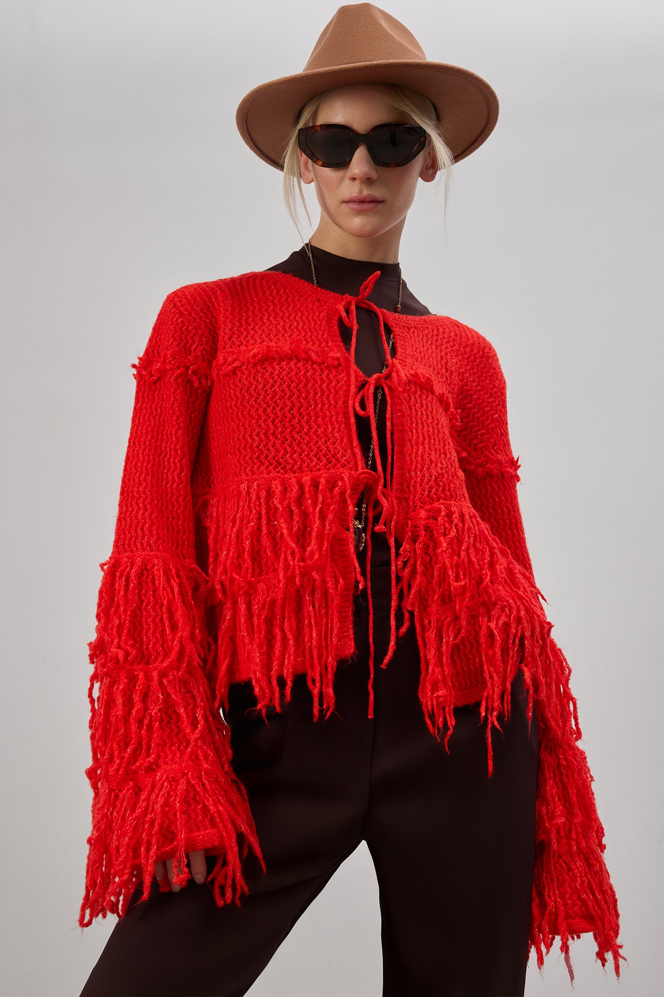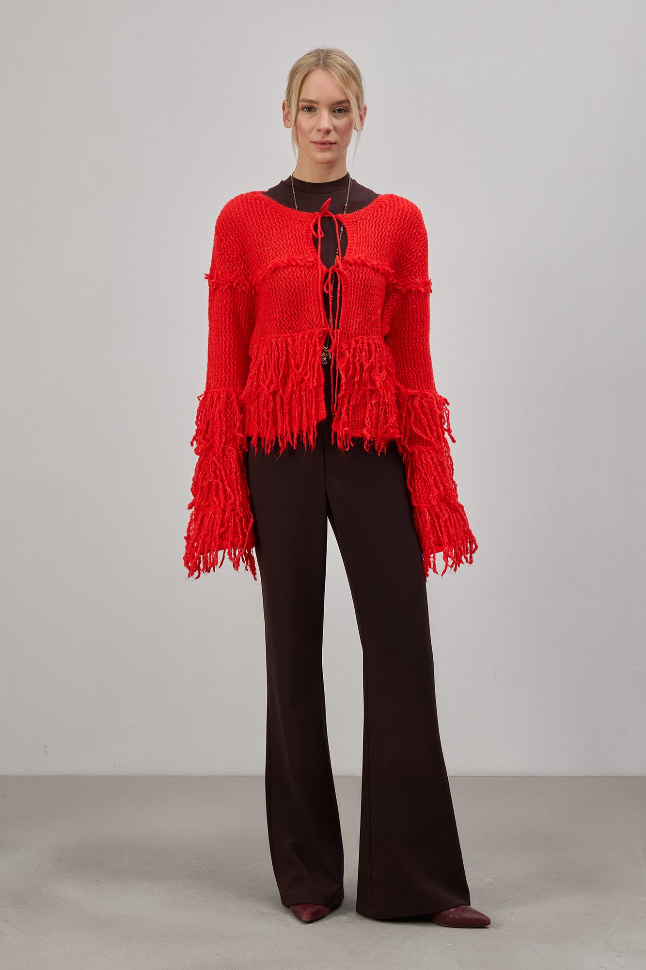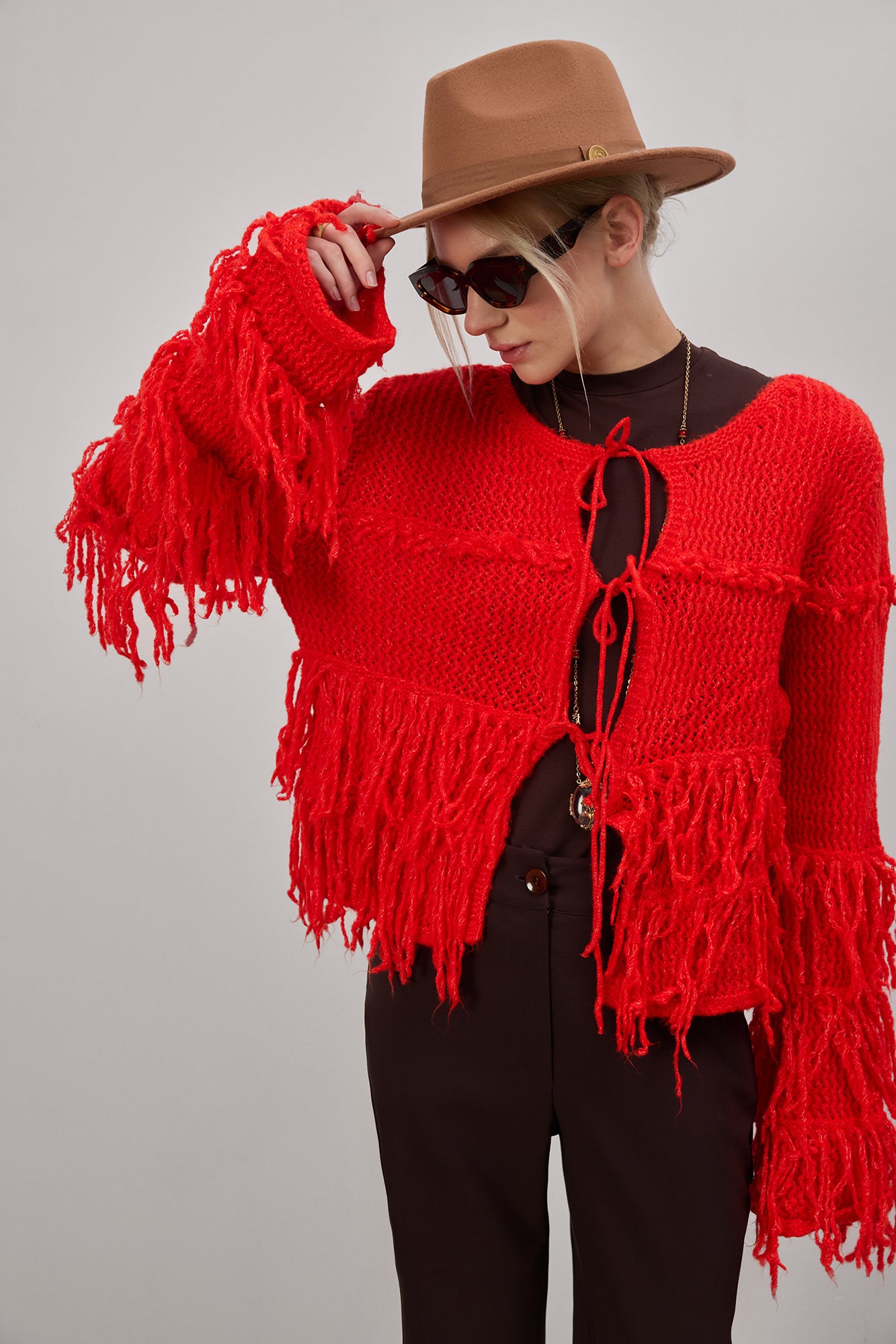 Püskül detaylı. Bağlamalı ön kapama. Uzun kollu. Triko hırka.