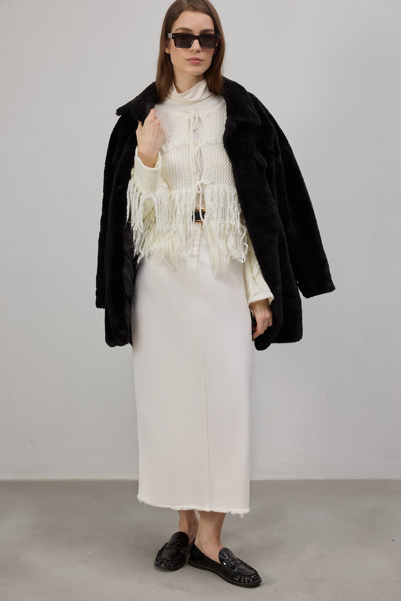 Yumuşak ve orta kalınlıktaki triko yapısı ile serin havalarda konforlu bir kullanım sağlarken; jean, elbise ve yüksek bel pantolonlarla kolaylıkla kombinlenebilir. Hem günlük şehir stillerinde hem de casual şıklıkta öne çıkan, statement niteliğinde bir tamamlayıcı parça olarak gardıroba zamansız bir dokunuş ekler.