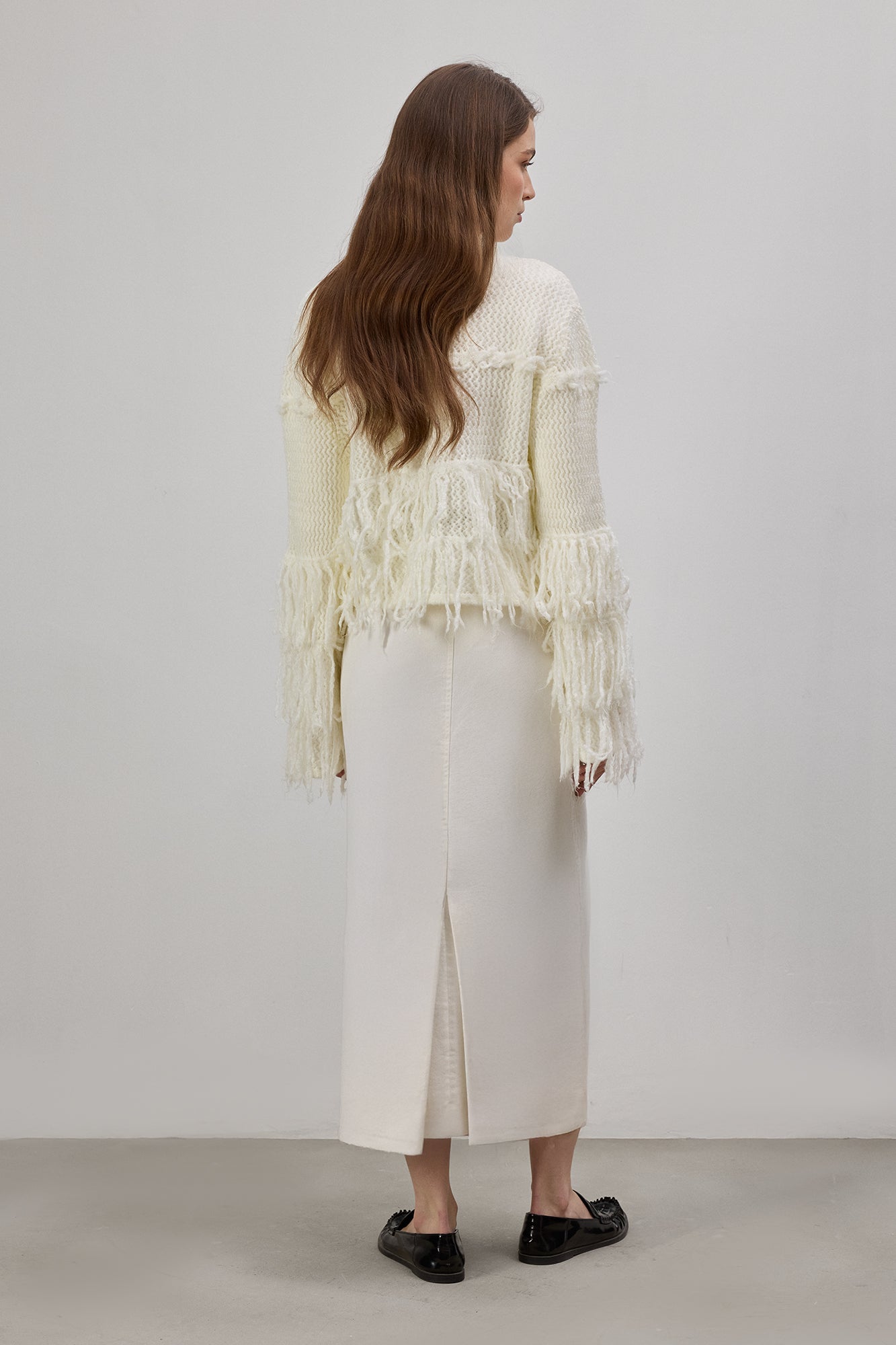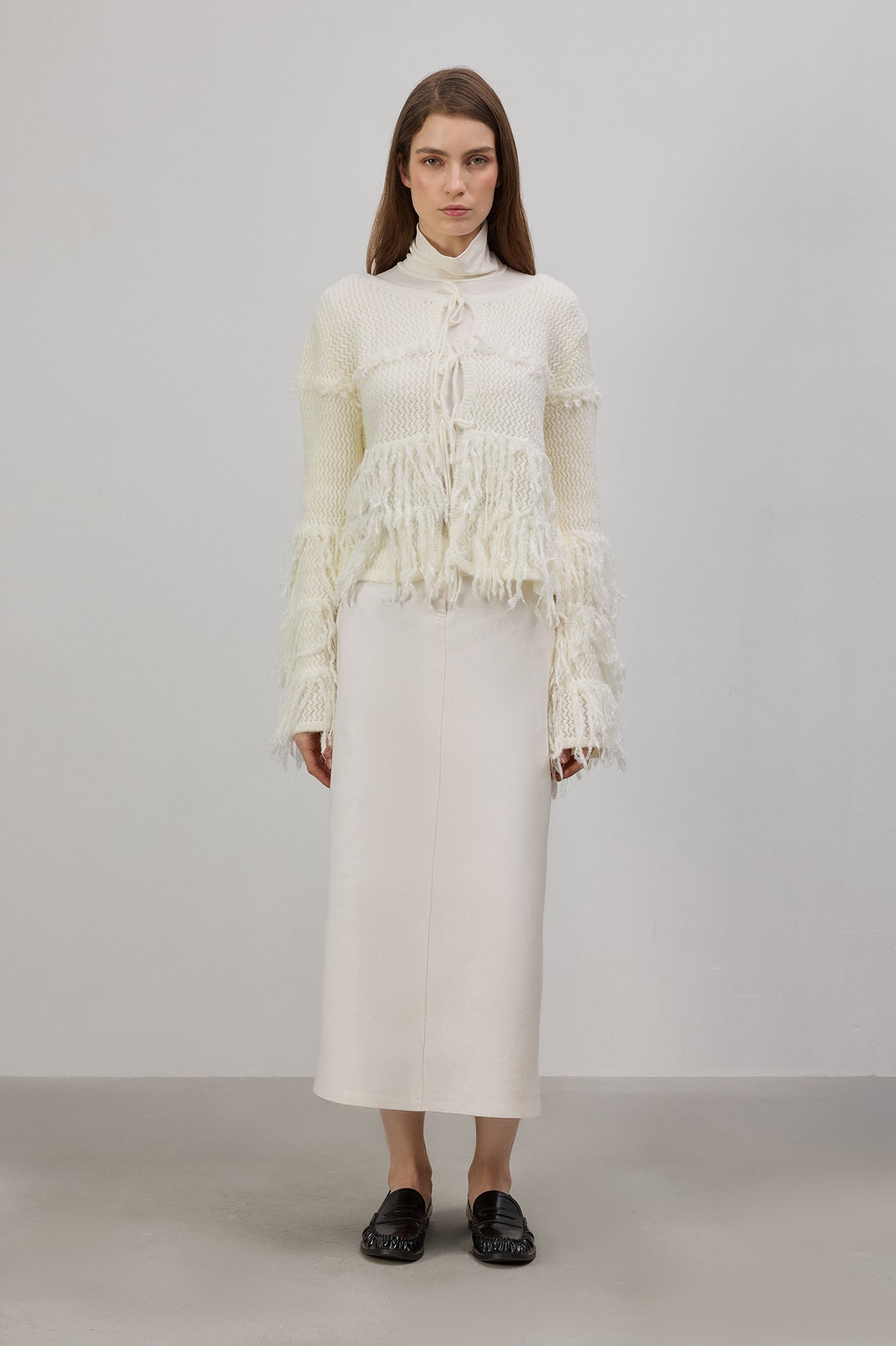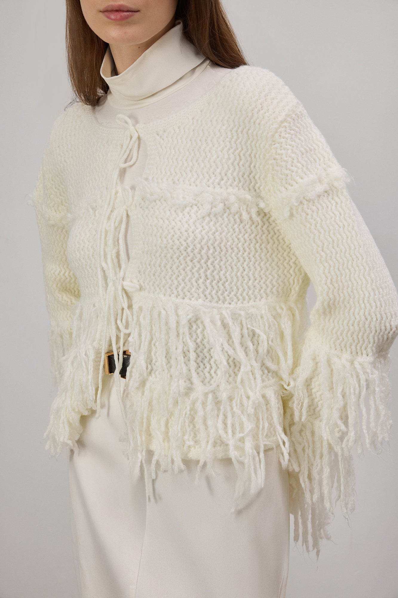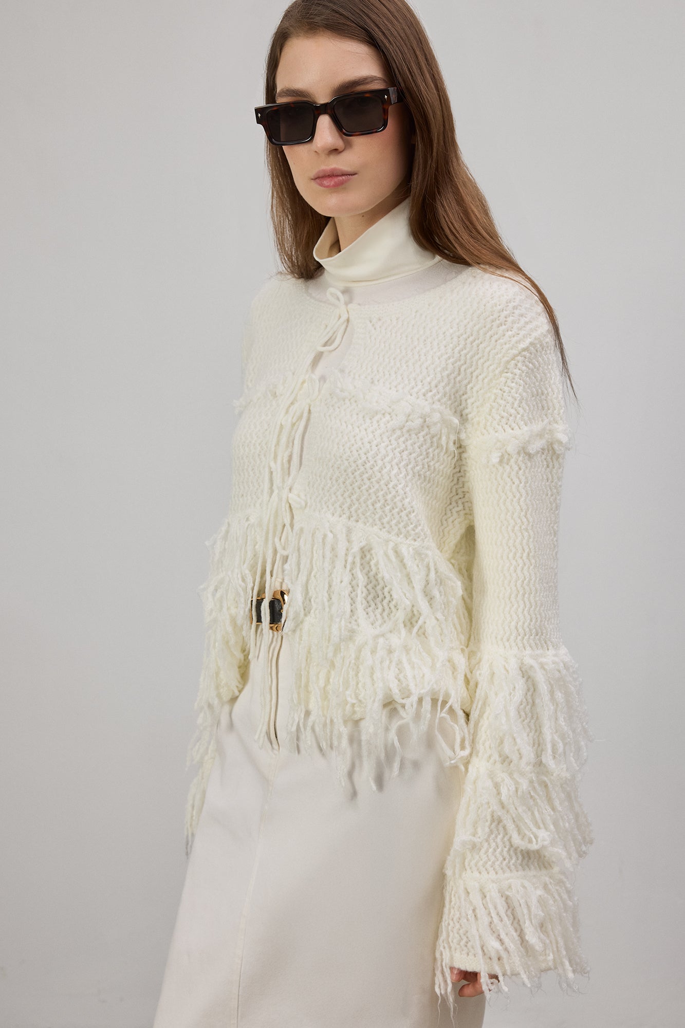 Püskül detaylı. Bağlamalı ön kapama. Uzun kollu. Triko hırka.