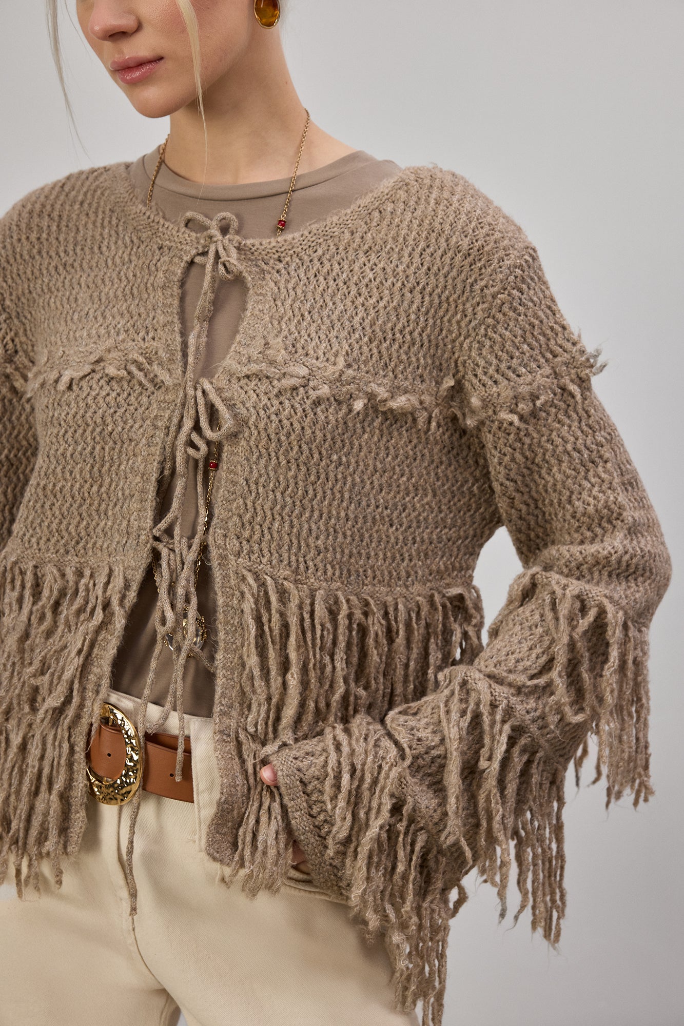 Püskül detaylı. Bağlamalı ön kapama. Uzun kollu. Triko hırka.