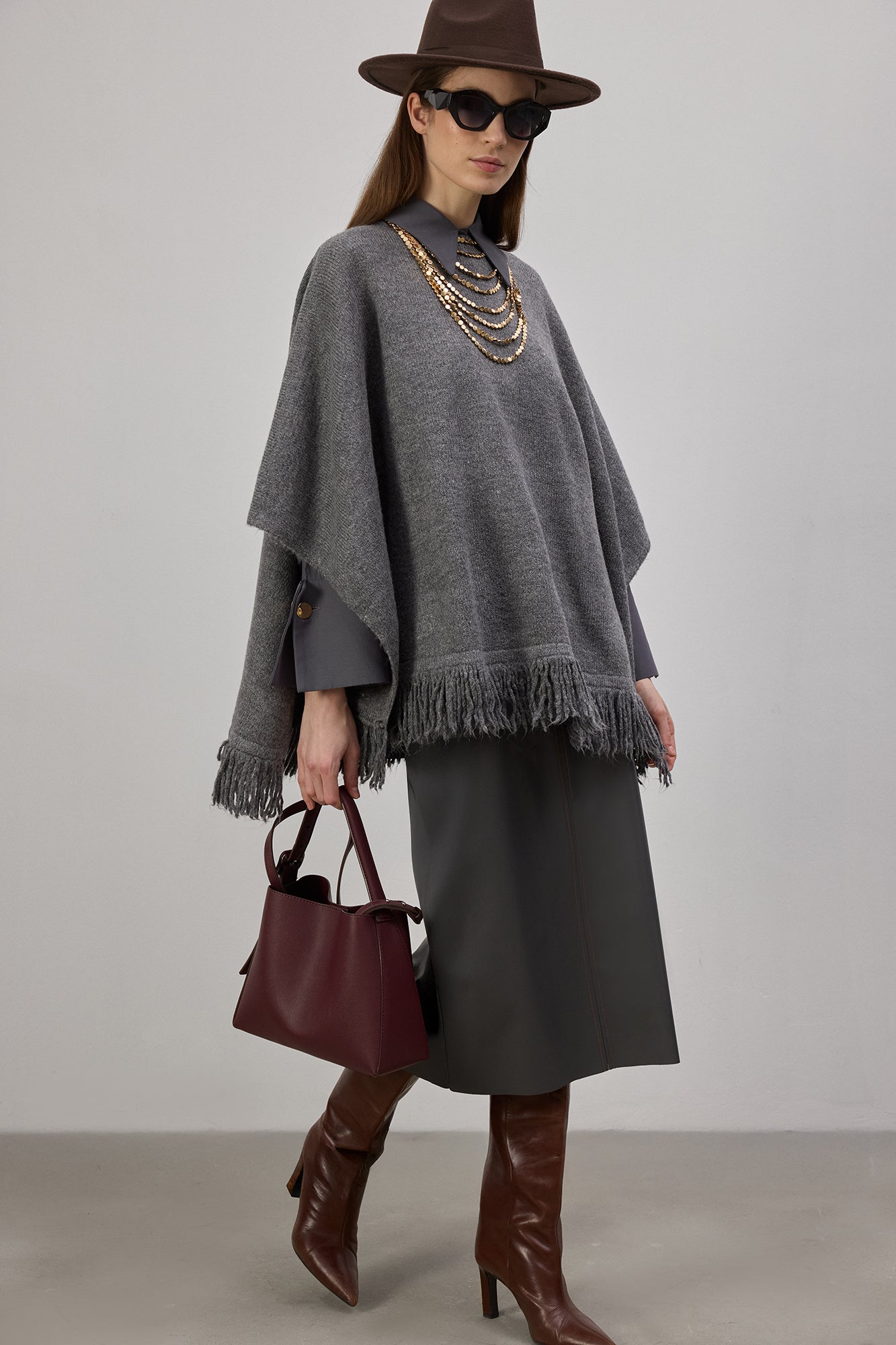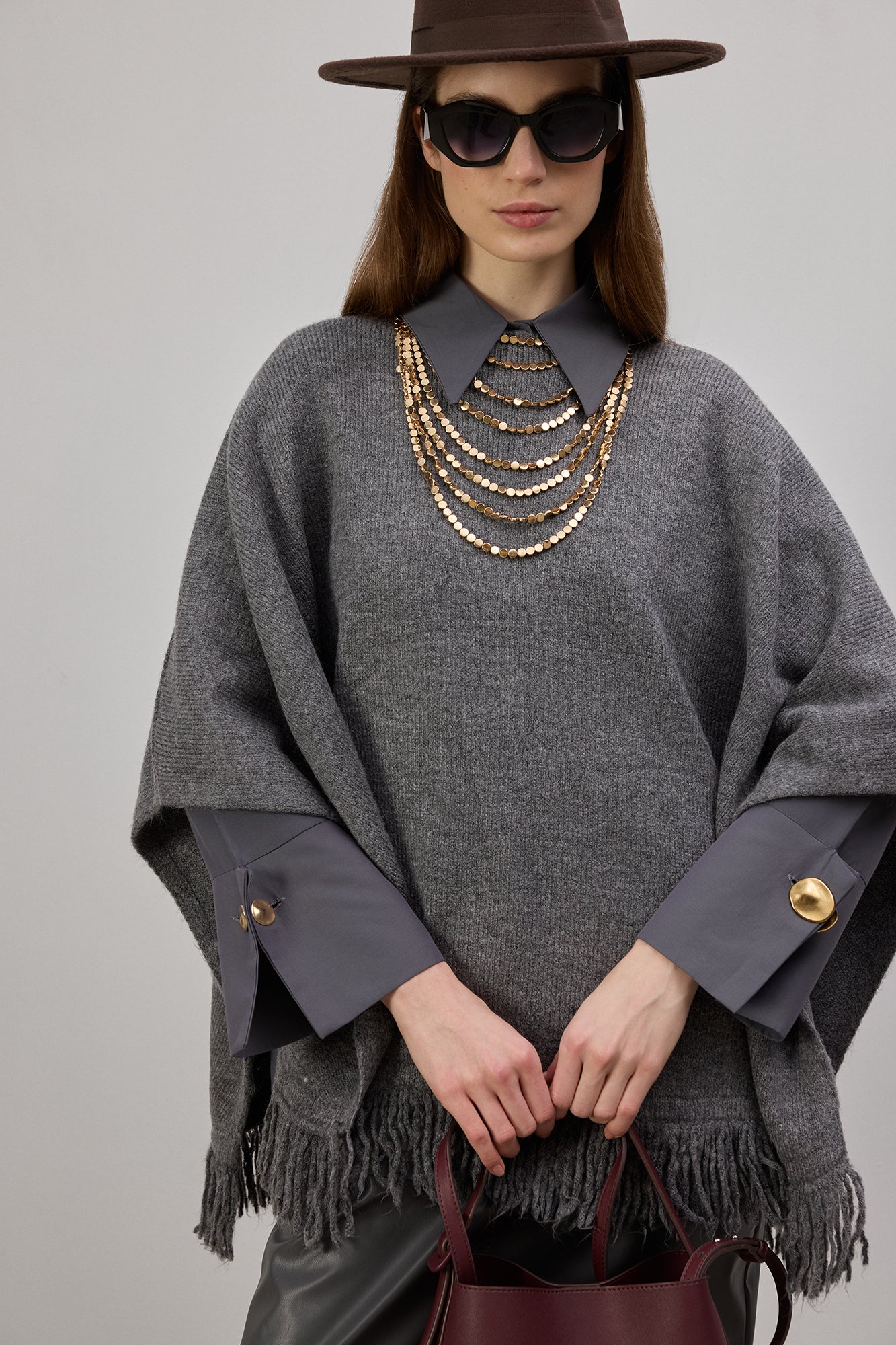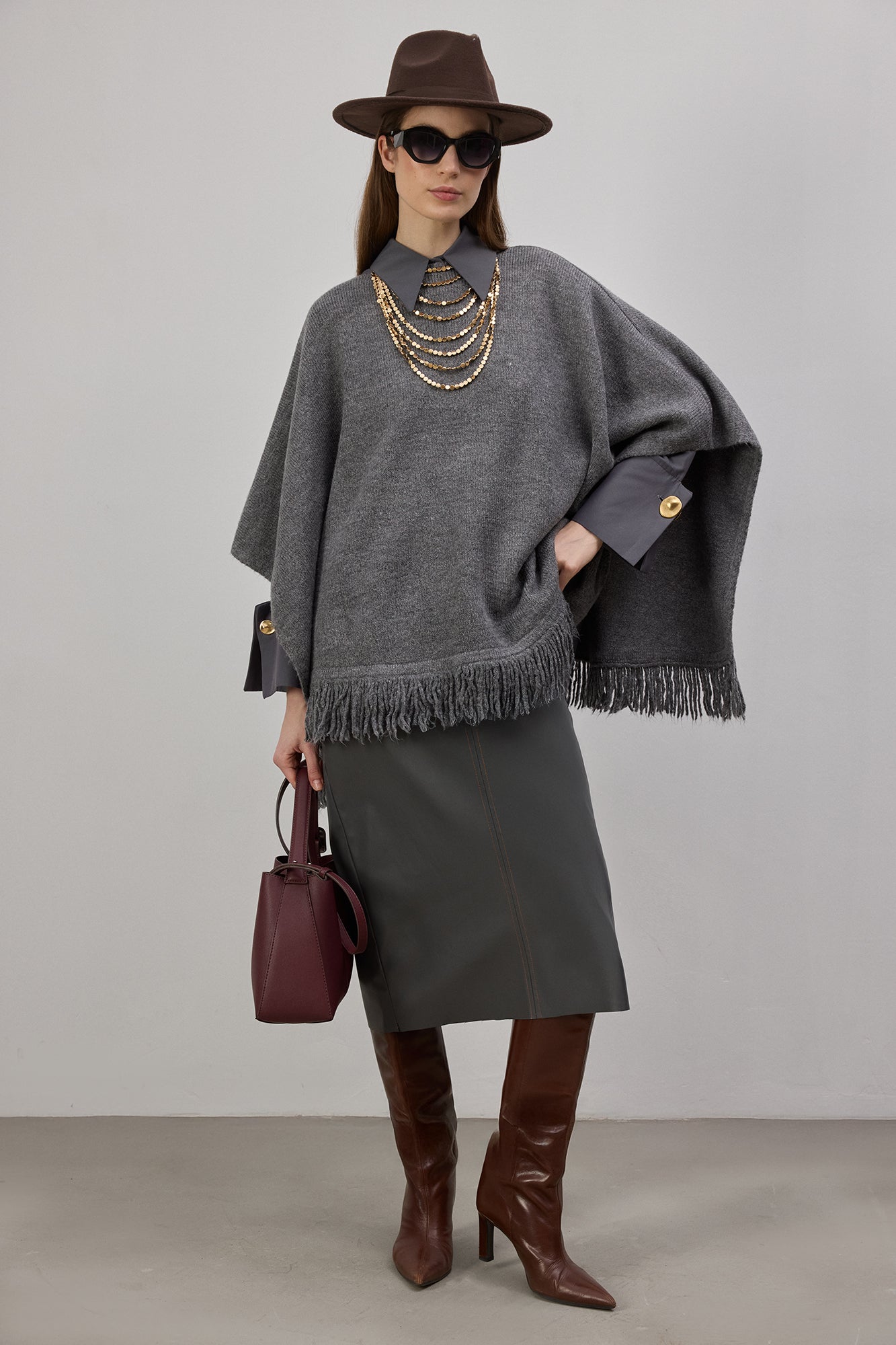 Bisiklet yaka. Saçak detaylı etek ucu. Triko panço.