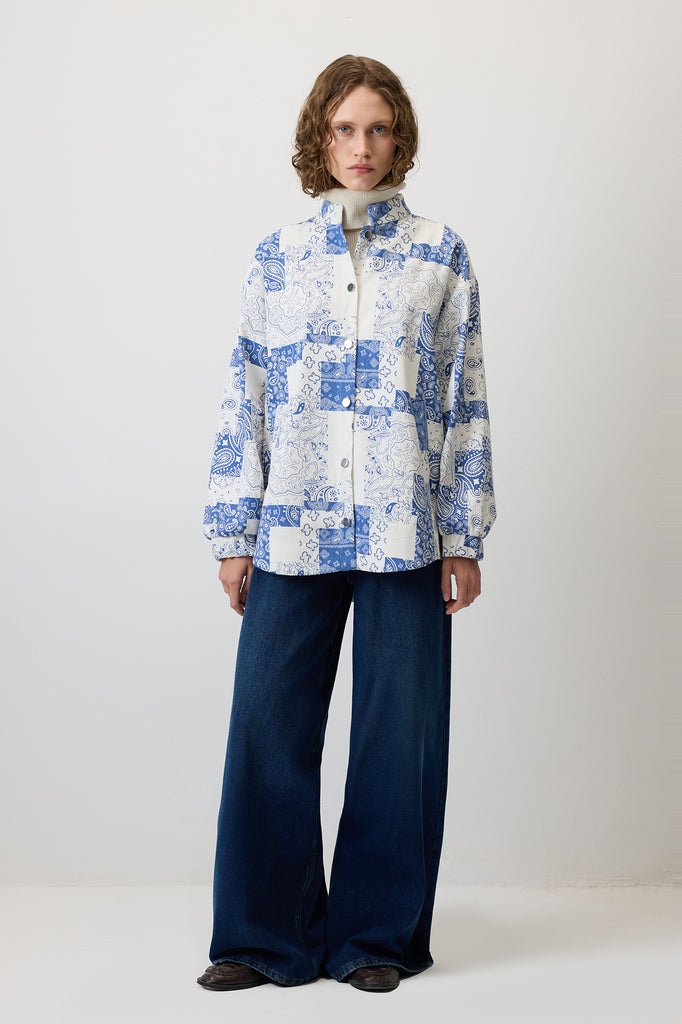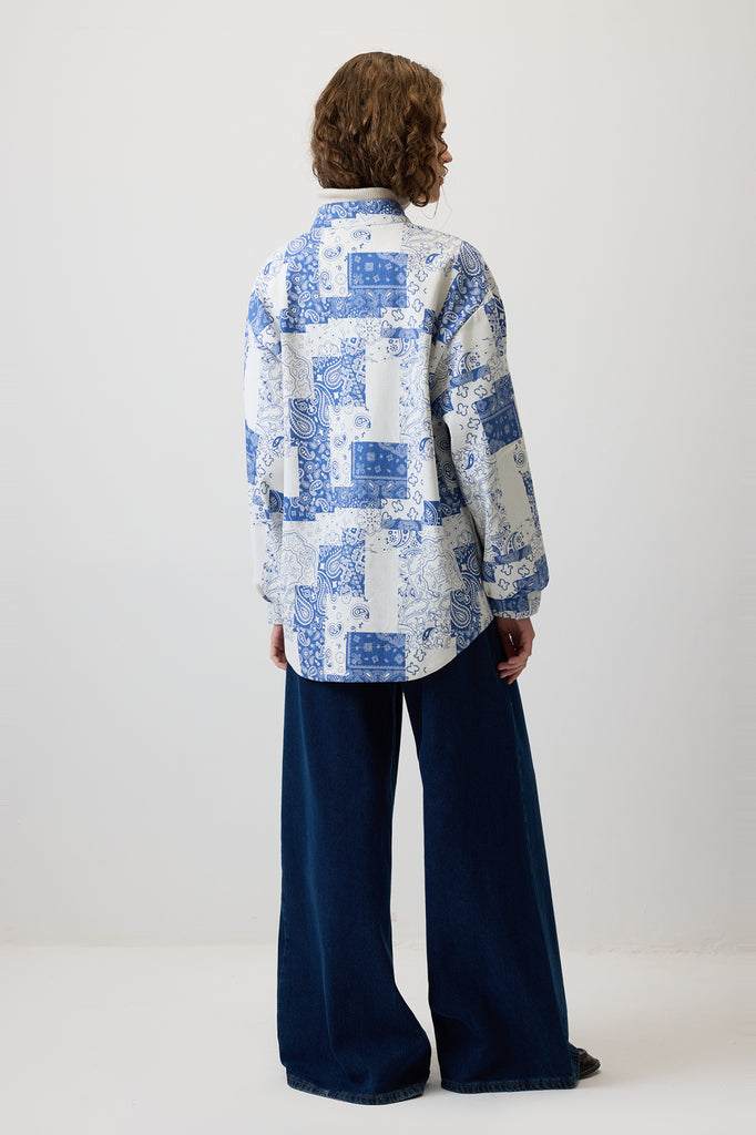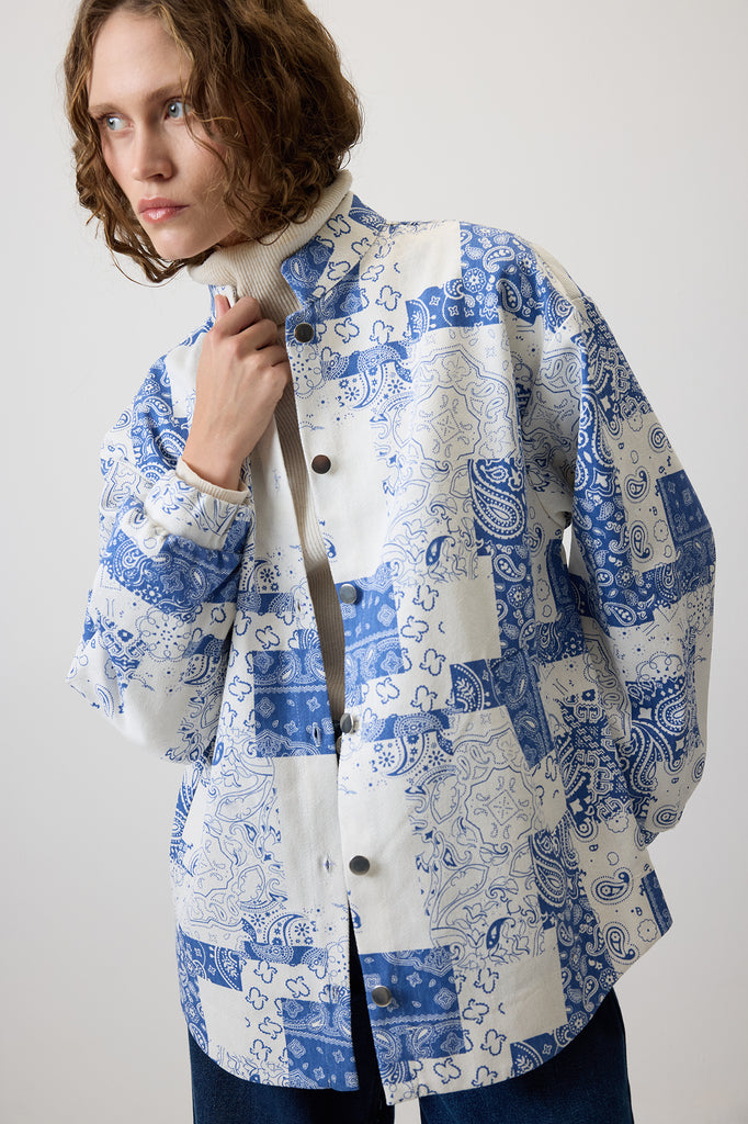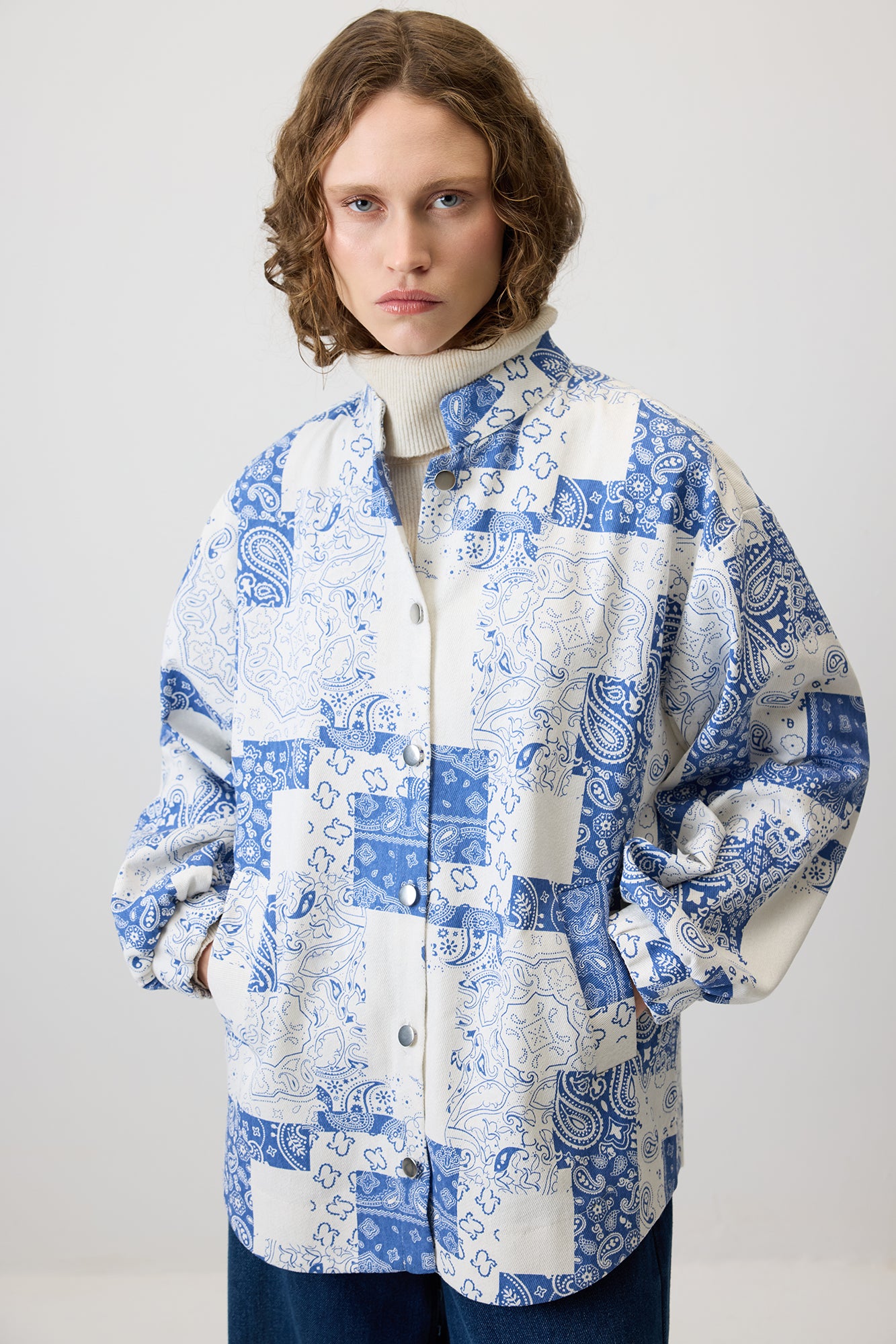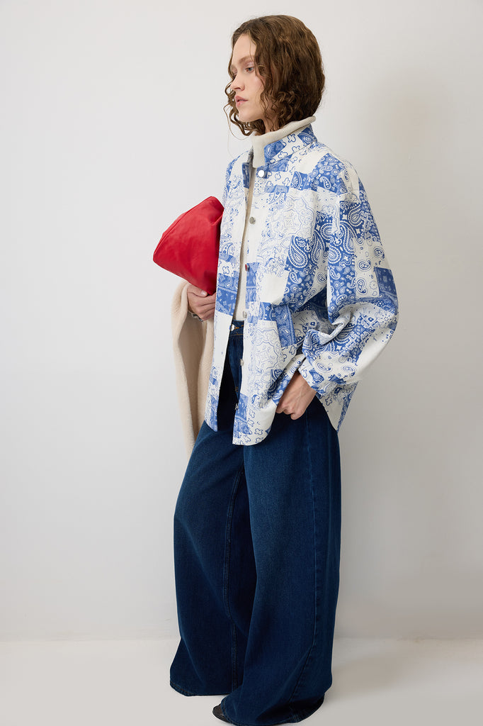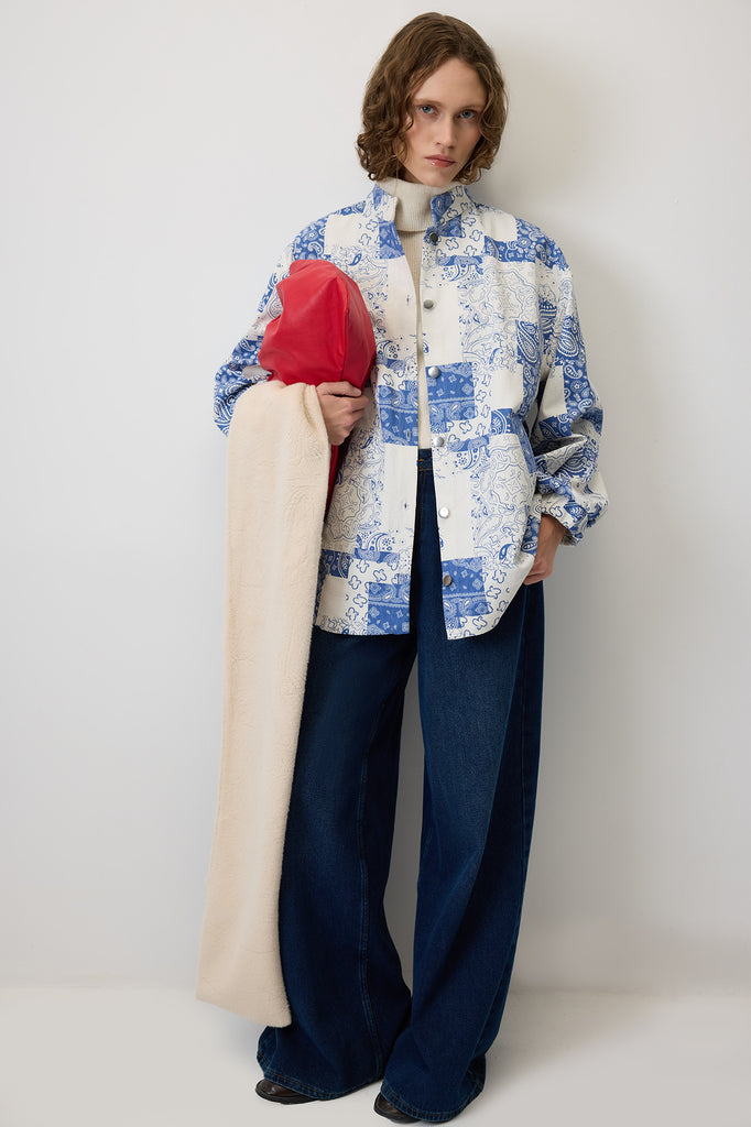 Desenli kumaş. Uzun kollu. Önden düğmeli. Geniş manşetli. Rahat kesim ceket.