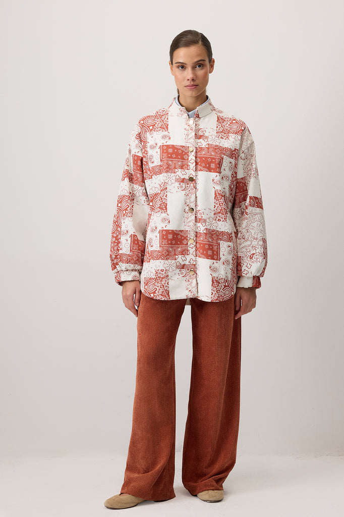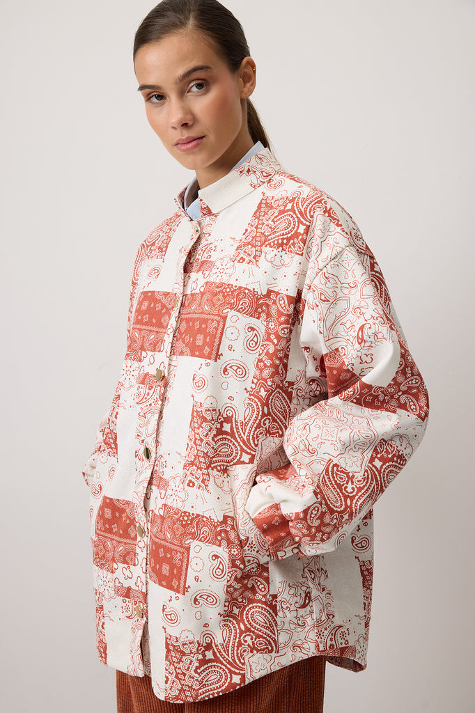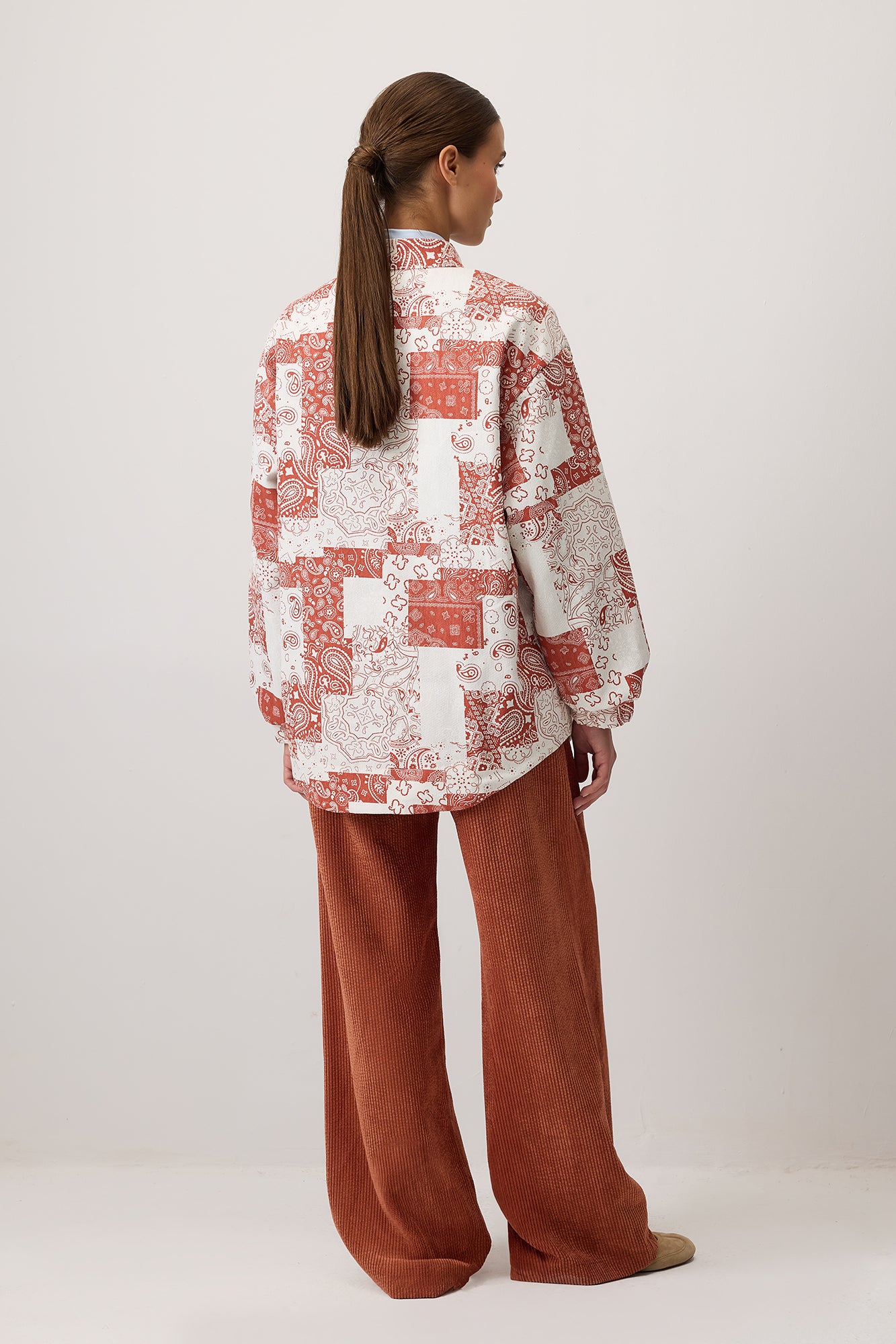 Dik yaka. Uzun kollu. Düşük omuzlu. Desenli. Cepli. Önden düğme kapamalı.