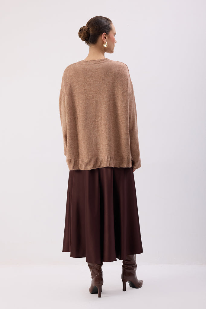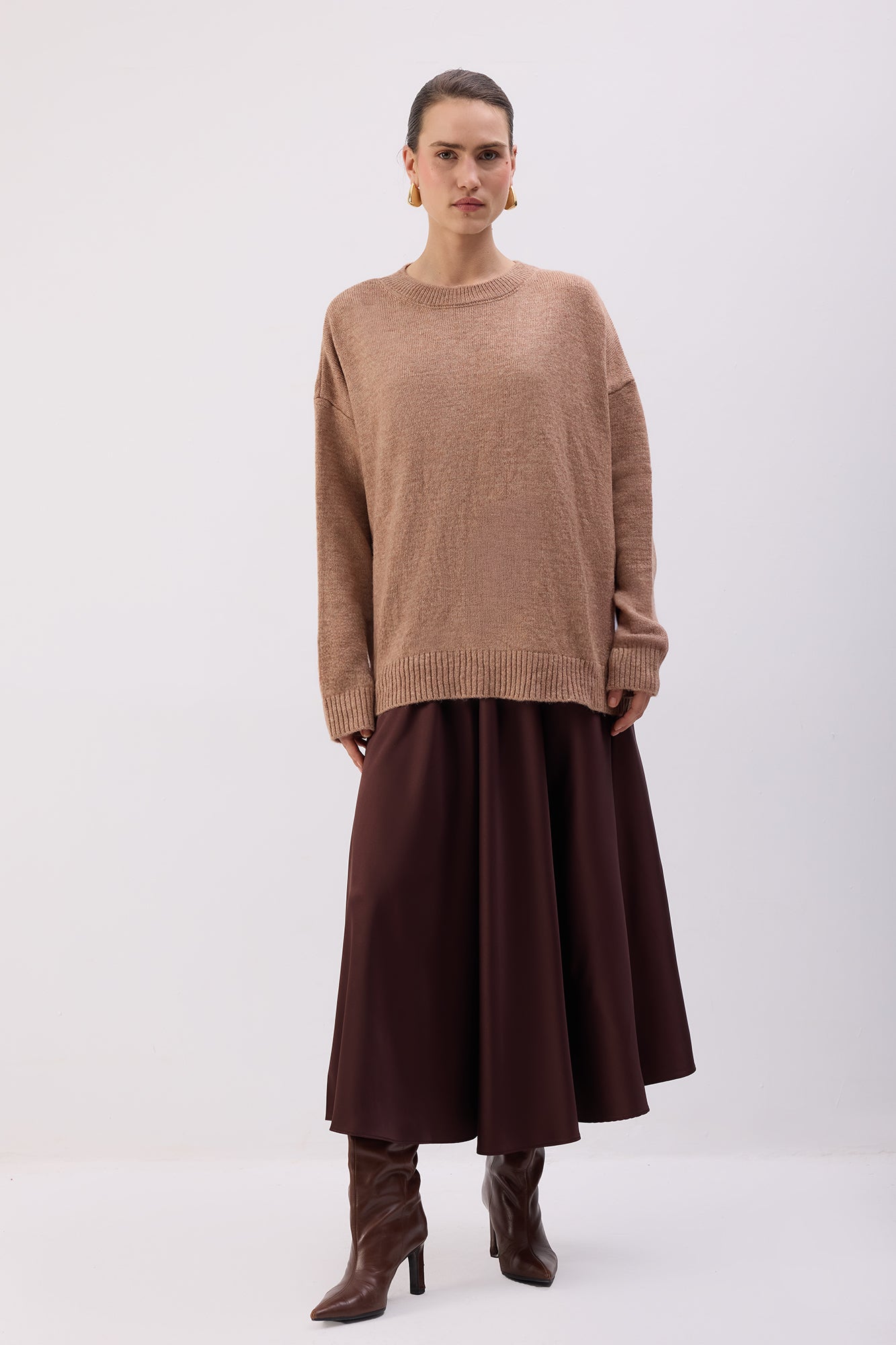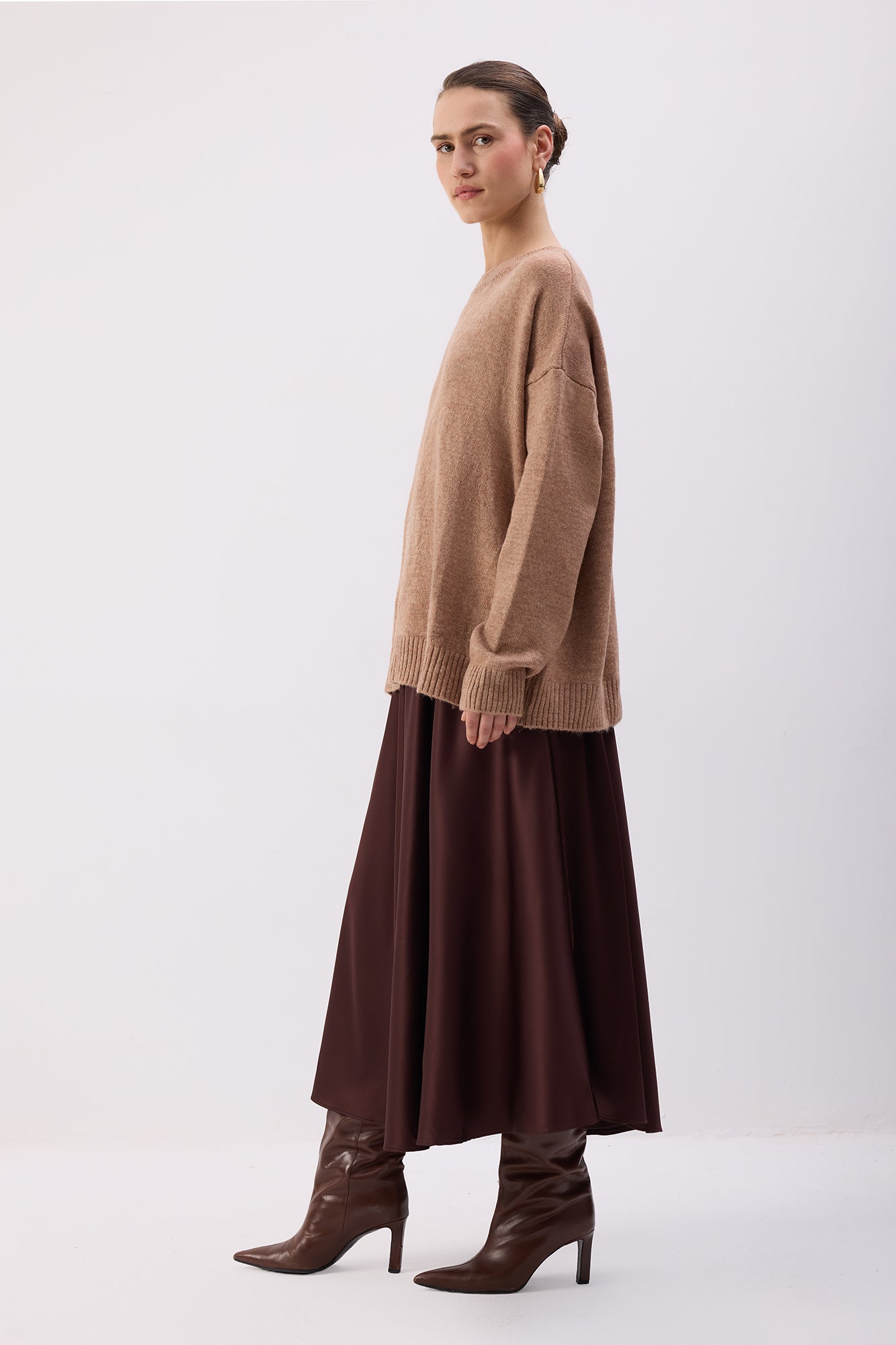 Akıcı saten doku. Geniş kesim. Midi. Yüksek bel saten etek.