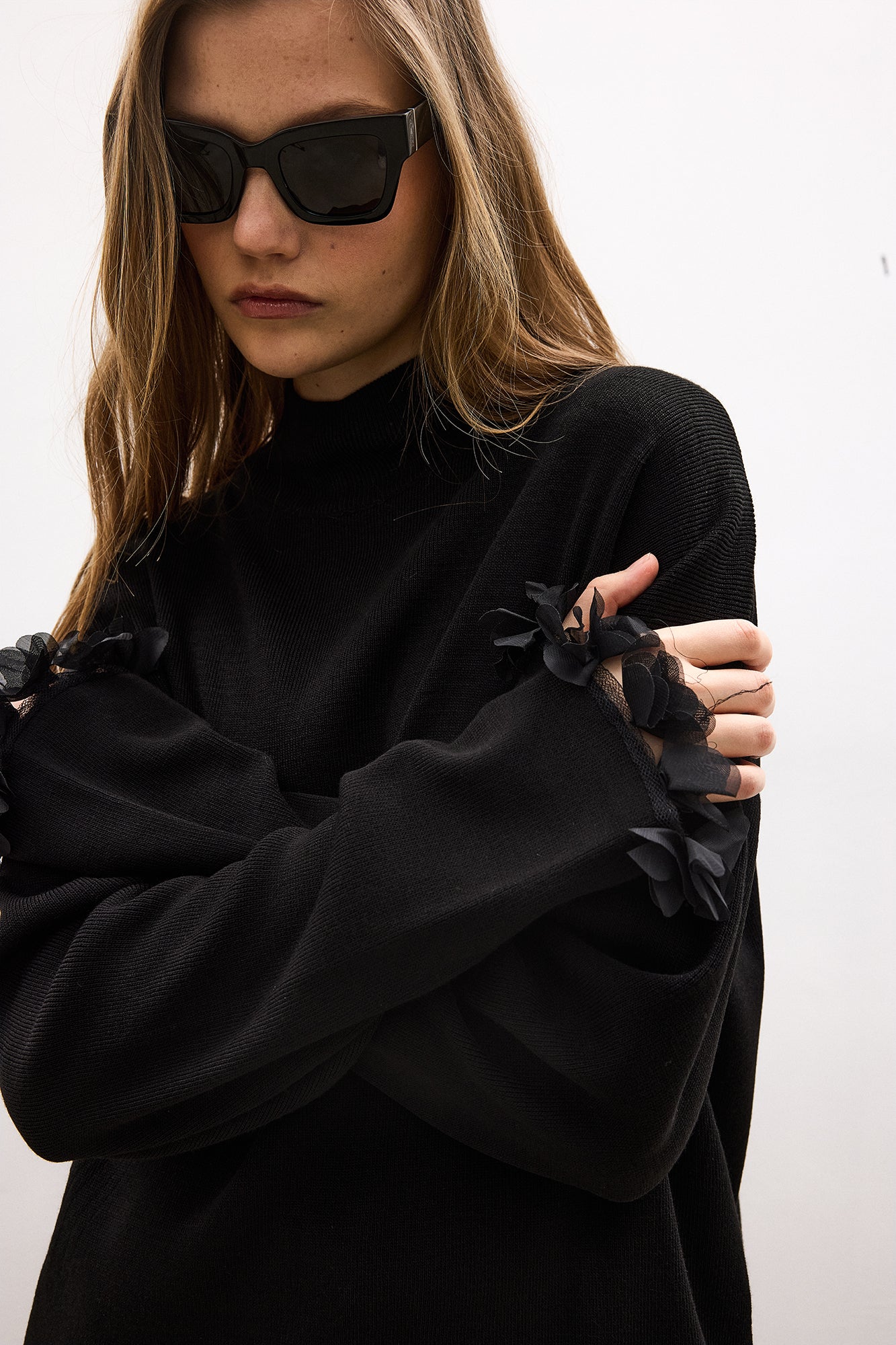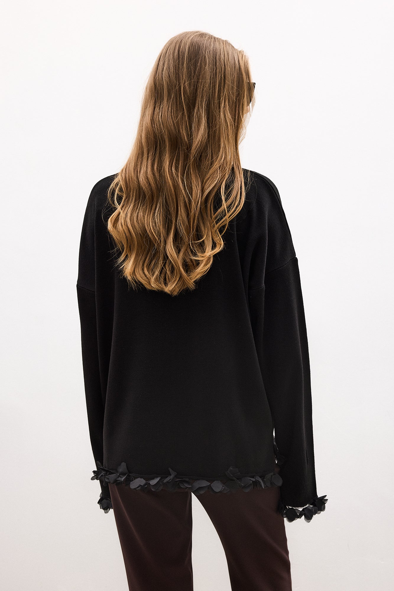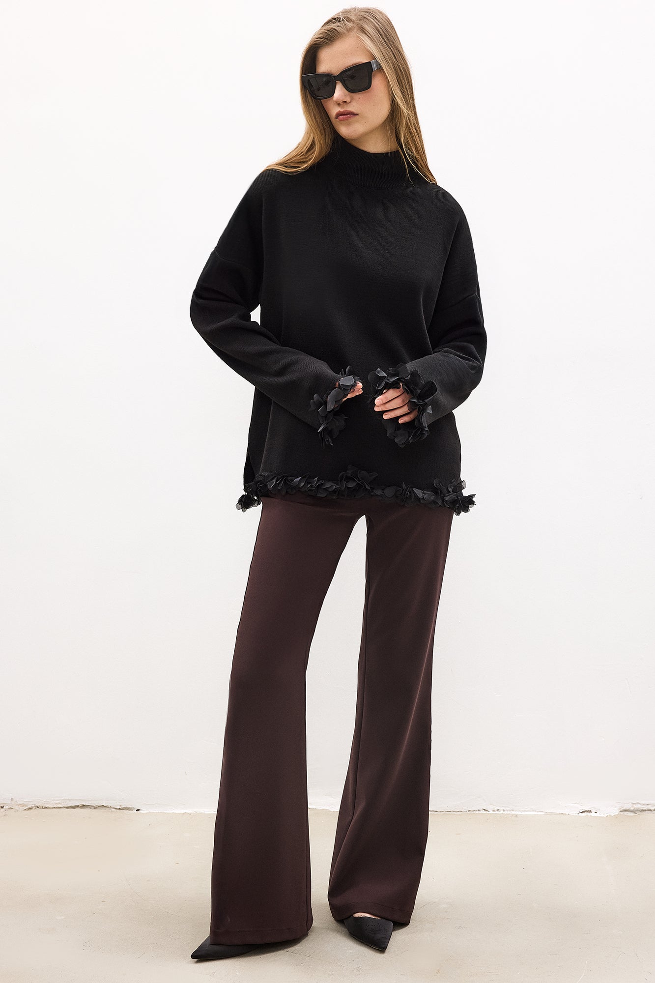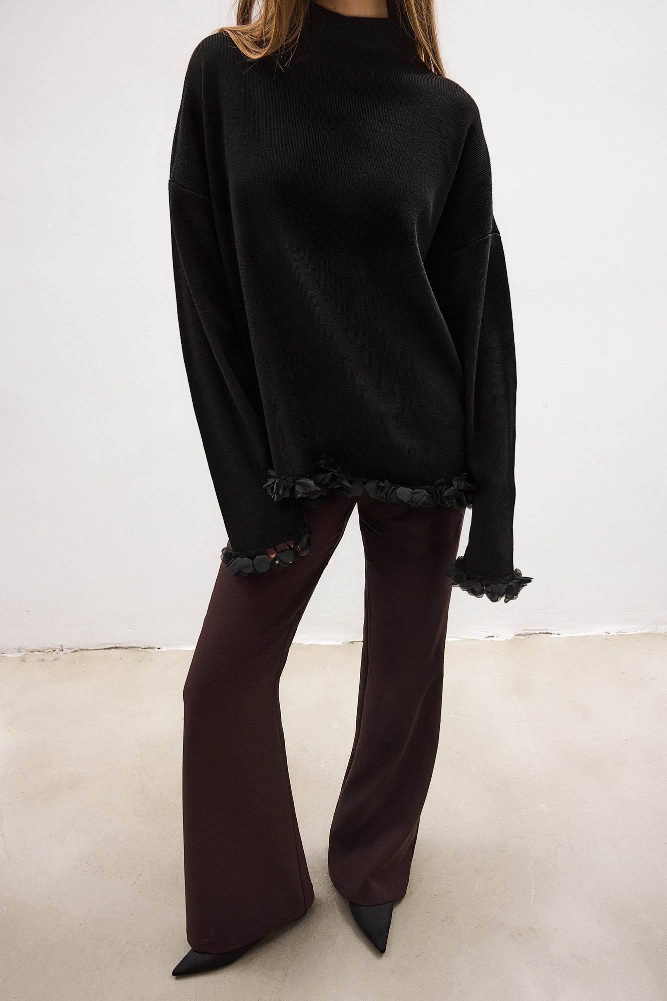 Dik yaka. Uzun kollu. Şifon püsküllü. Triko kazak.