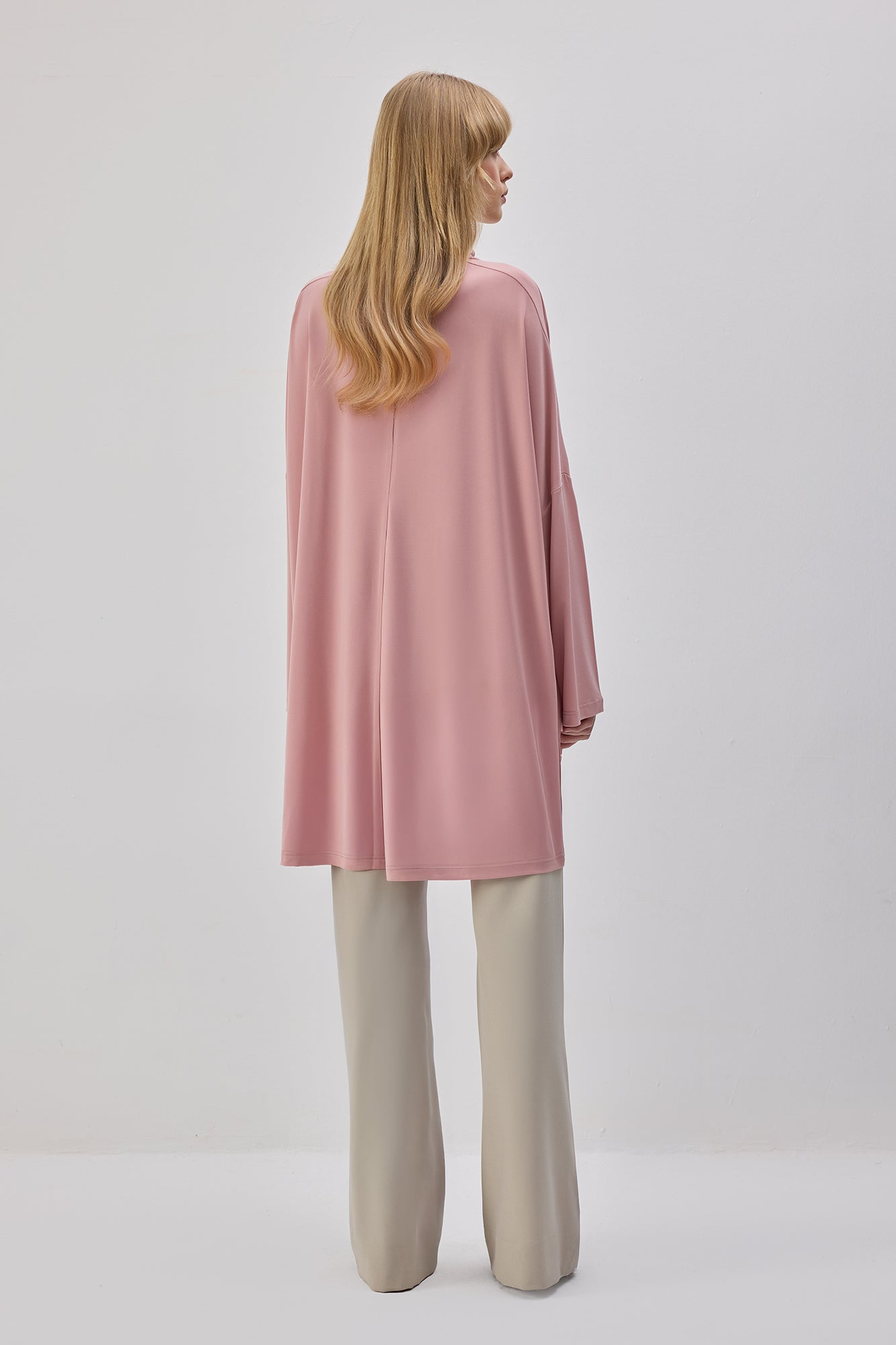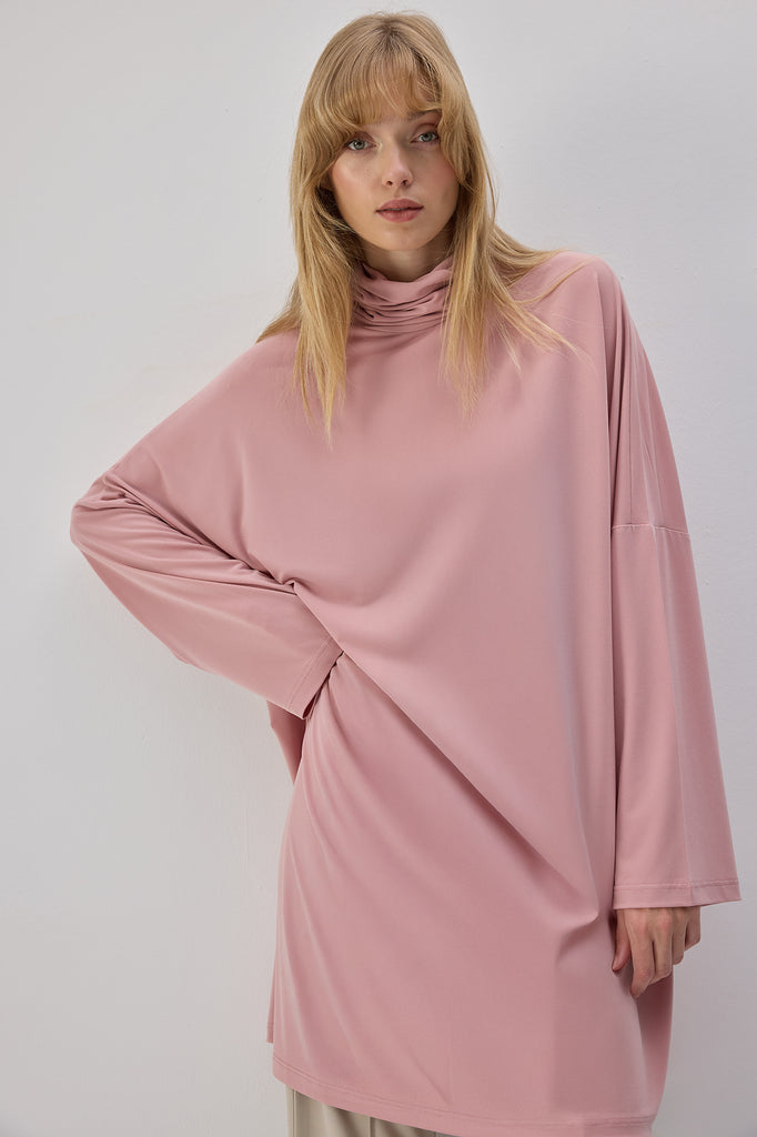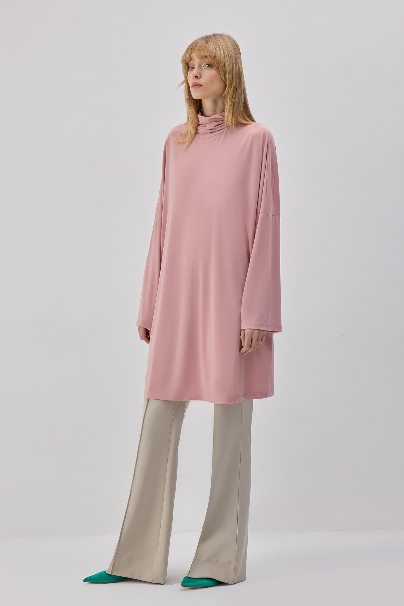 Akıcı ve hafif dokulu. T kollu. Drapeli balıkçı yaka tunik.