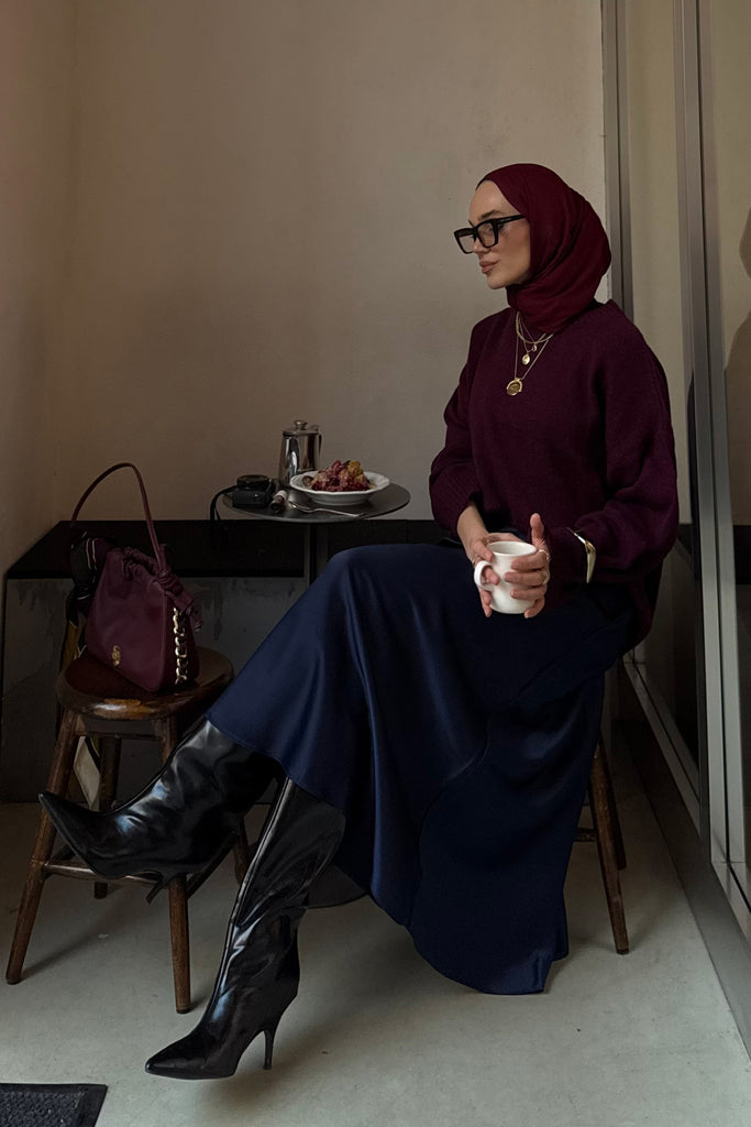 Bisiklet yaka. Uzun kollu. Düşük omuzlu. Yırtmaç detaylı. Oversize tunik.