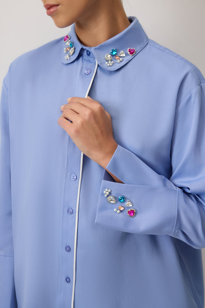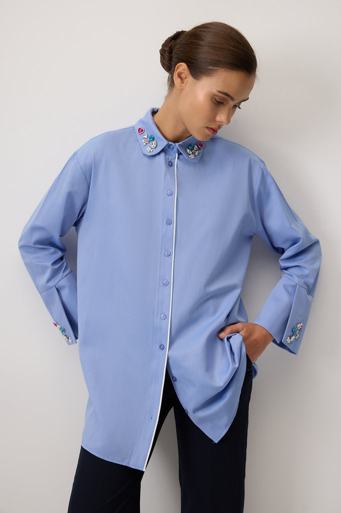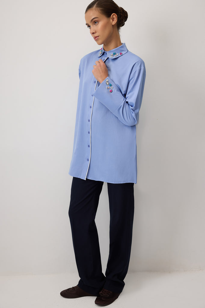 Klasik yaka. Yakası taş işlemeli. Uzun kollu. Geniş manşetli. Önden düğme kapamalı.