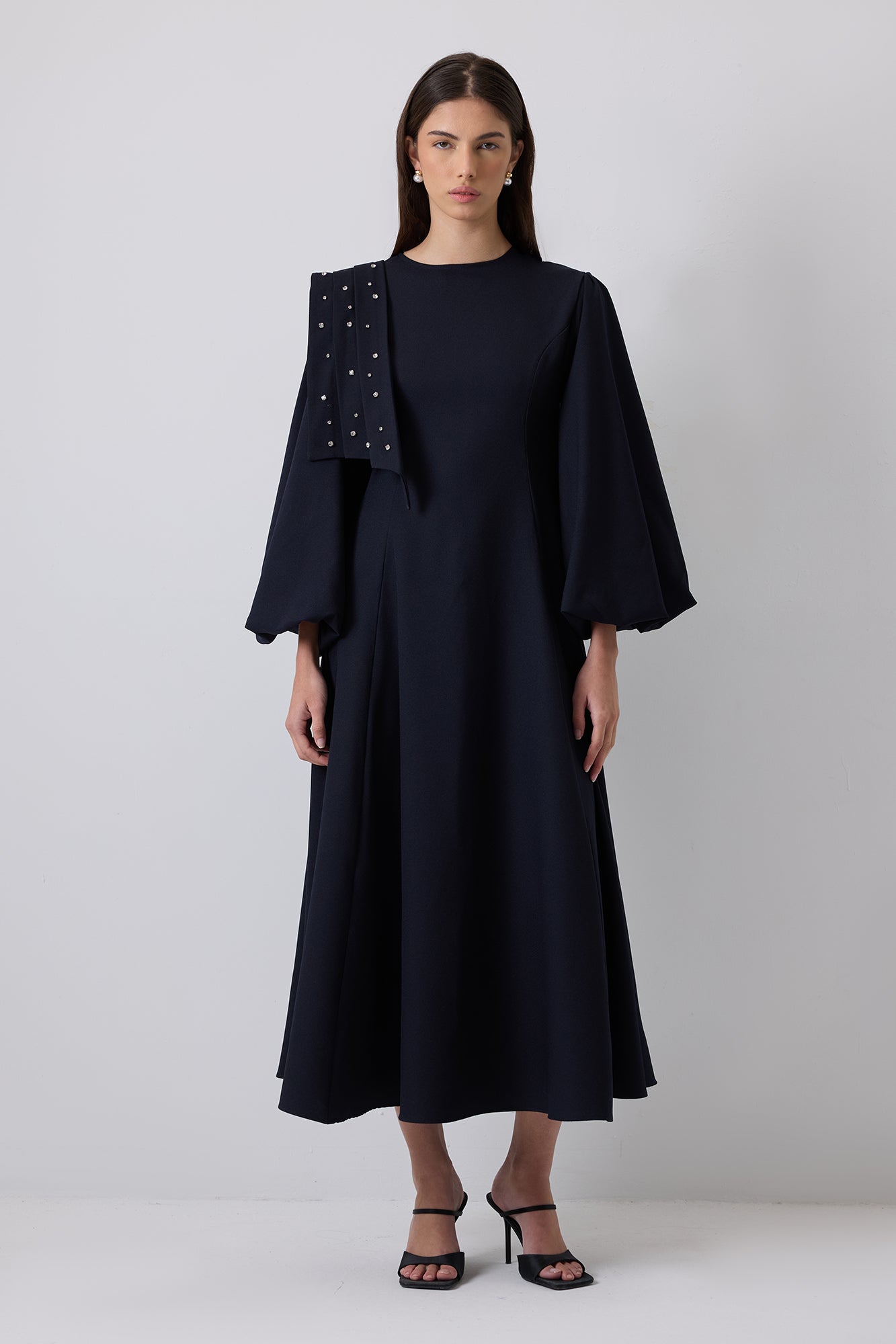 TAŞ İŞLEMELİ BALON KOLLU ELBİSE