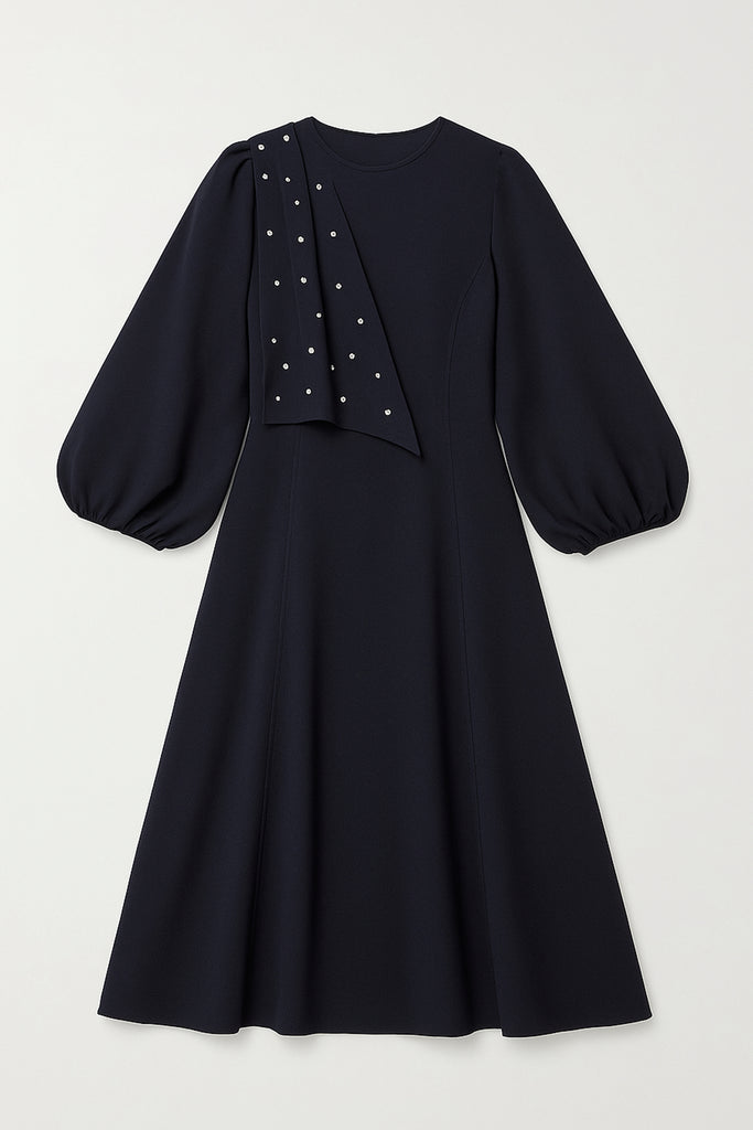 Bisiklet yaka. Uzun balon kollu. Taş işleme detaylı. Arka gizli fermuar kapama.