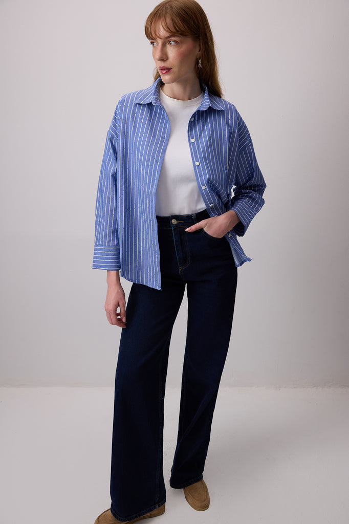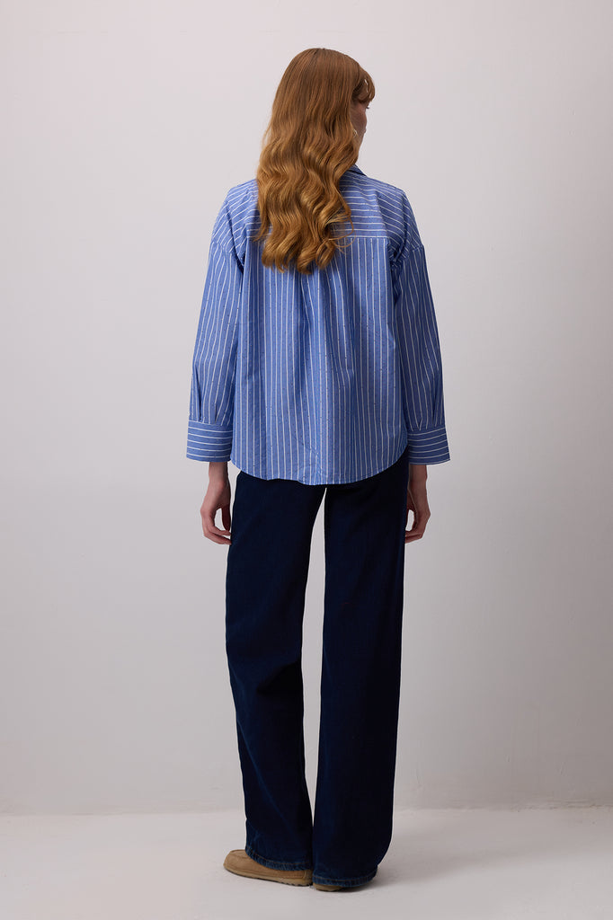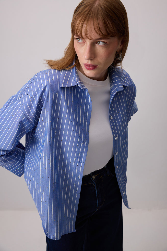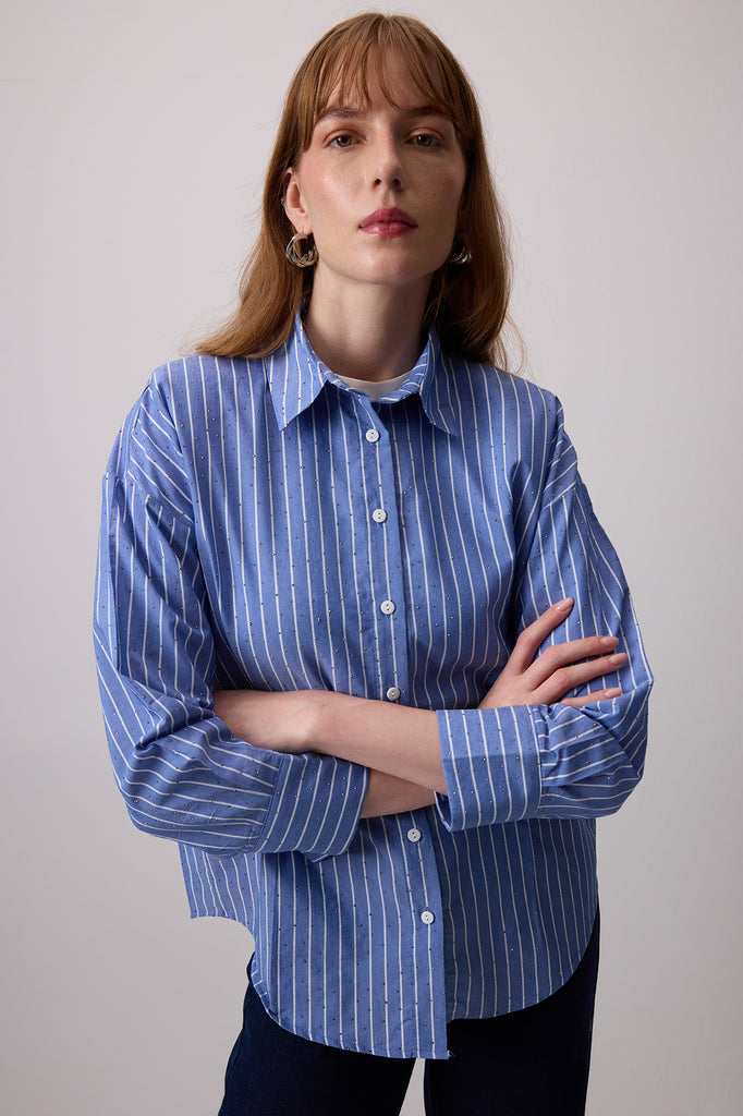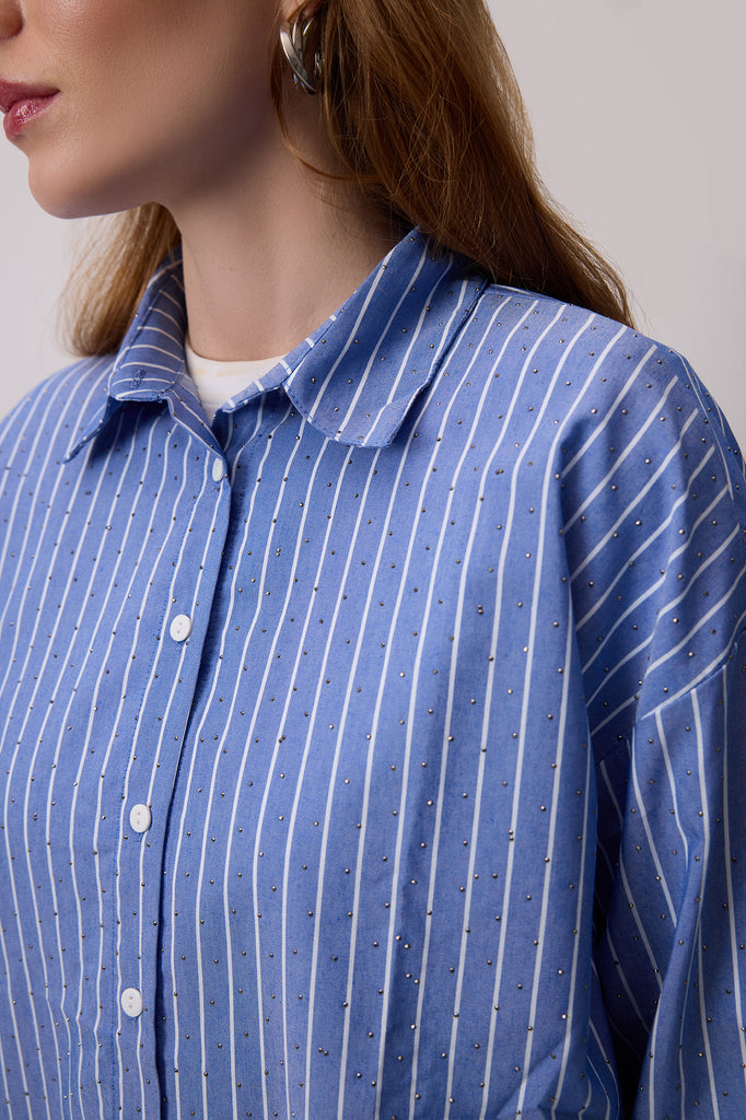 TAŞ İŞLEMELİ ÇİZGİLİ POPLİN GÖMLEK