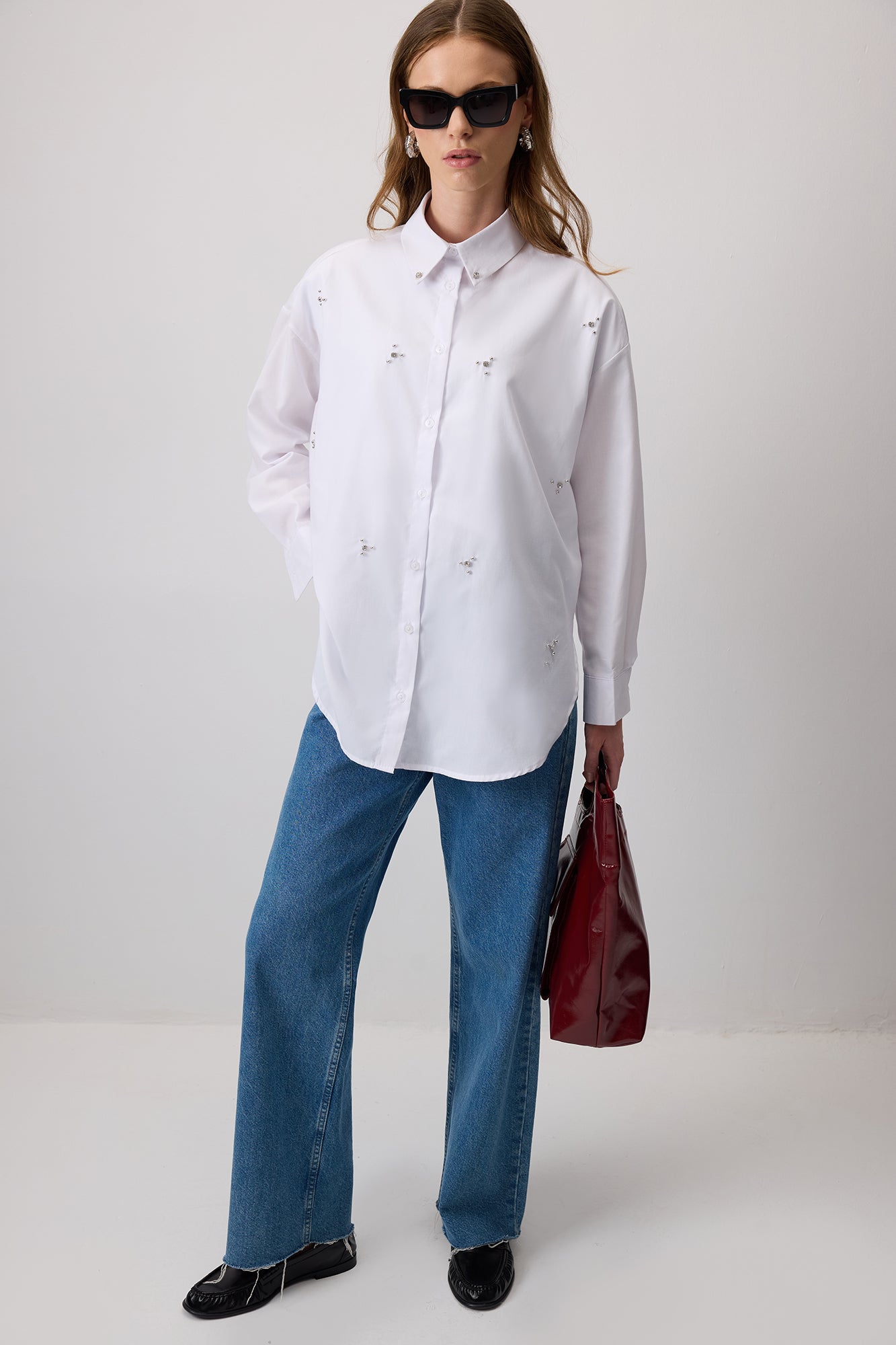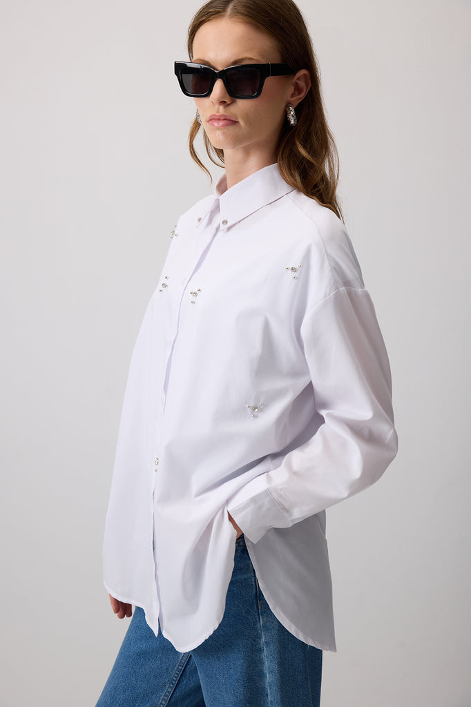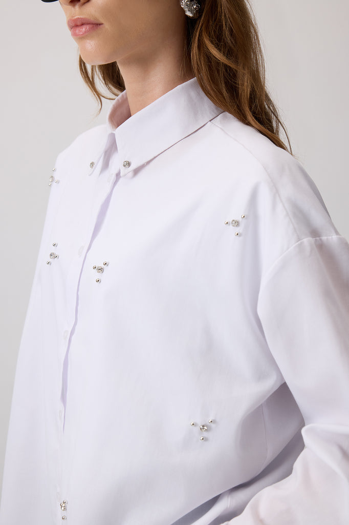 Klasik yaka. Uzun kollu ve manşetleri düğme kapamalı. Taş işlemeli. Önden düğme kapamalı.