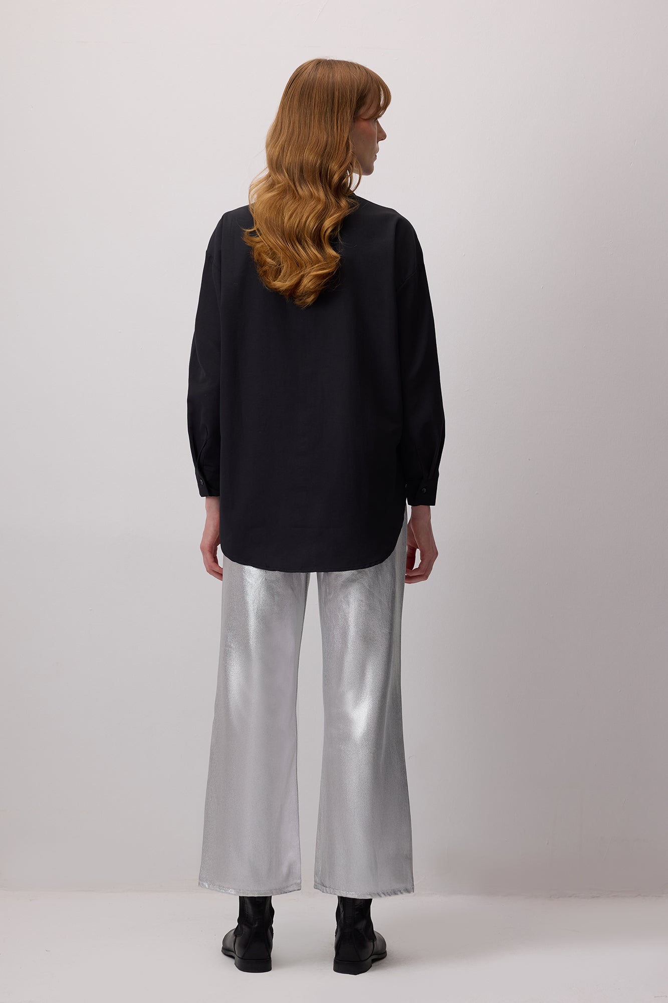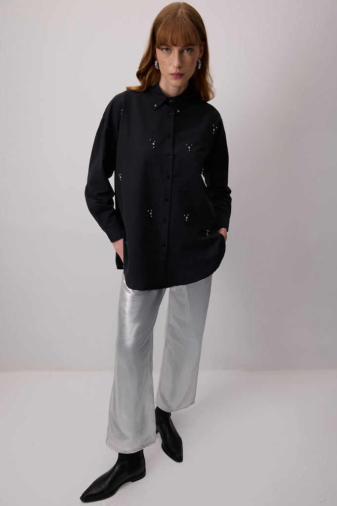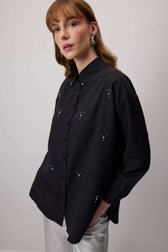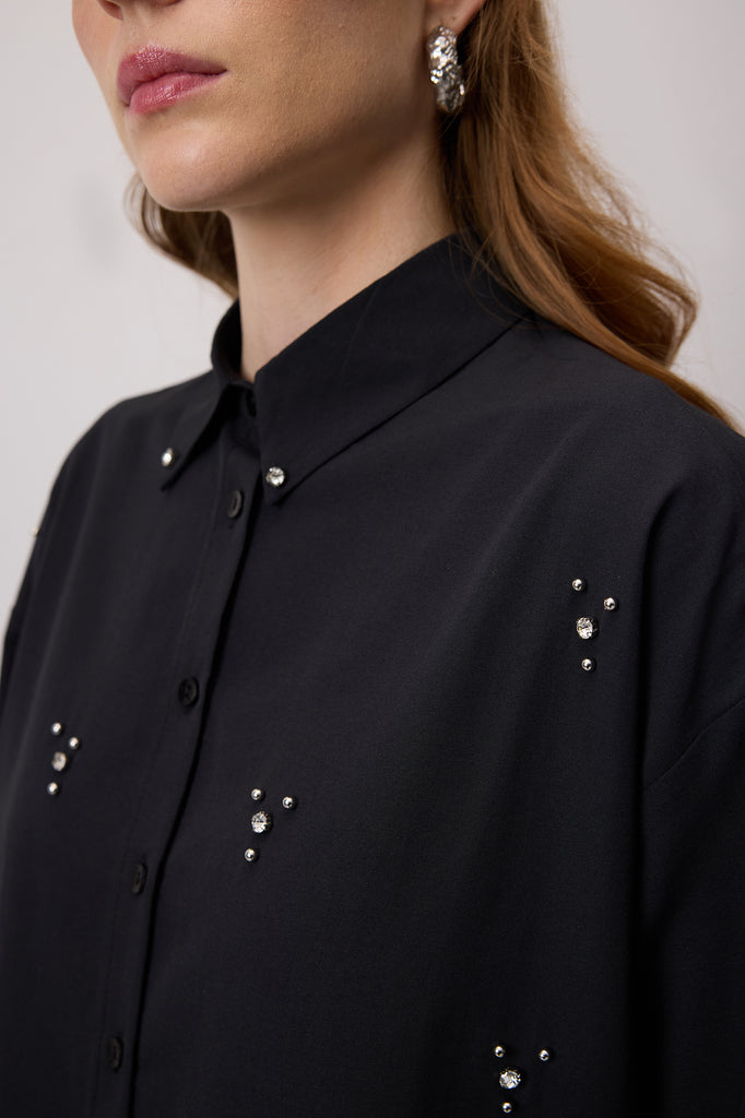 Klasik yaka. Uzun kollu ve manşetleri düğme kapamalı. Taş işlemeli. Önden düğme kapamalı.