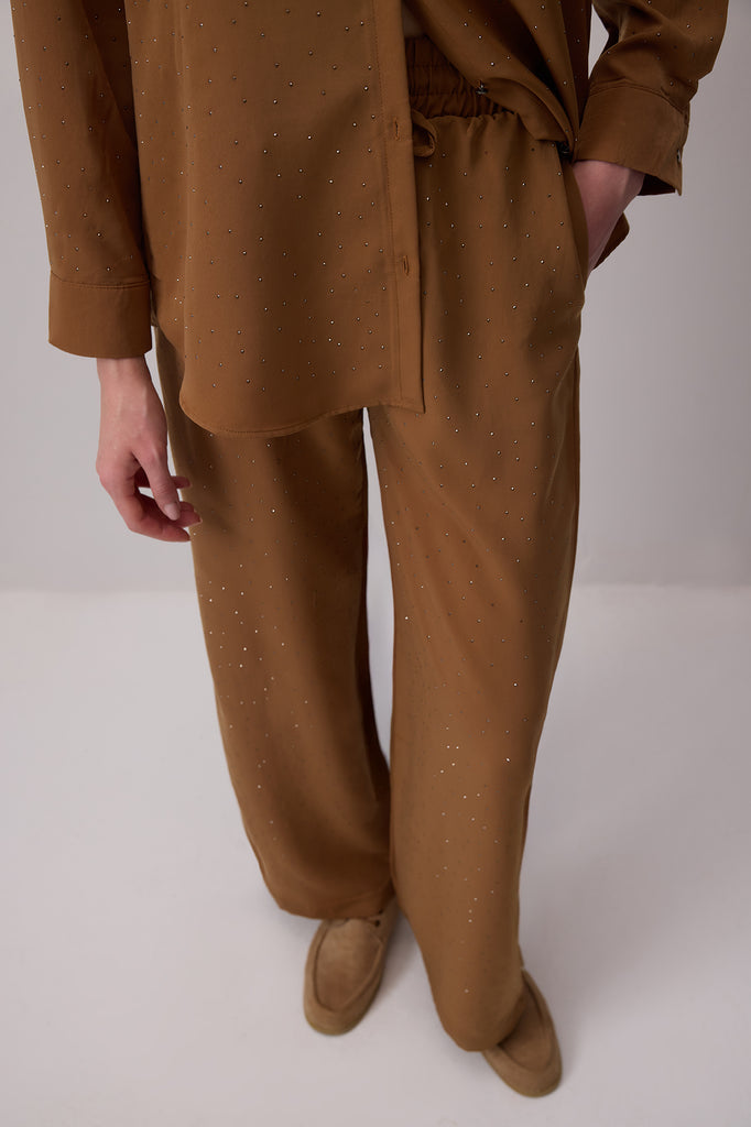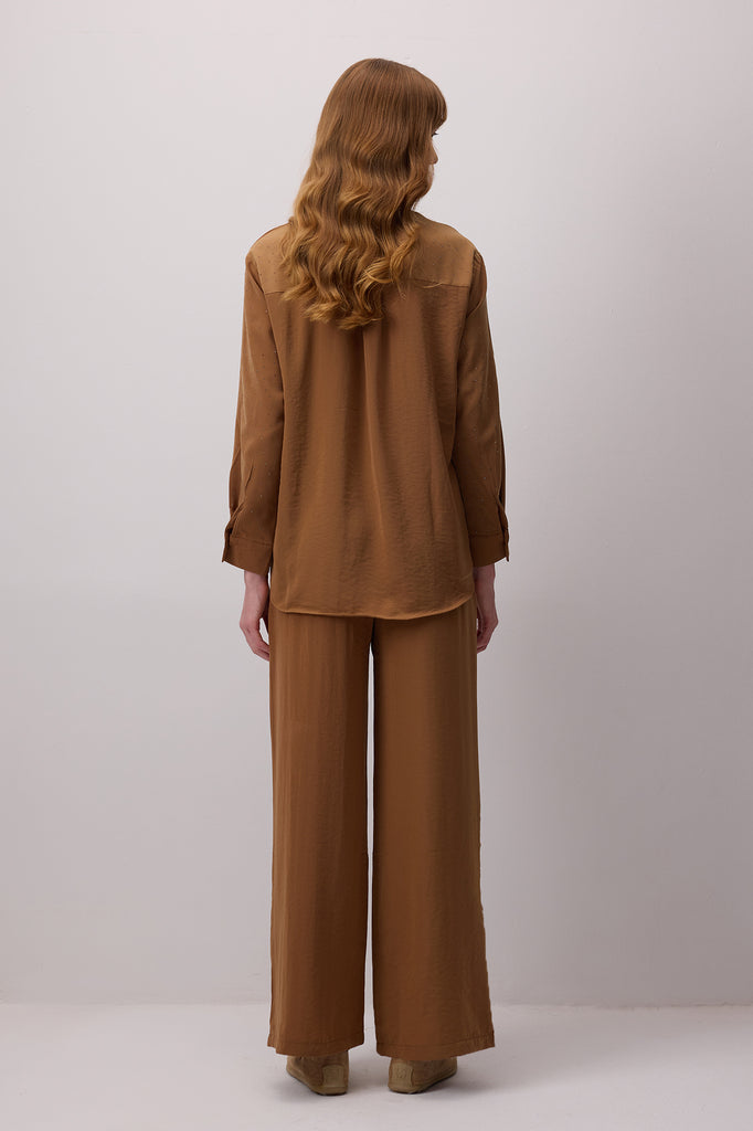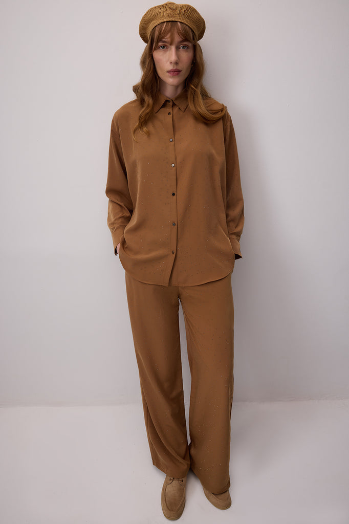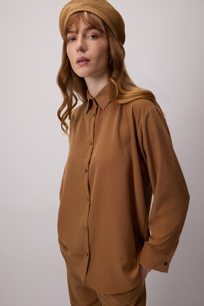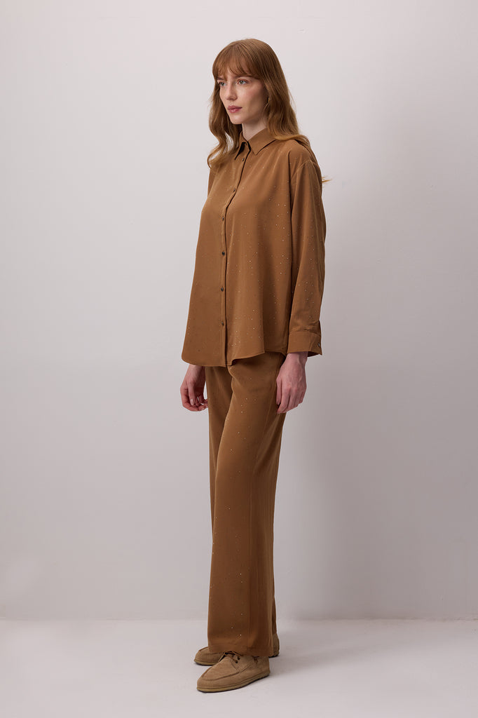 Klasik yaka. Uzun kollu. Manşetleri düğme kapamalı. Taş işlemeli. Önden düğme kapamalı. Gömlek. Elastik bel. Taş işlemeli. Pantolon.