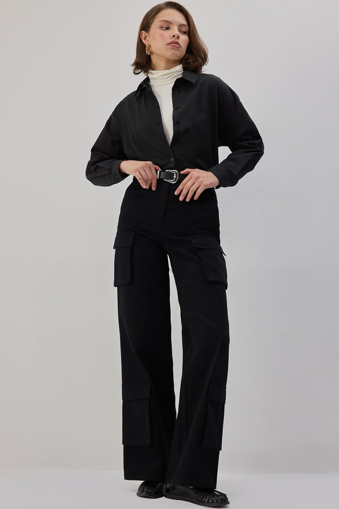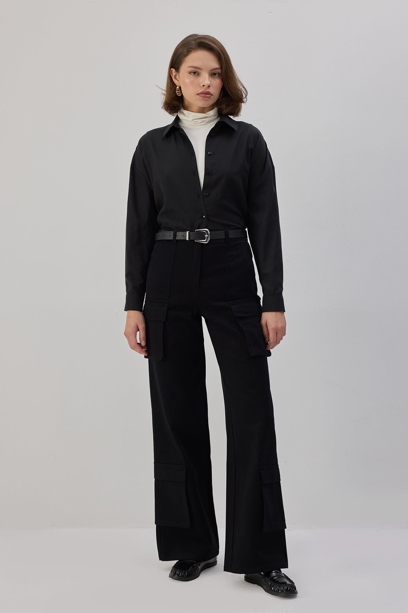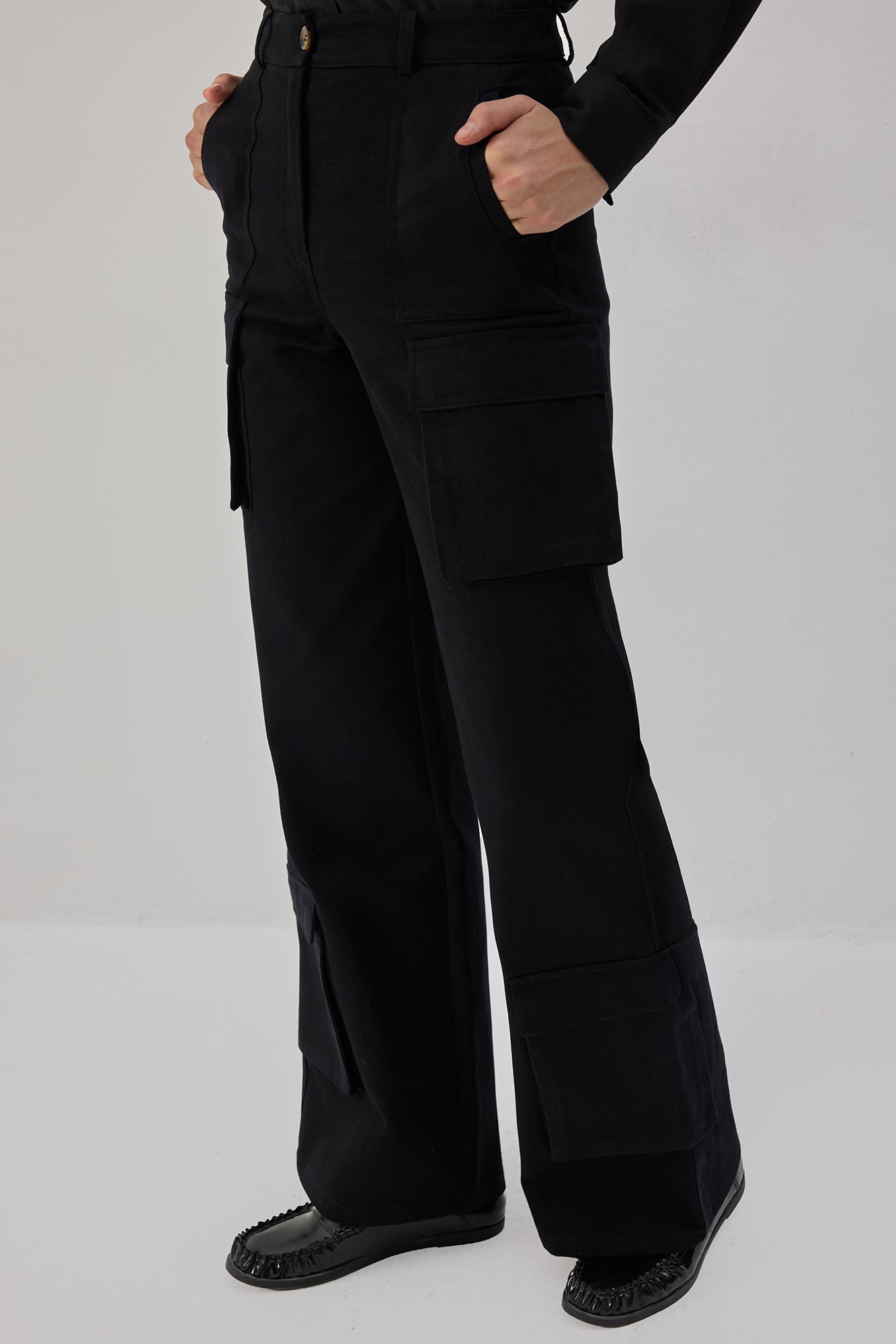 Yüksek bel. Kapaklı kargo cepli. Düğme ve fermuar kapamalı.