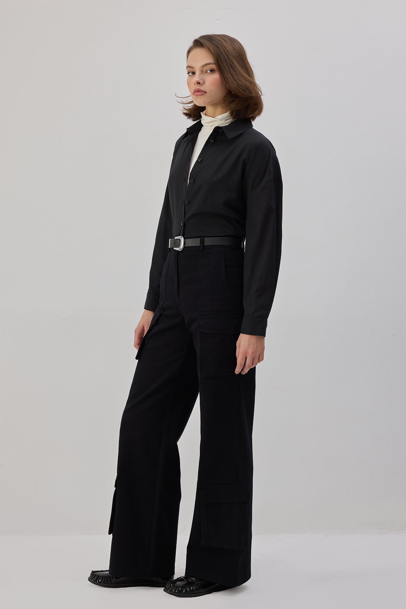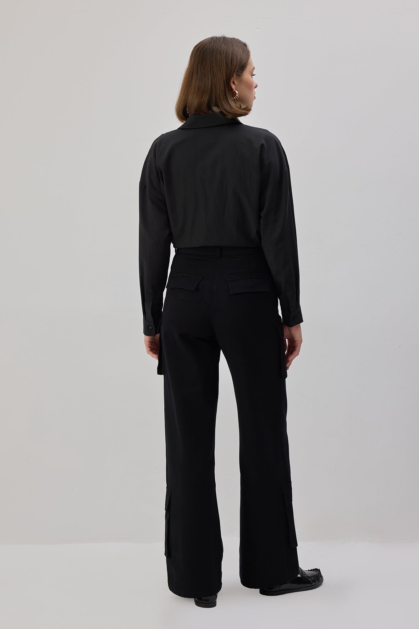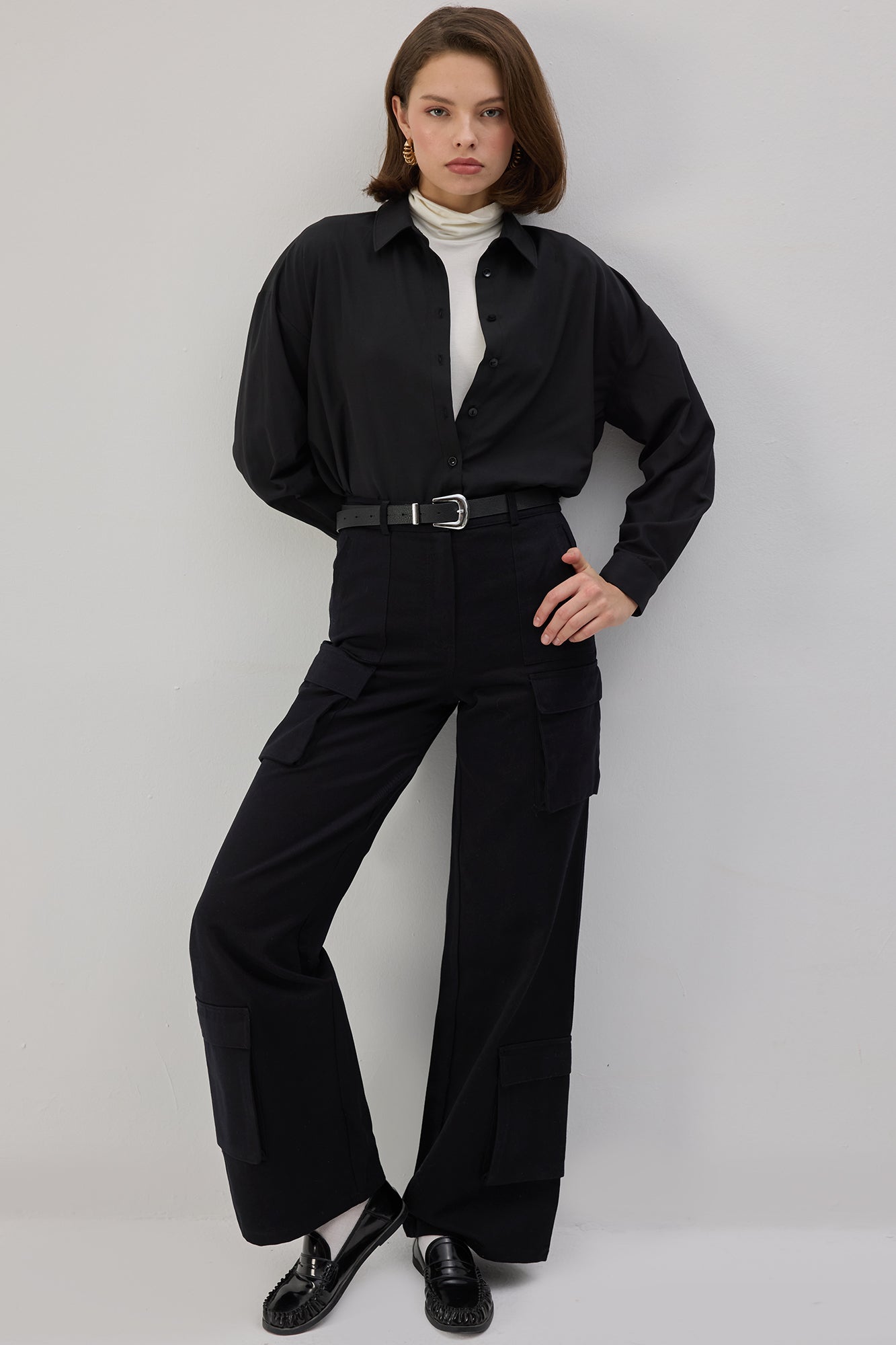 Yüksek bel. Kapaklı kargo cepli. Düğme ve fermuar kapamalı.