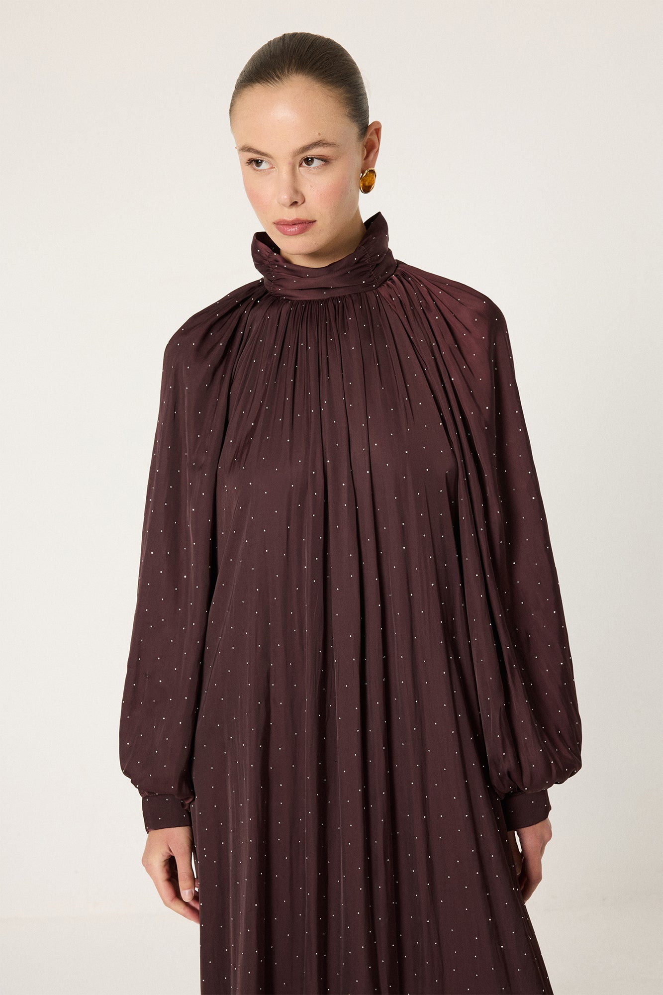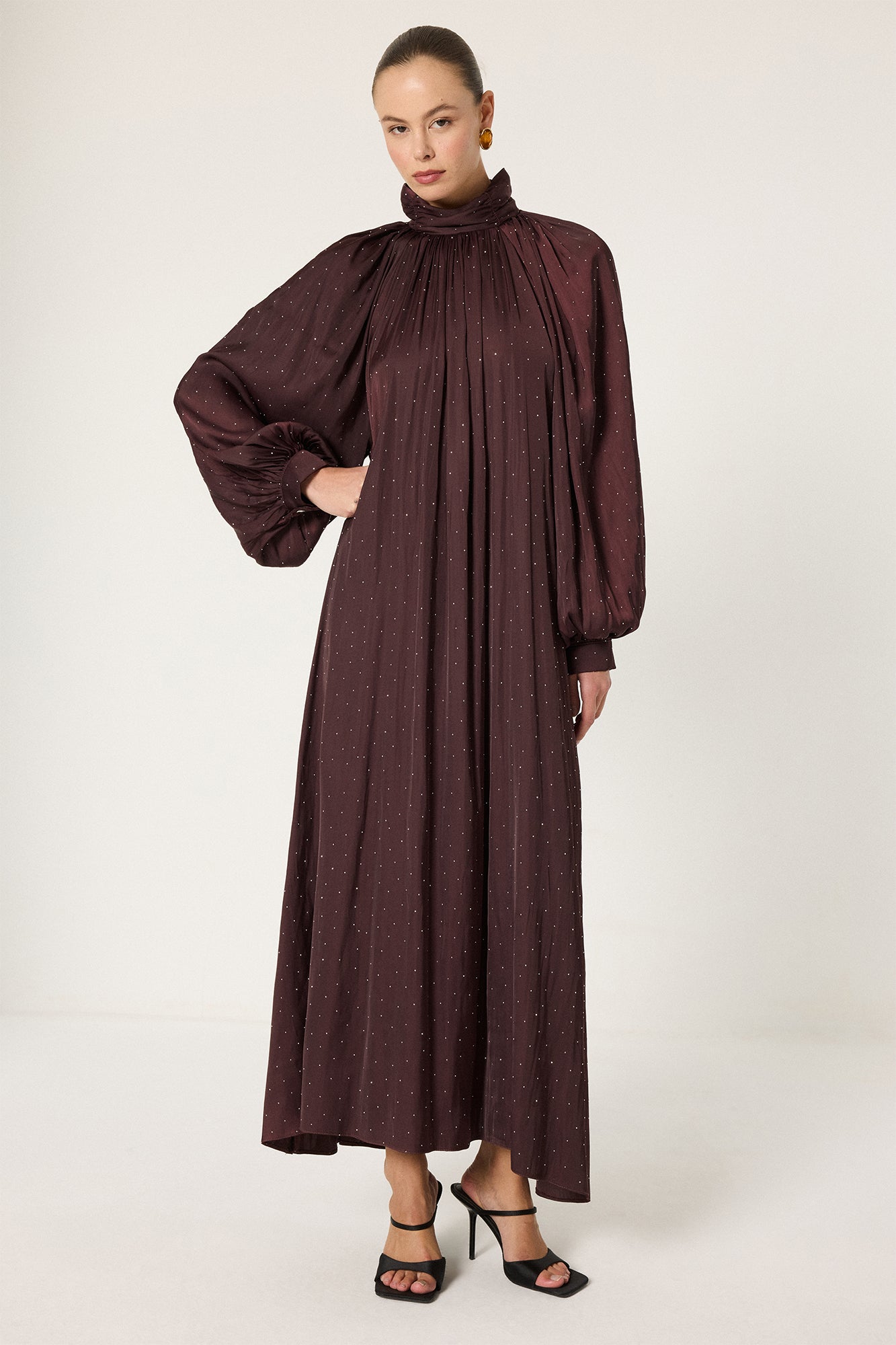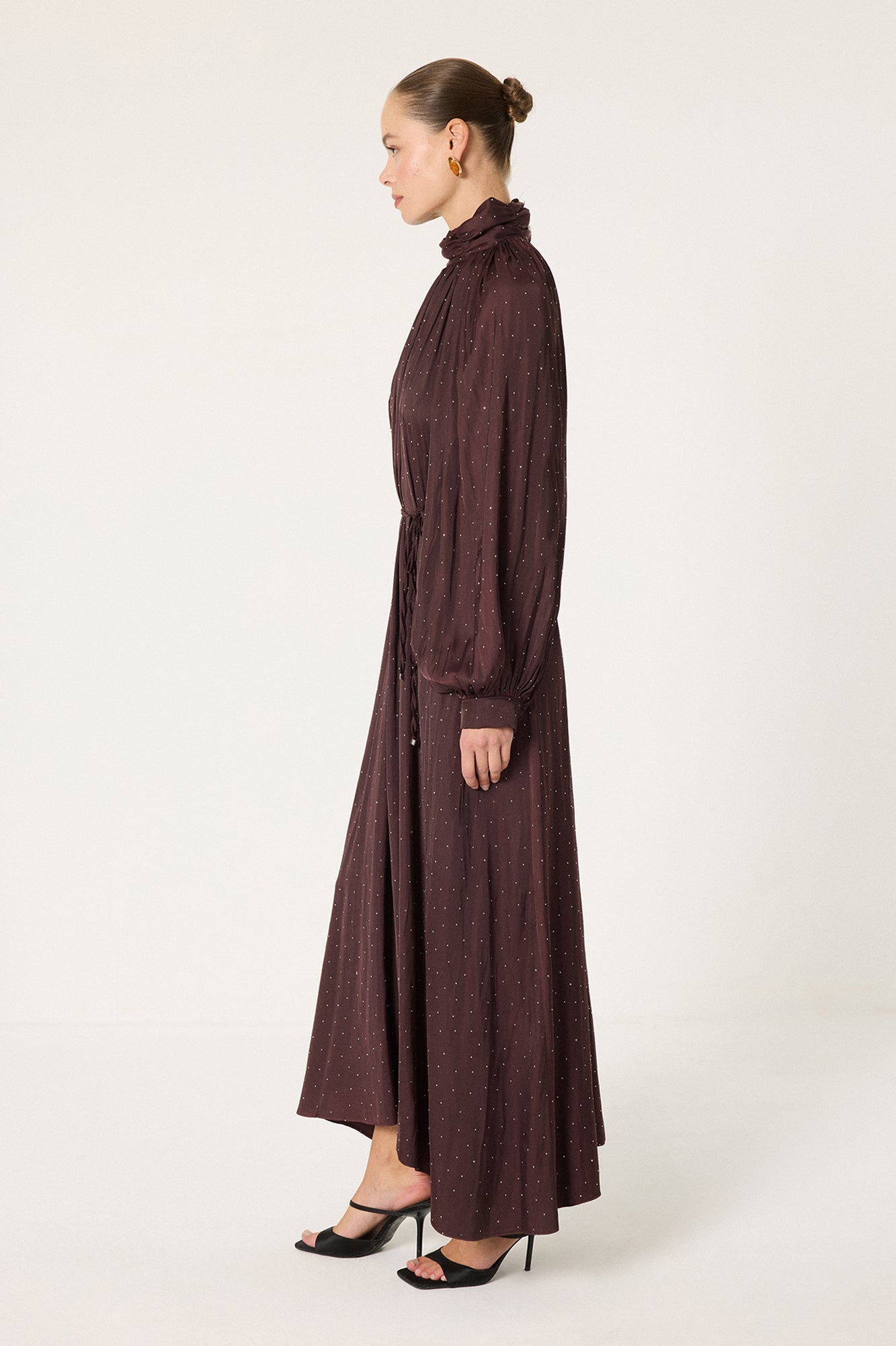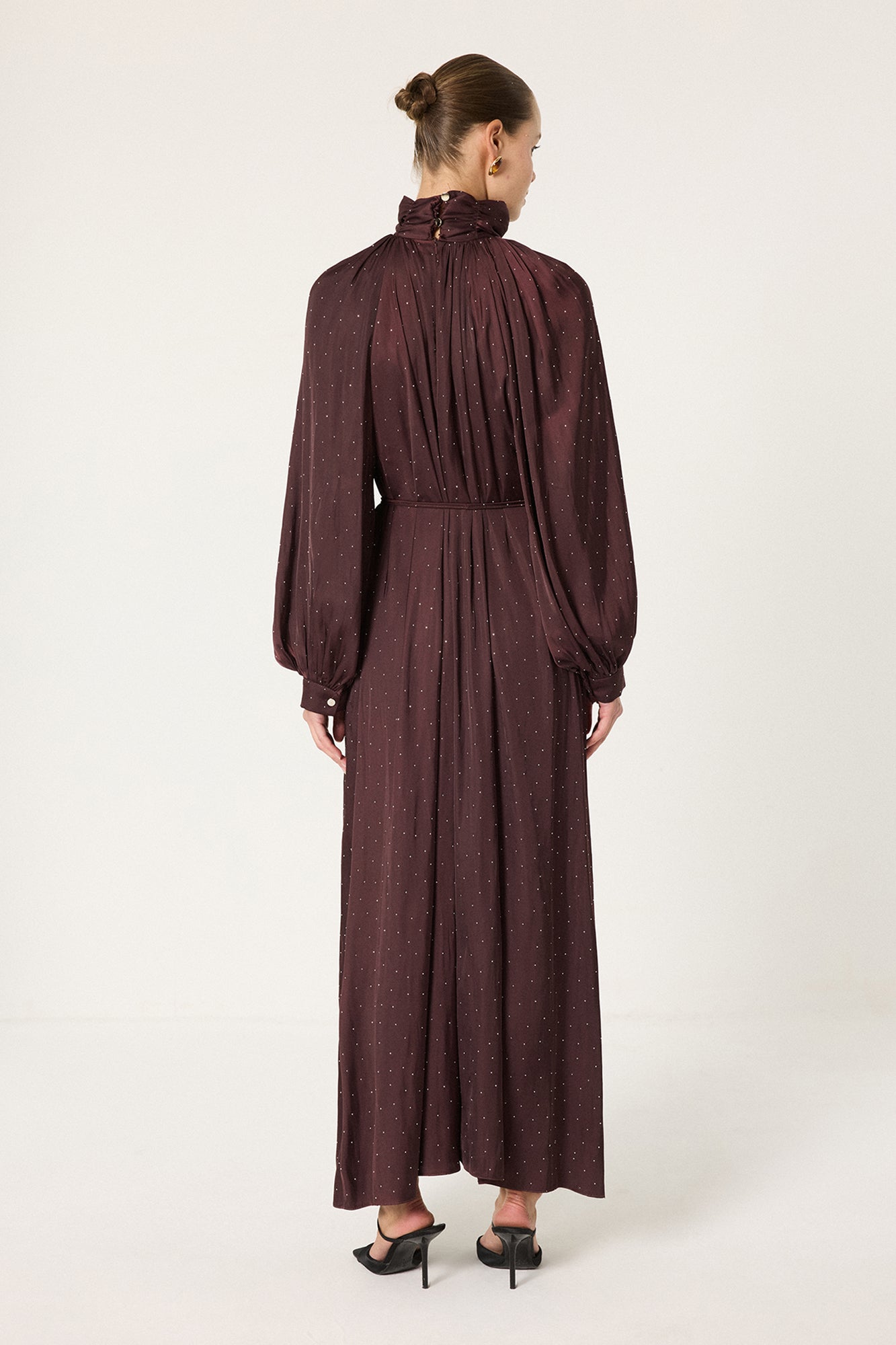Dik yaka. Uzun kollu. Belden bağlamalı ince kuşak detaylı. Maxi boy elbise.