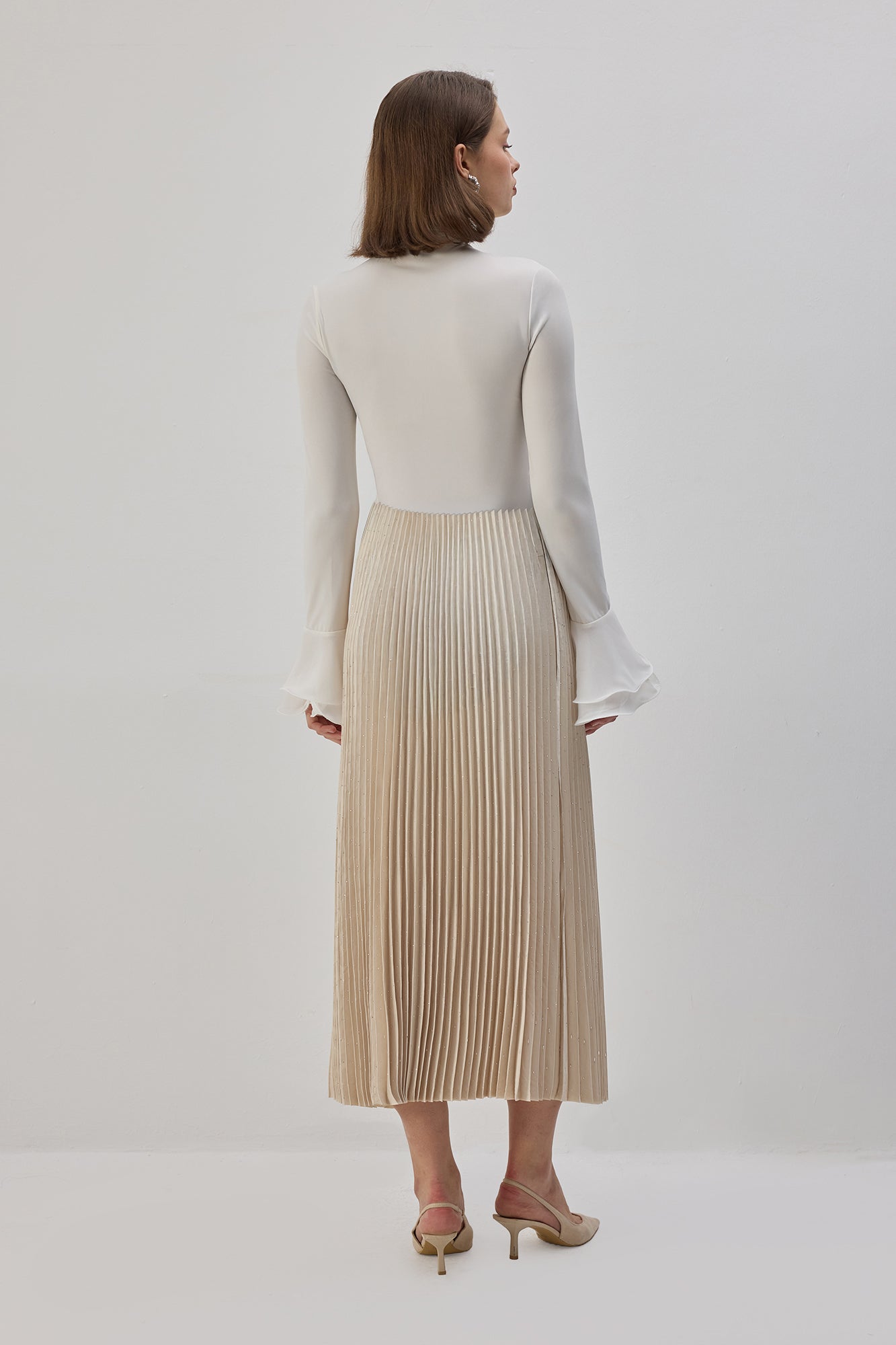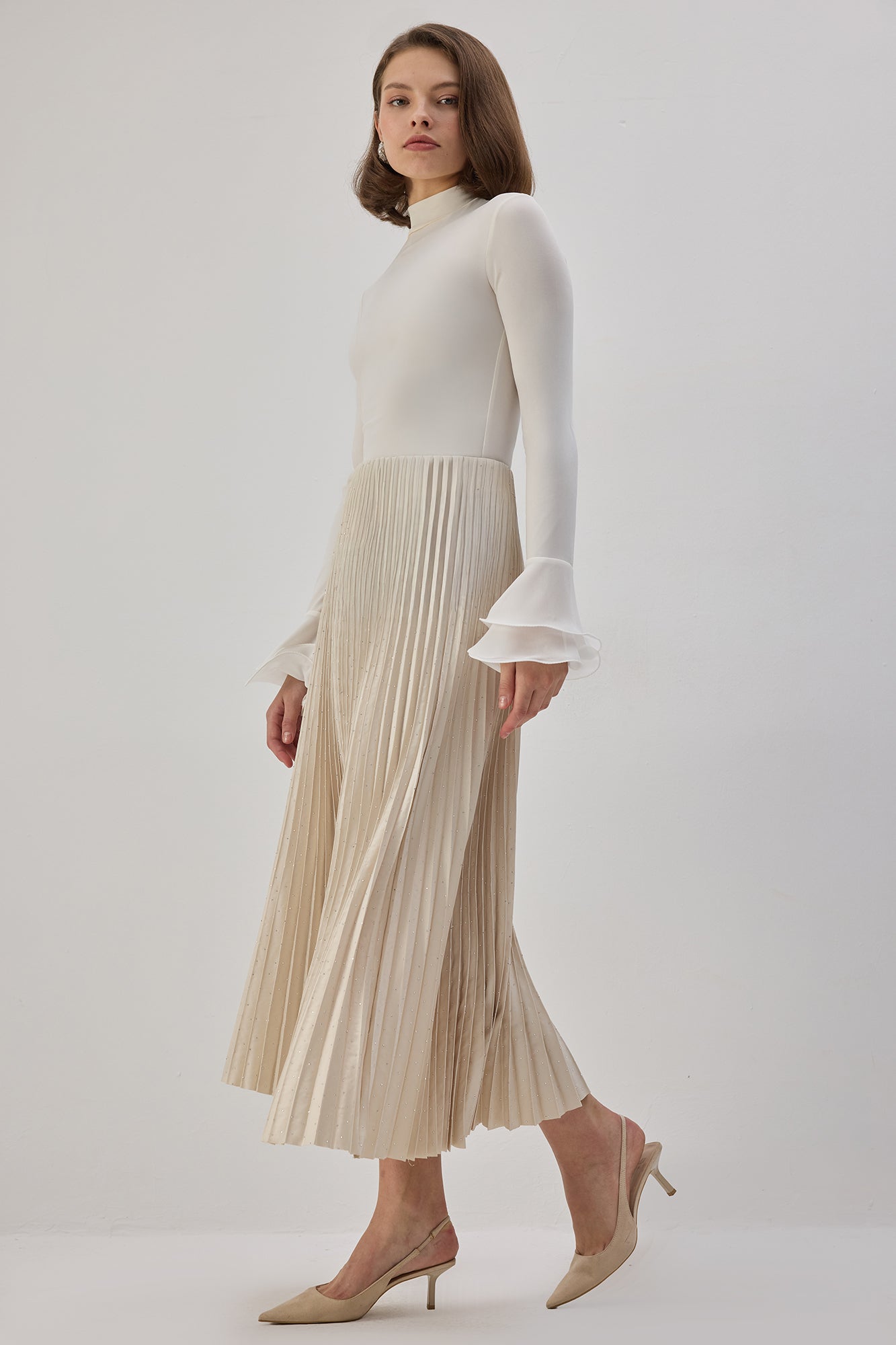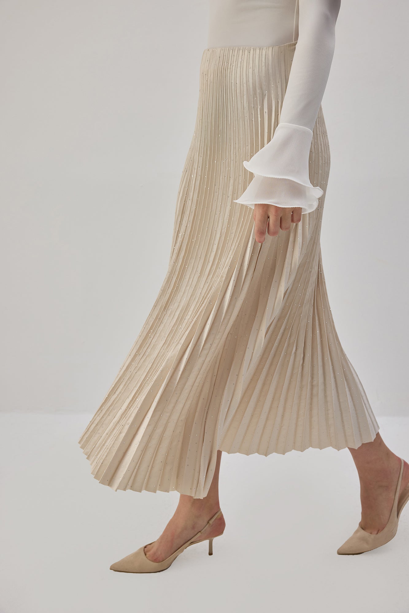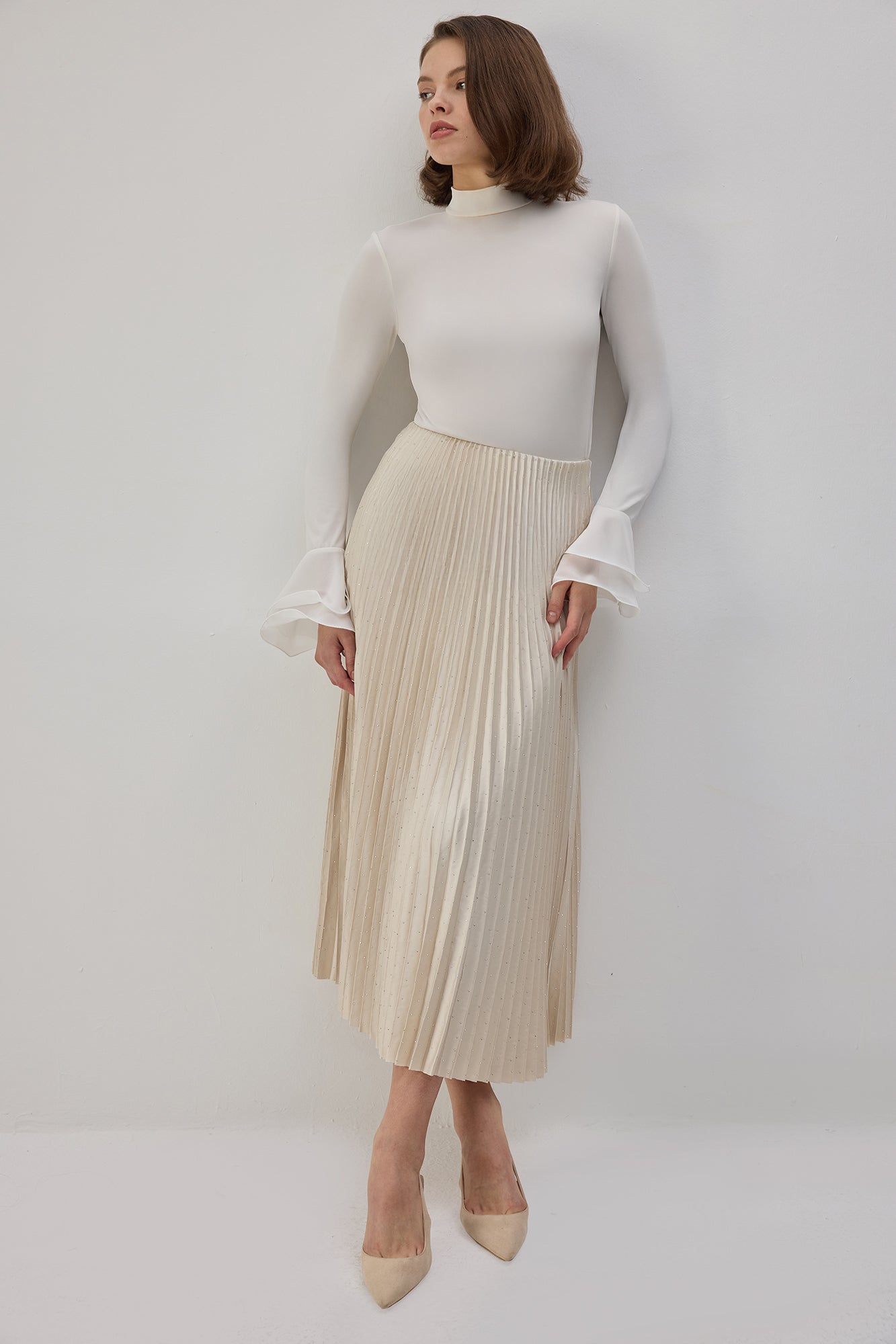 Elastik bel. Taş işlemeli saten yüzey. Pilili. Midi boy.