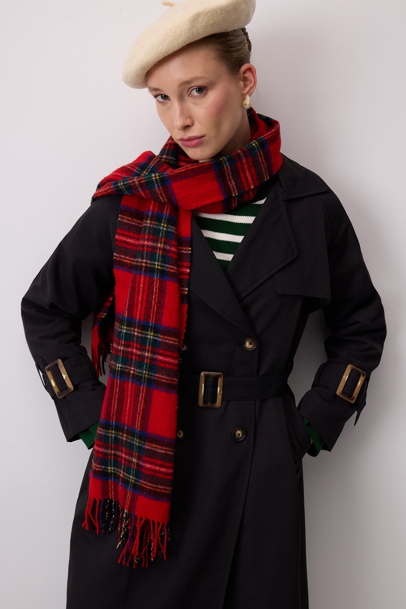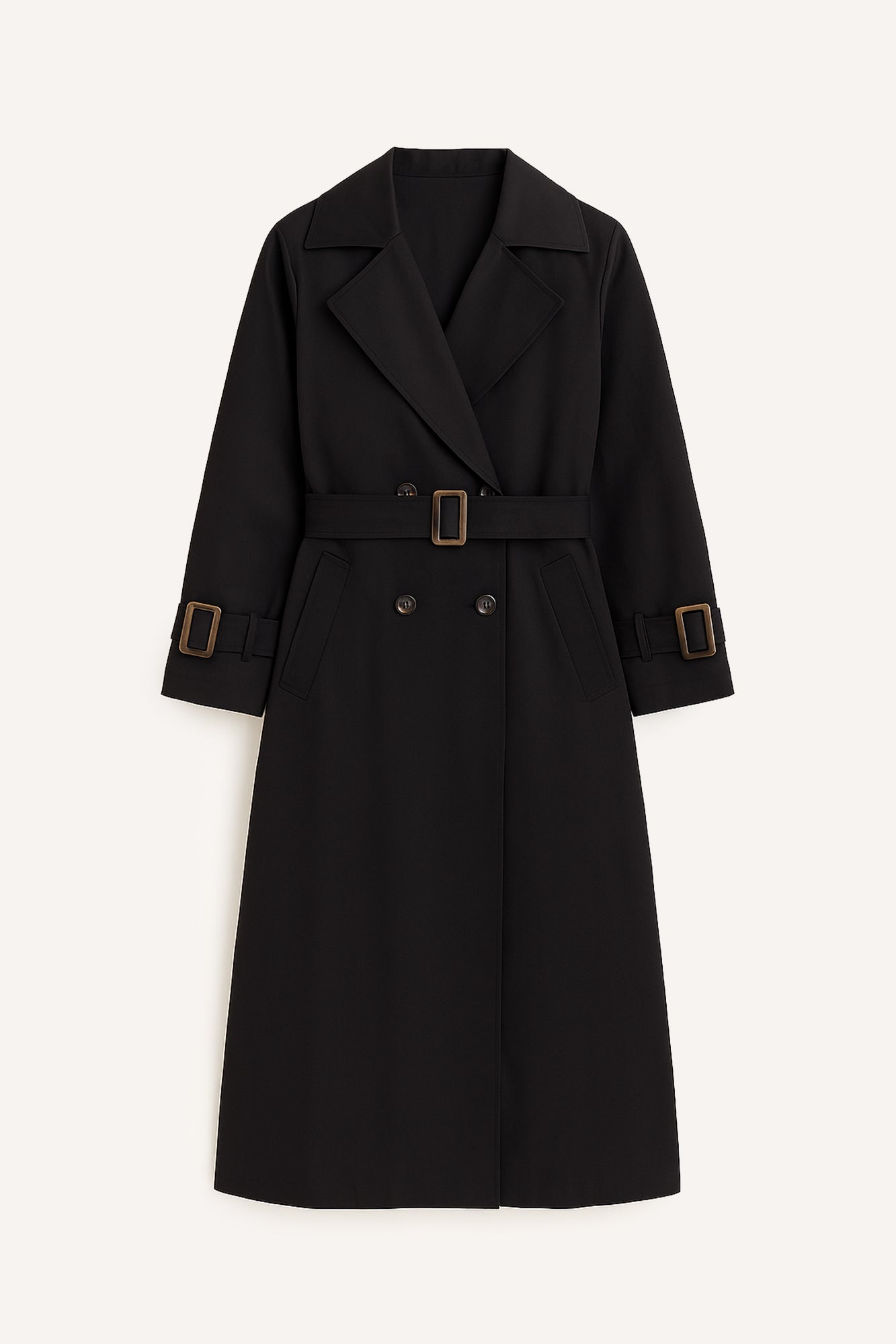 Çentik yaka. Önü çift sıralı kruvaze düğmeli. İki yan cep. Tokalı kemerli.