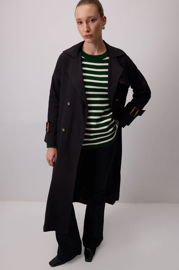Çentik yaka. Önü çift sıralı kruvaze düğmeli. İki yan cep. Tokalı kemerli.