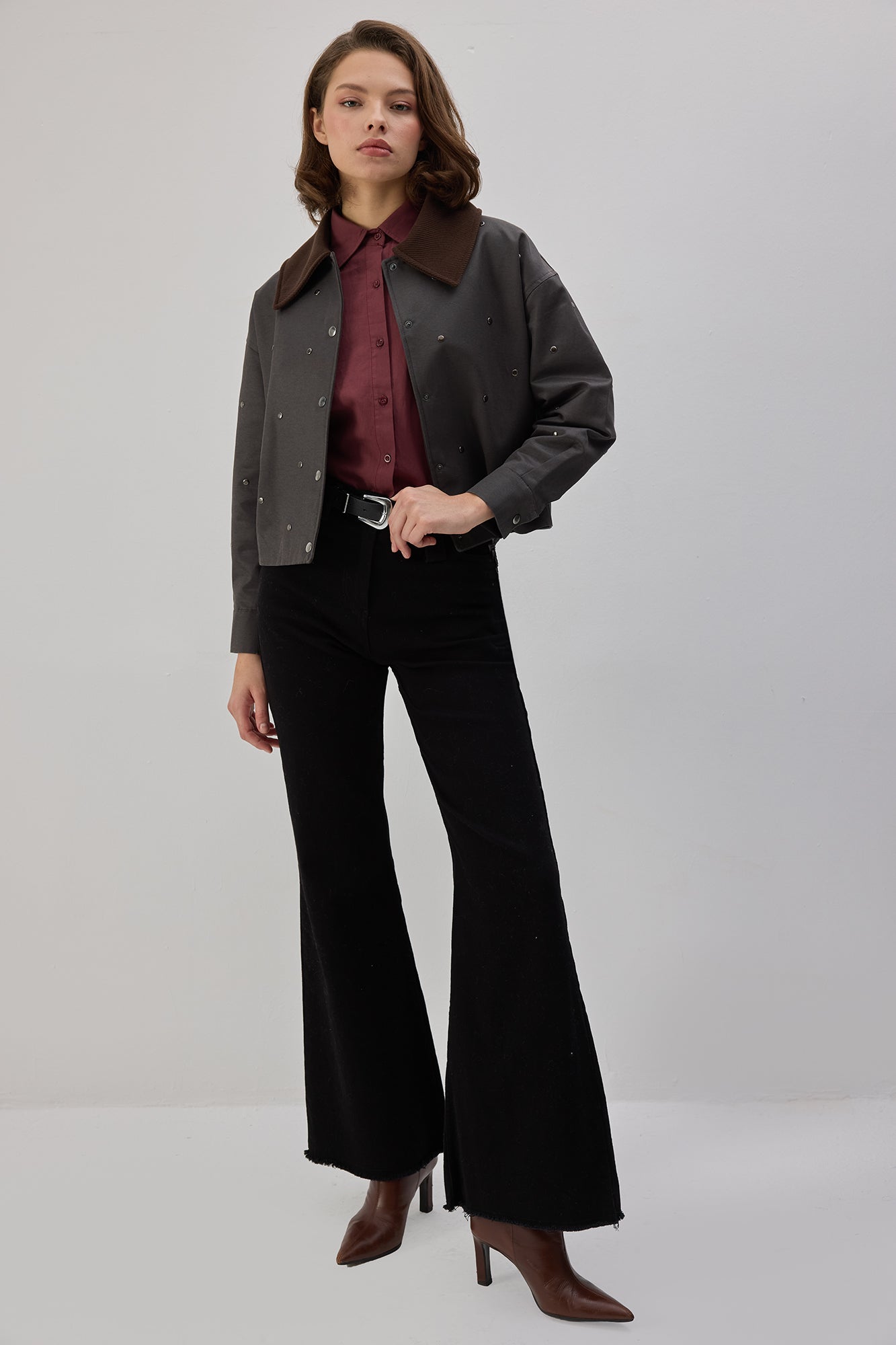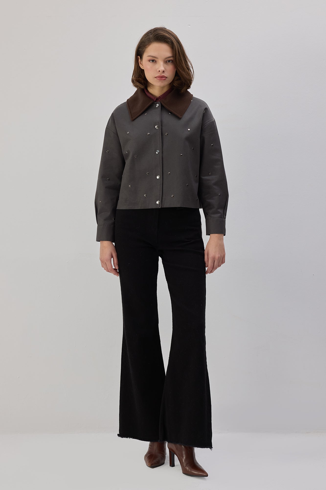Önü çıtçıt kapamalı. Metal aksesuar detaylı. Kadife yaka. Uzun kol manşetleri çıtçıt düğmeli.