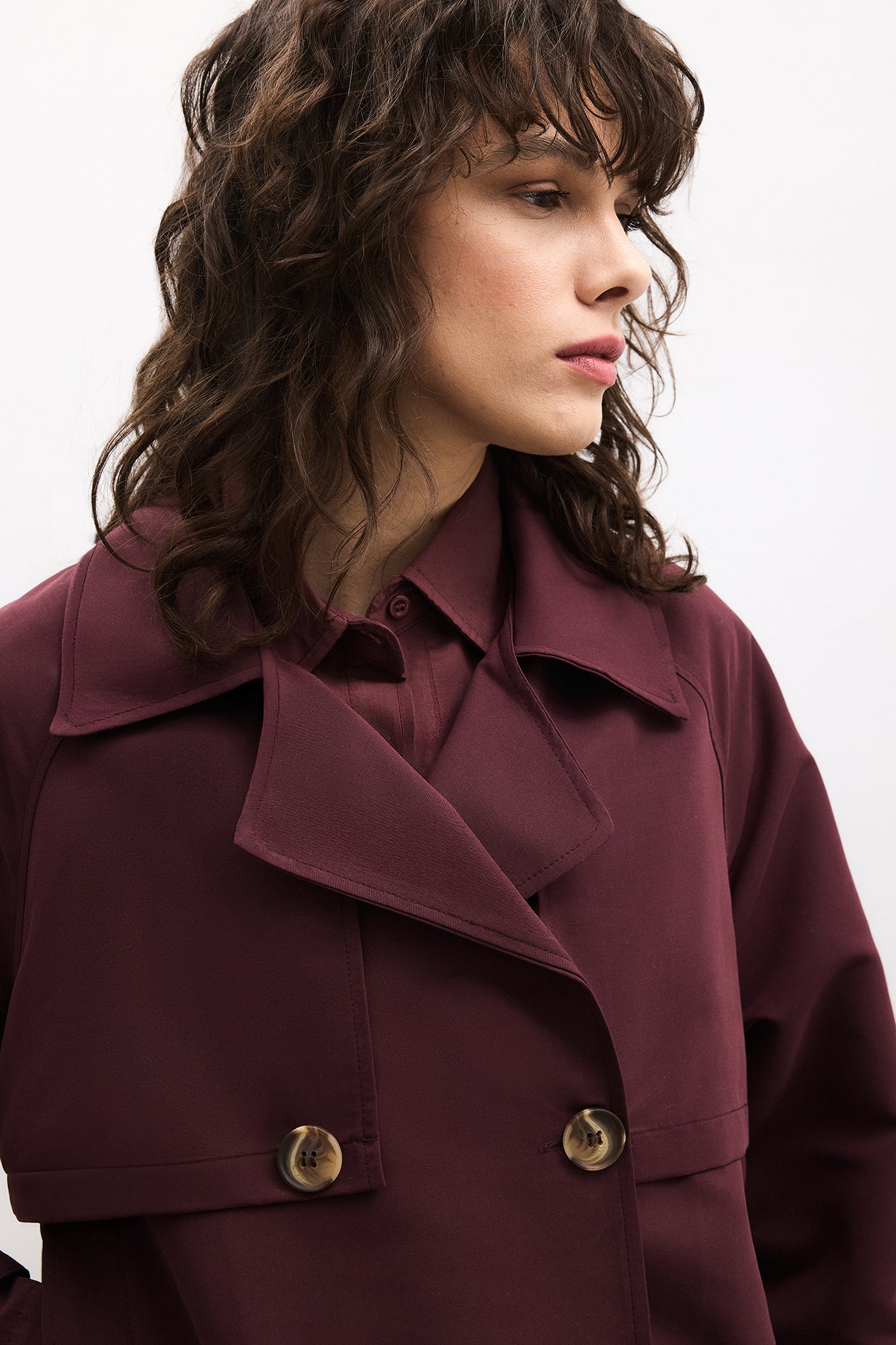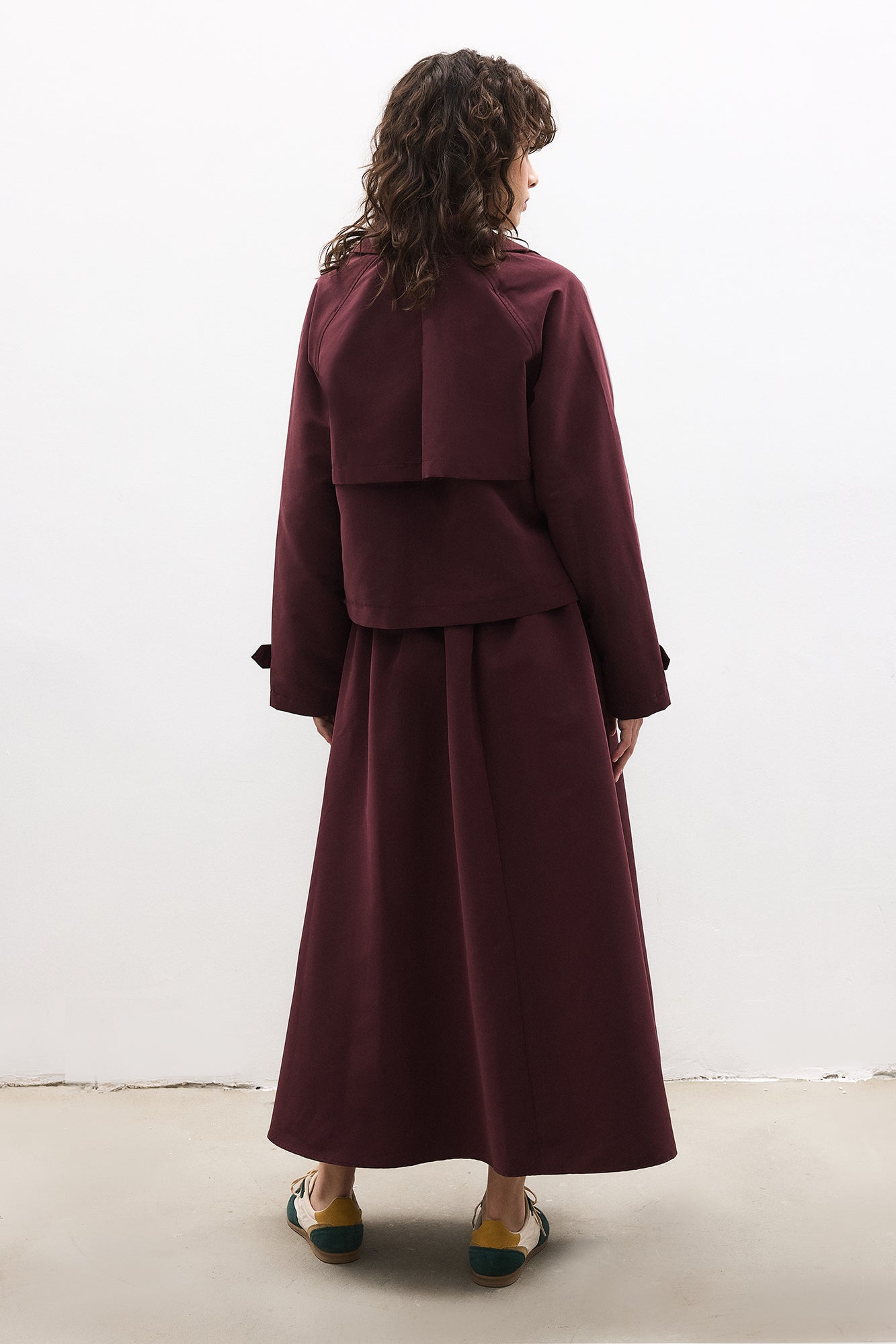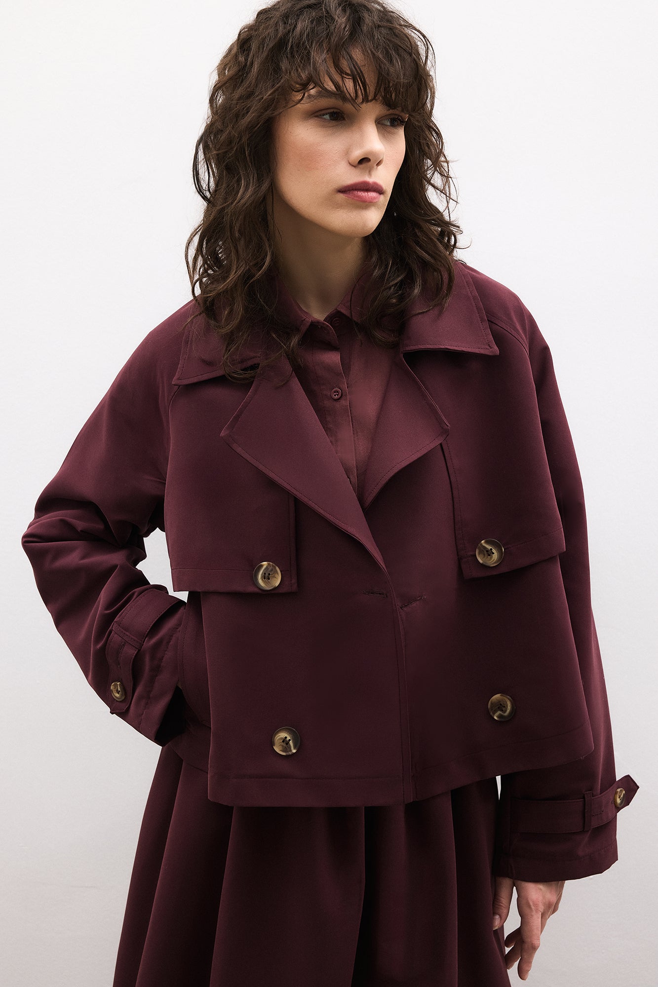 Kısa boy trençkot. Kruvaze kapama. Düğme detaylı. Midi boy etek.