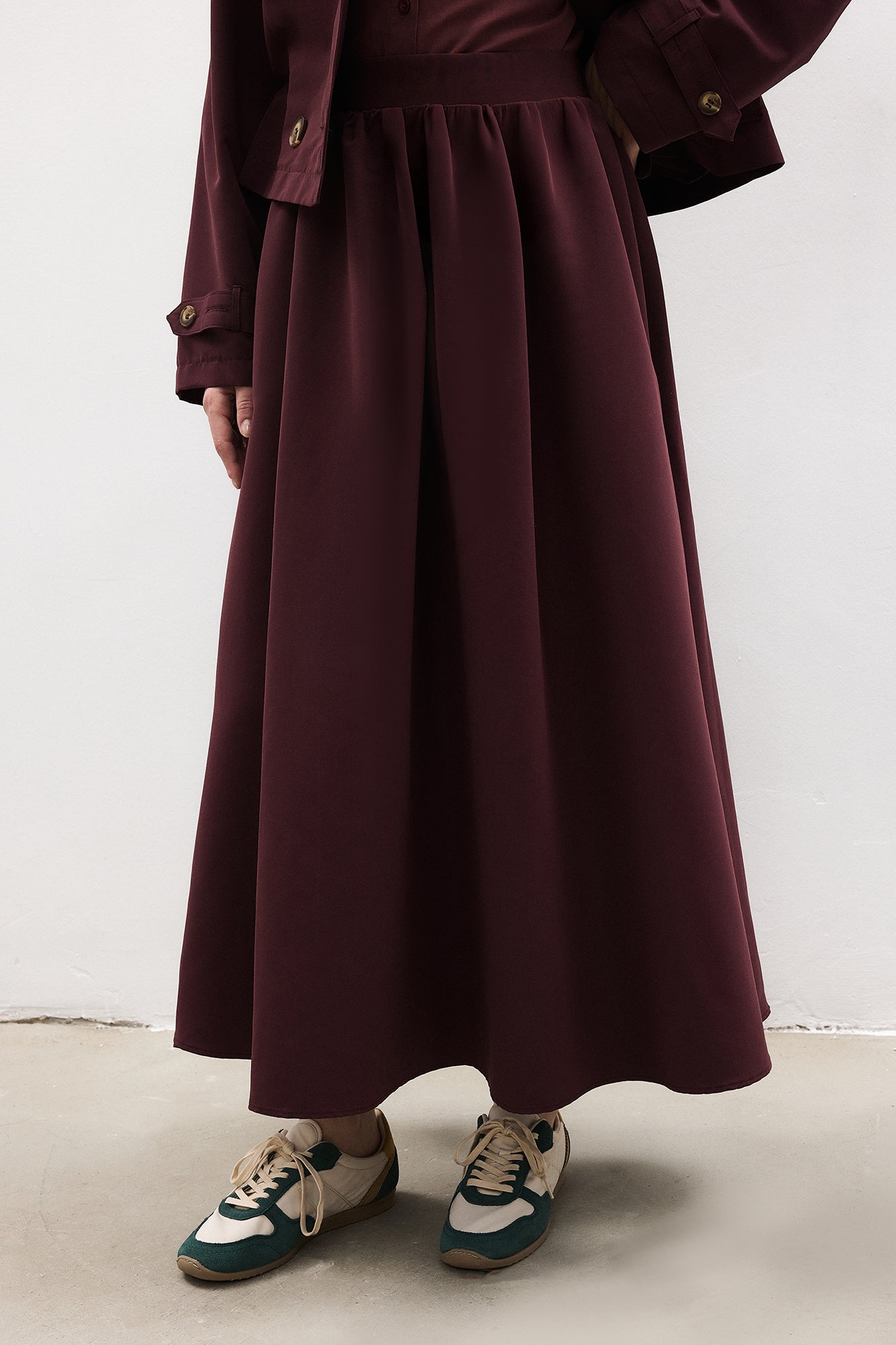 Zamansız şehir stilini yansıtan trençkot ve etek takım, hafif ve akışkan kumaşıyla gün boyu konfor sunar. Kısa boy modern trençkot ve hareketli midi etek formu sayesinde hem günlük hem ofis kombinlerinde kolayca kullanılabilir. Tek parça şık bir görünüm sunarken, ayrı ayrı kombinlenerek çok yönlü kullanım sağlar.