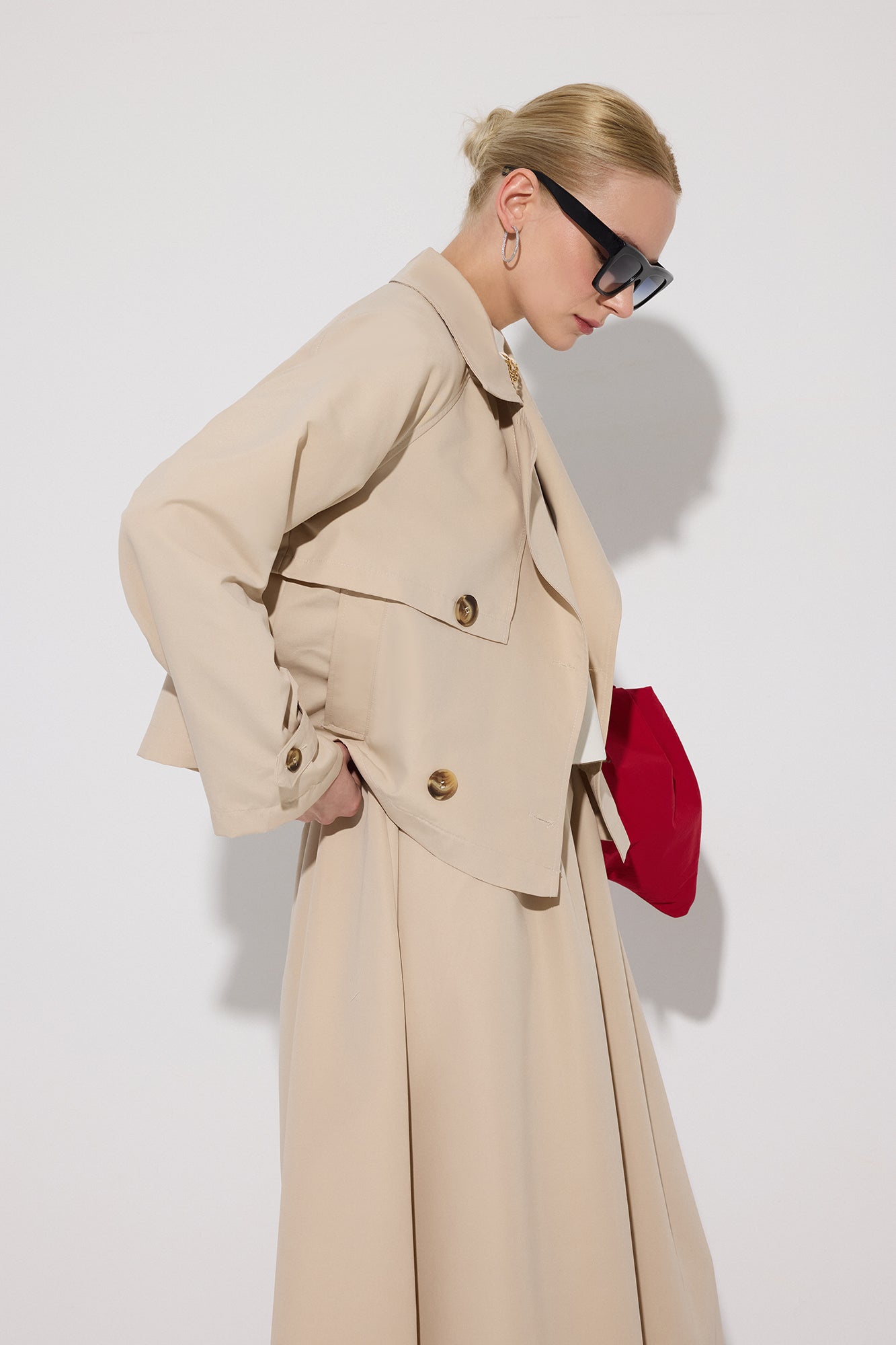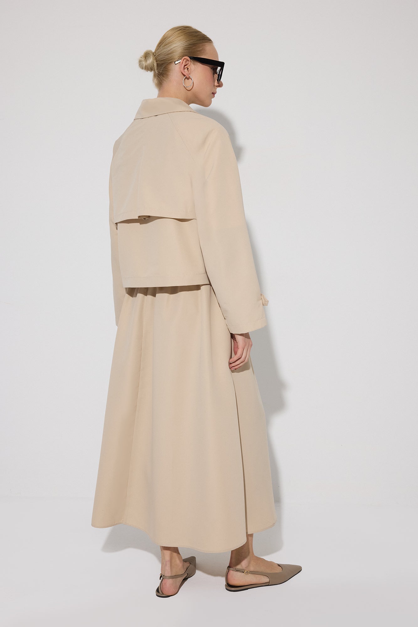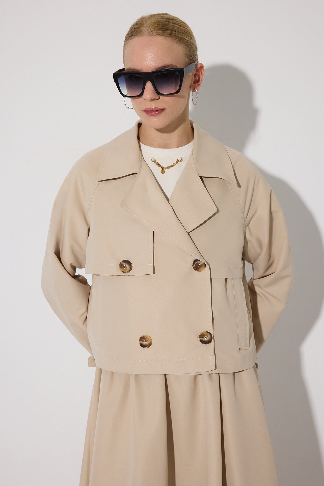 Kısa boy trençkot. Kruvaze kapama. Düğme detaylı. Midi boy etek.