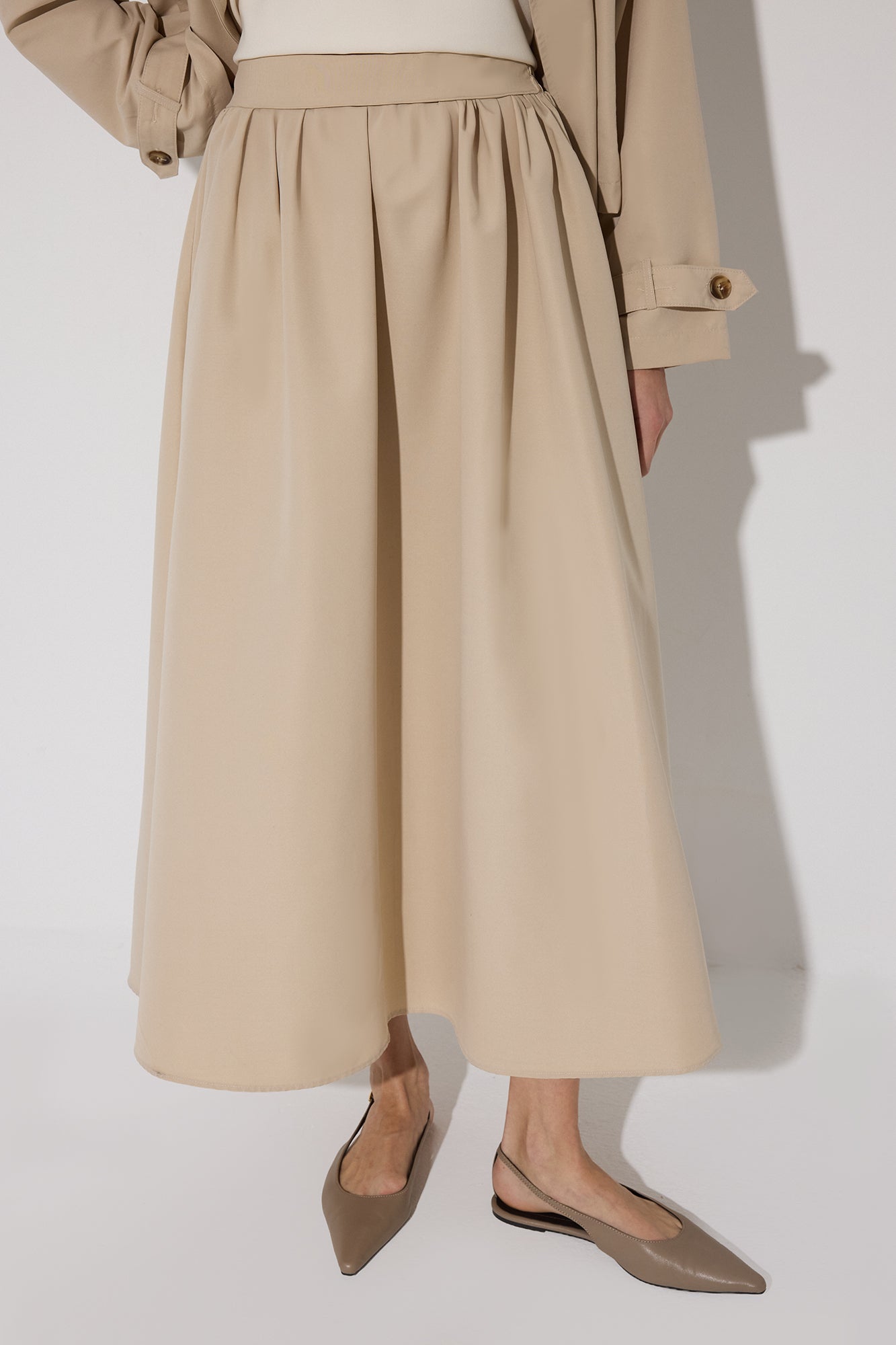 Zamansız şehir stilini yansıtan trençkot ve etek takım, hafif ve akışkan kumaşıyla gün boyu konfor sunar. Kısa boy modern trençkot ve hareketli midi etek formu sayesinde hem günlük hem ofis kombinlerinde kolayca kullanılabilir. Tek parça şık bir görünüm sunarken, ayrı ayrı kombinlenerek çok yönlü kullanım sağlar.