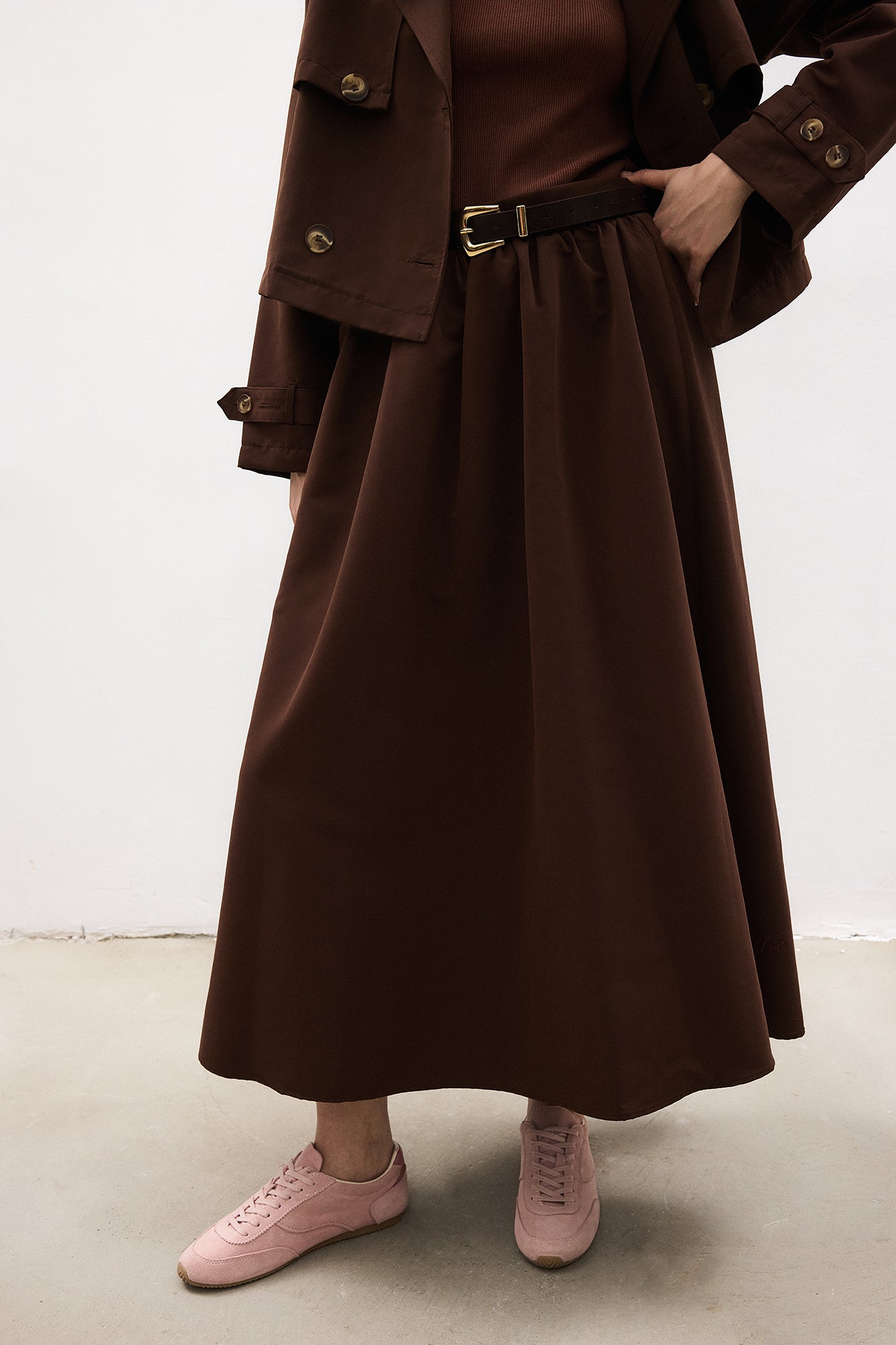 Zamansız şehir stilini yansıtan trençkot ve etek takım, hafif ve akışkan kumaşıyla gün boyu konfor sunar. Kısa boy modern trençkot ve hareketli midi etek formu sayesinde hem günlük hem ofis kombinlerinde kolayca kullanılabilir. Tek parça şık bir görünüm sunarken, ayrı ayrı kombinlenerek çok yönlü kullanım sağlar.