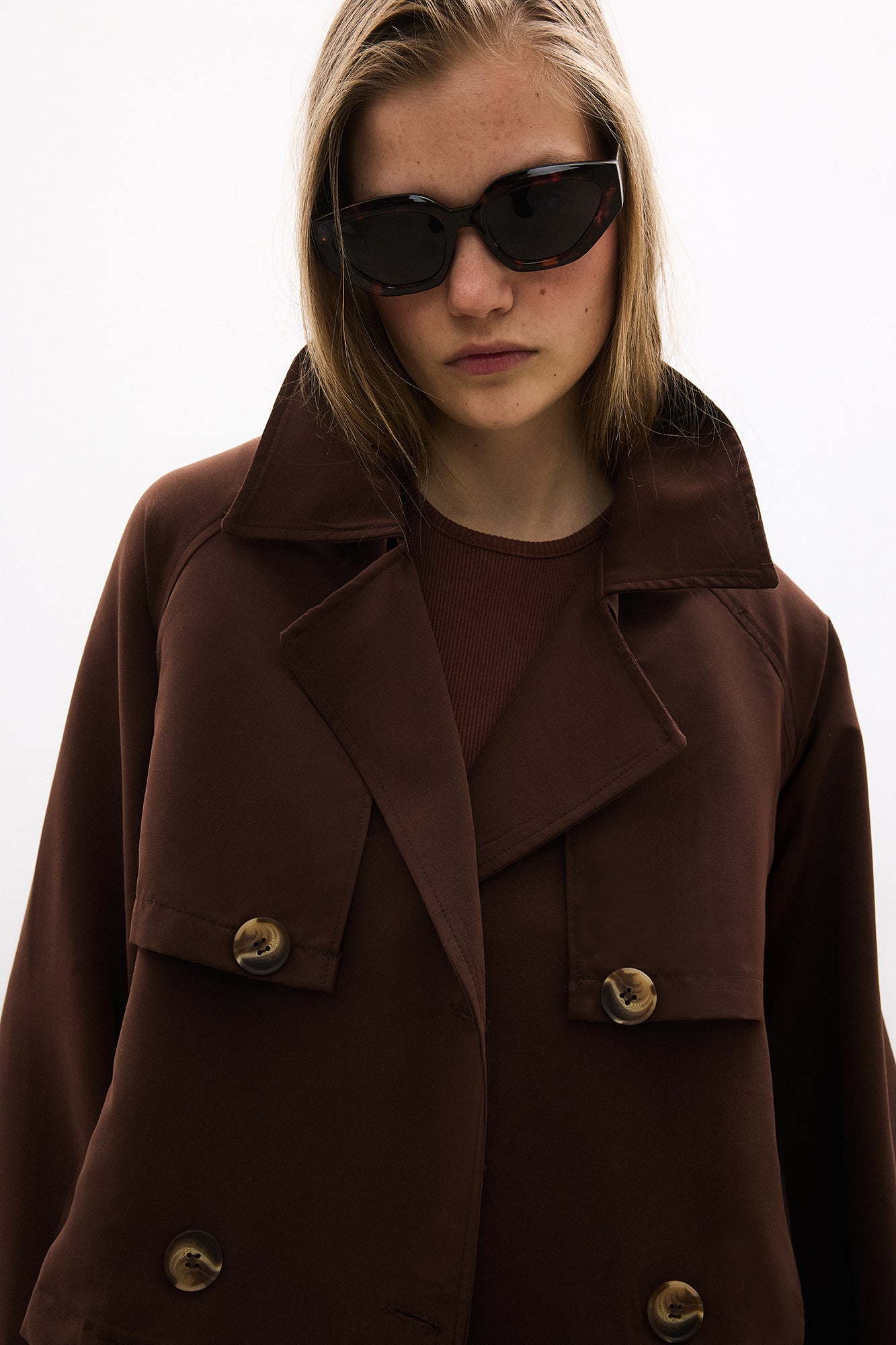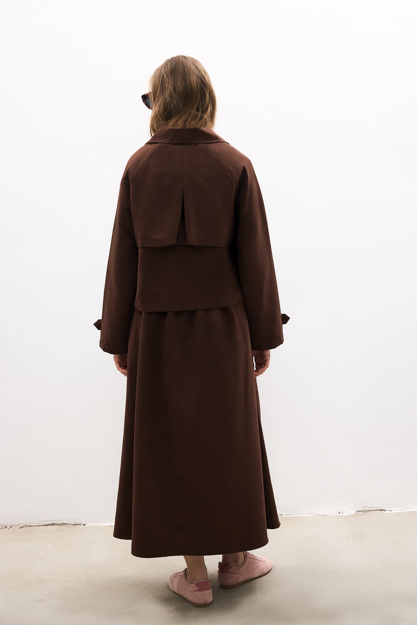 Kısa boy trençkot. Kruvaze kapama. Düğme detaylı. Midi boy etek.