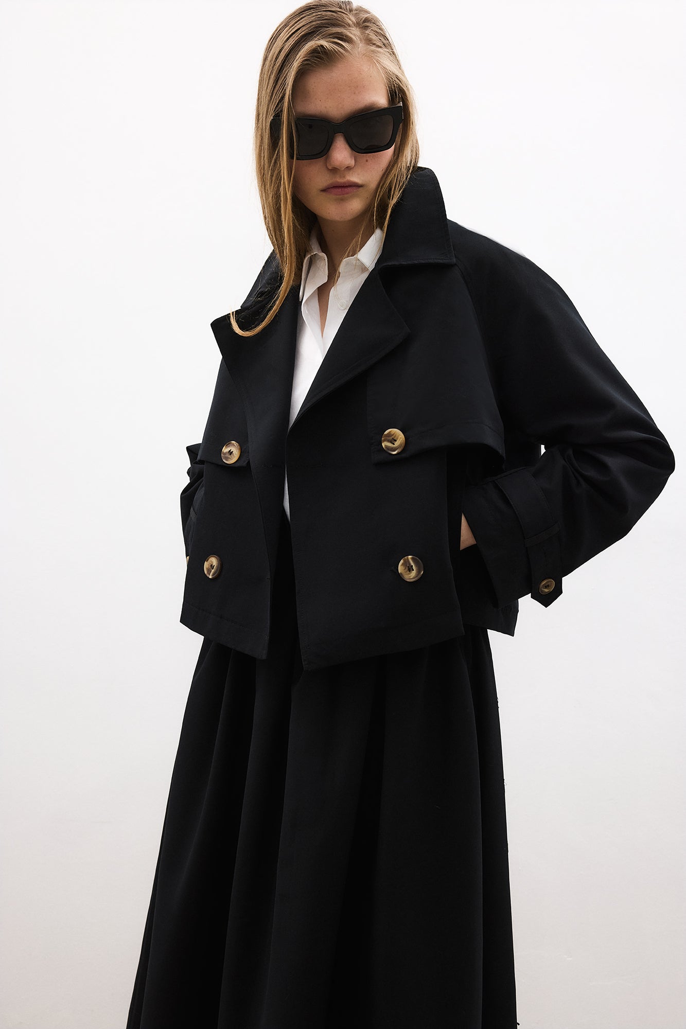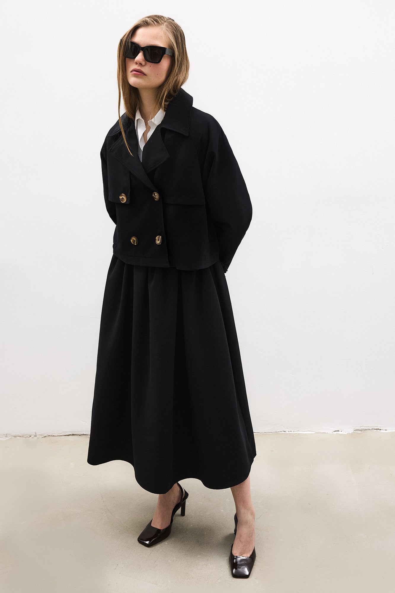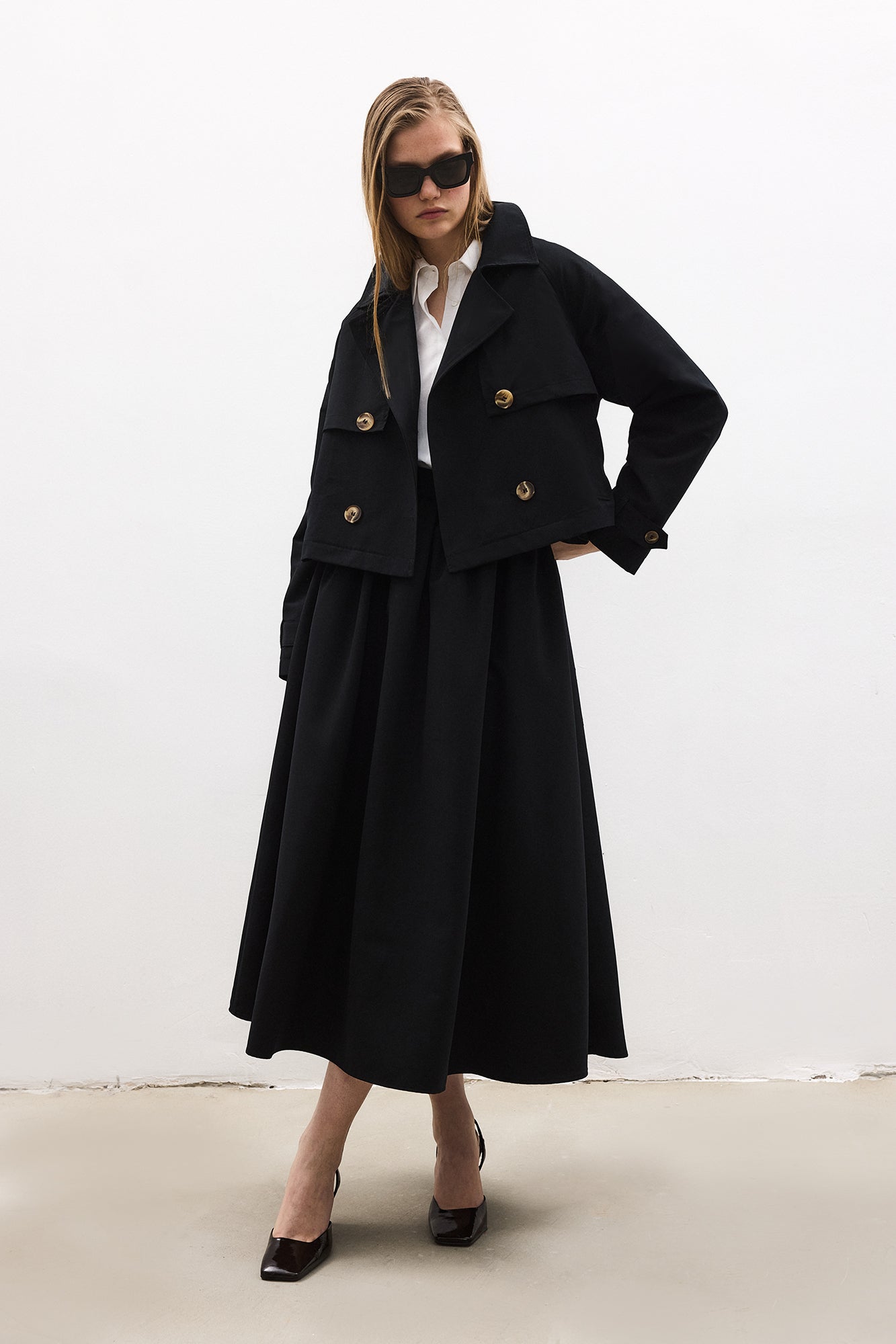 Kısa boy trençkot. Kruvaze kapama. Düğme detaylı. Midi boy etek.