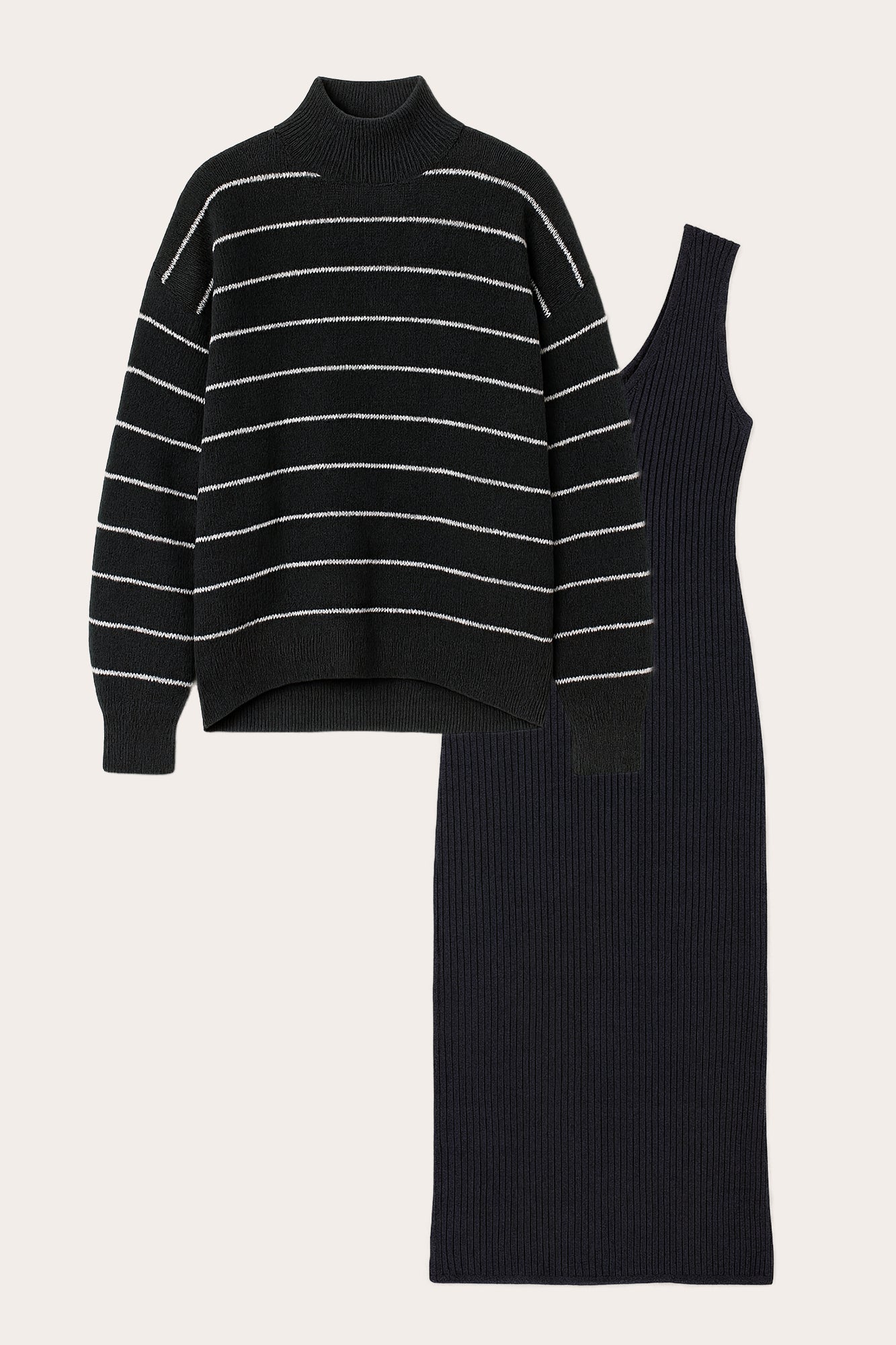 Dik yaka. Uzun kollu ve düşük omuzlu. Kontrast çizgili kazak. Askılı. Fitilli. Uzun boy jile.