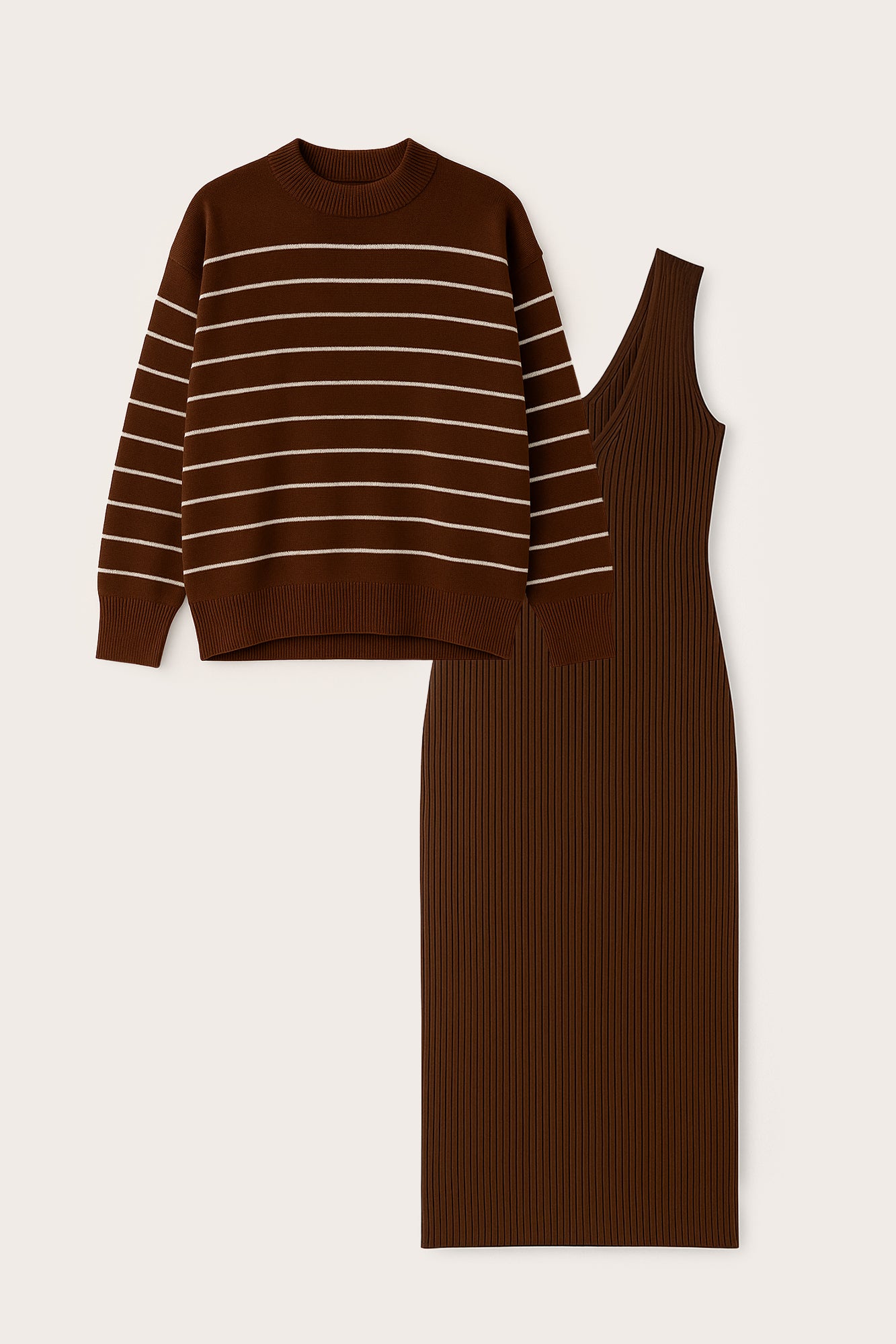 Dik yaka. Uzun kollu ve düşük omuzlu. Kontrast çizgili kazak. Askılı. Fitilli. Uzun boy jile.