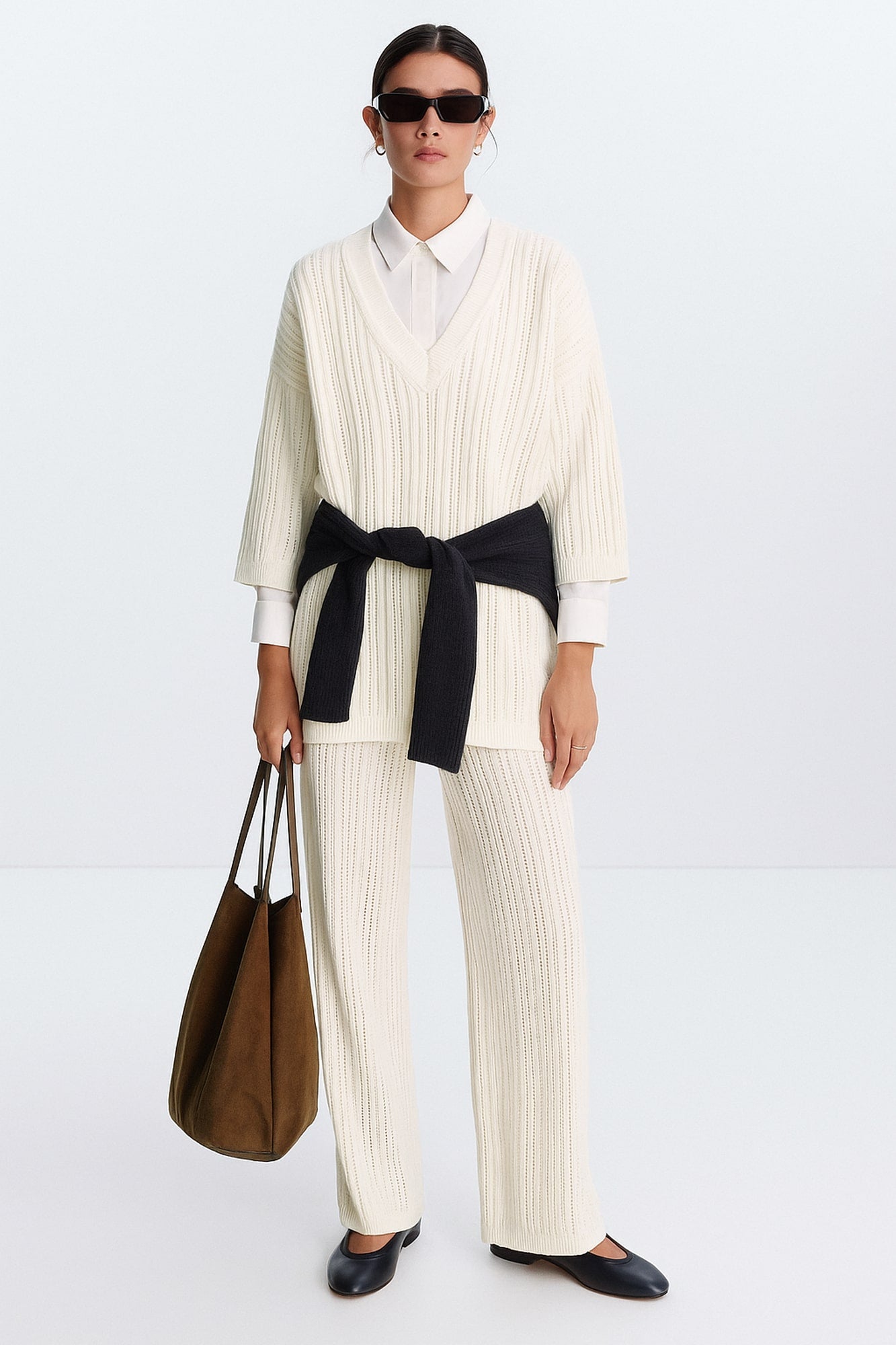 V yaka. Uzun kollu ve düşük omuzlu. Triko. Uzun boy. Triko pantolon.