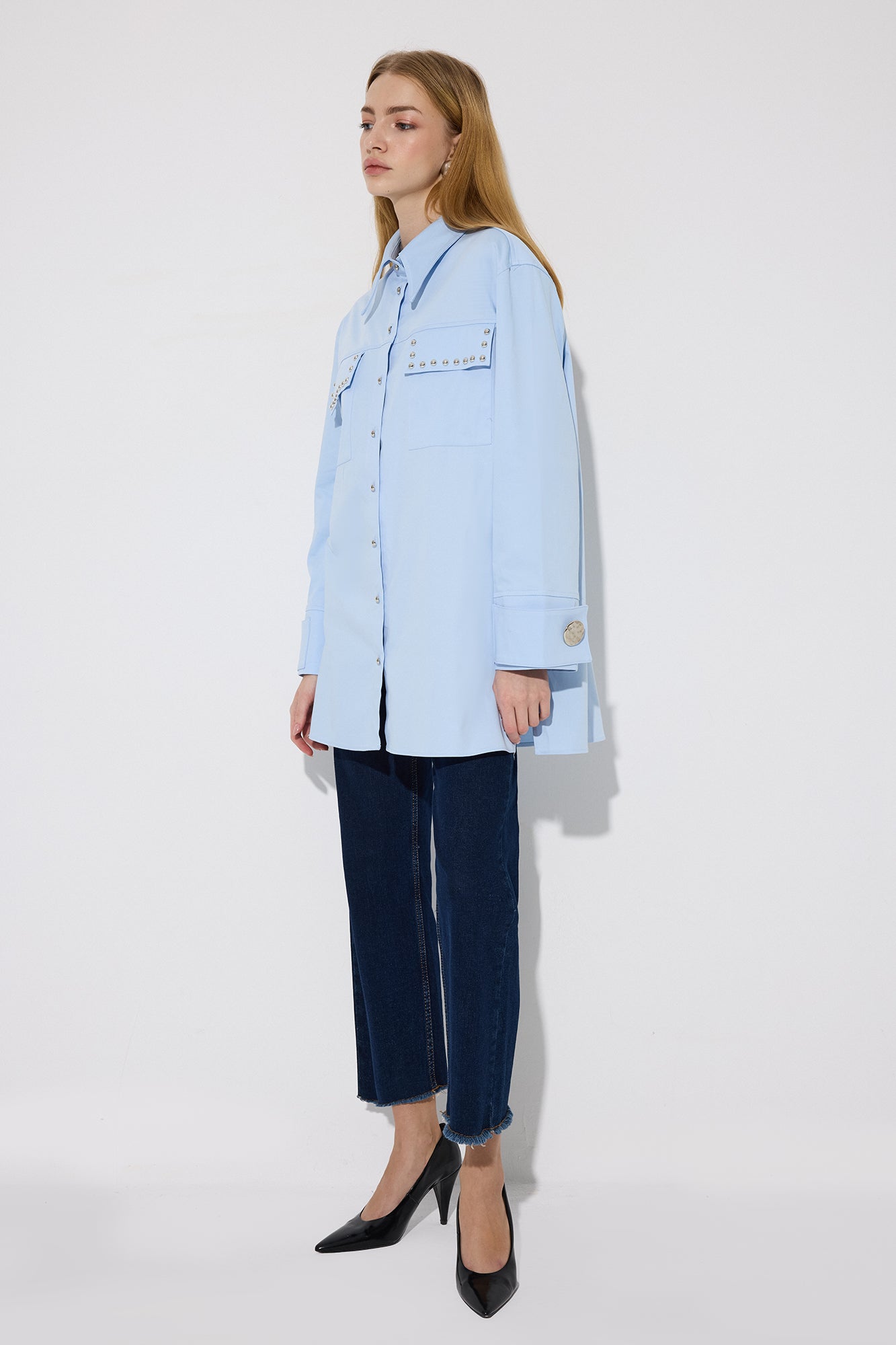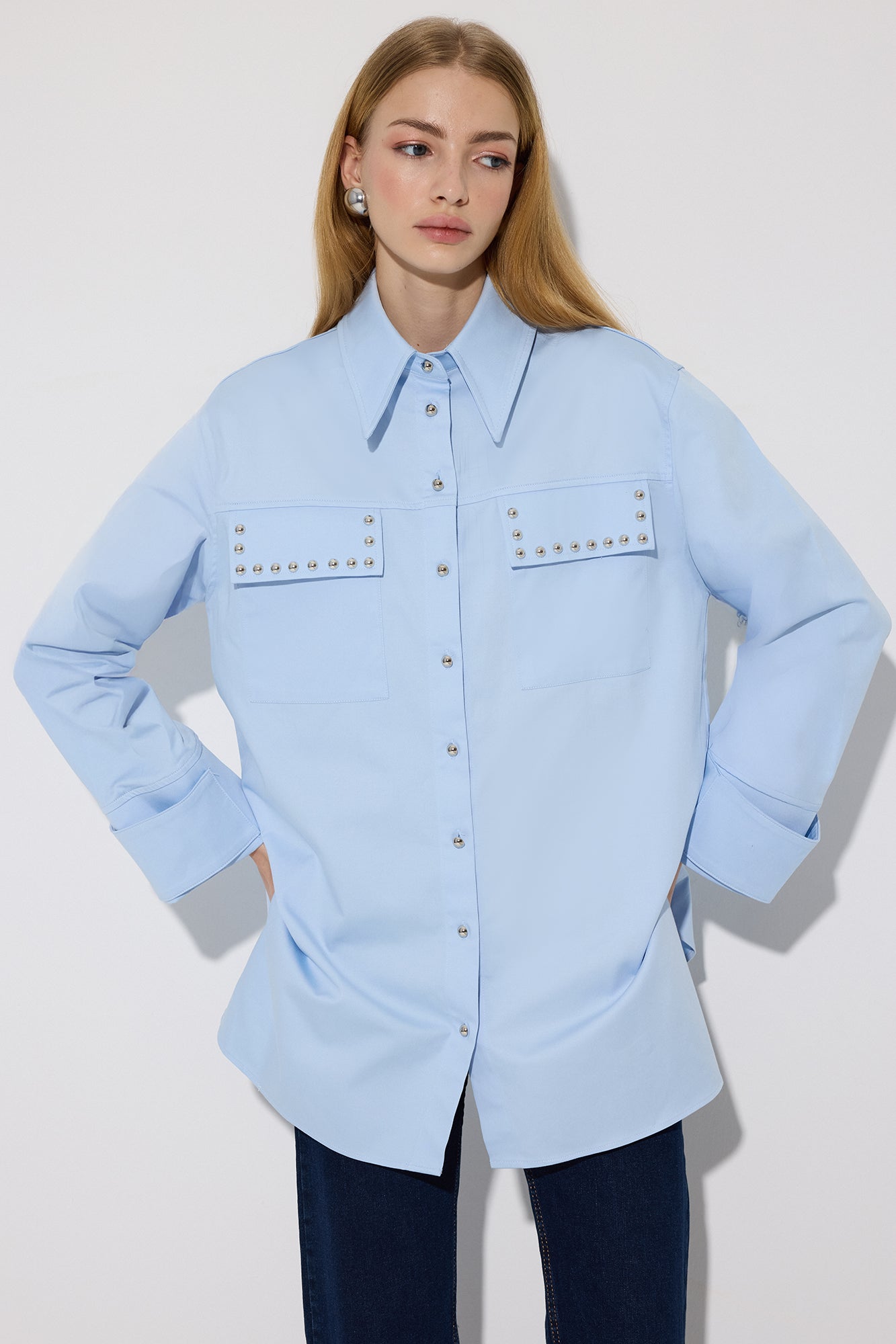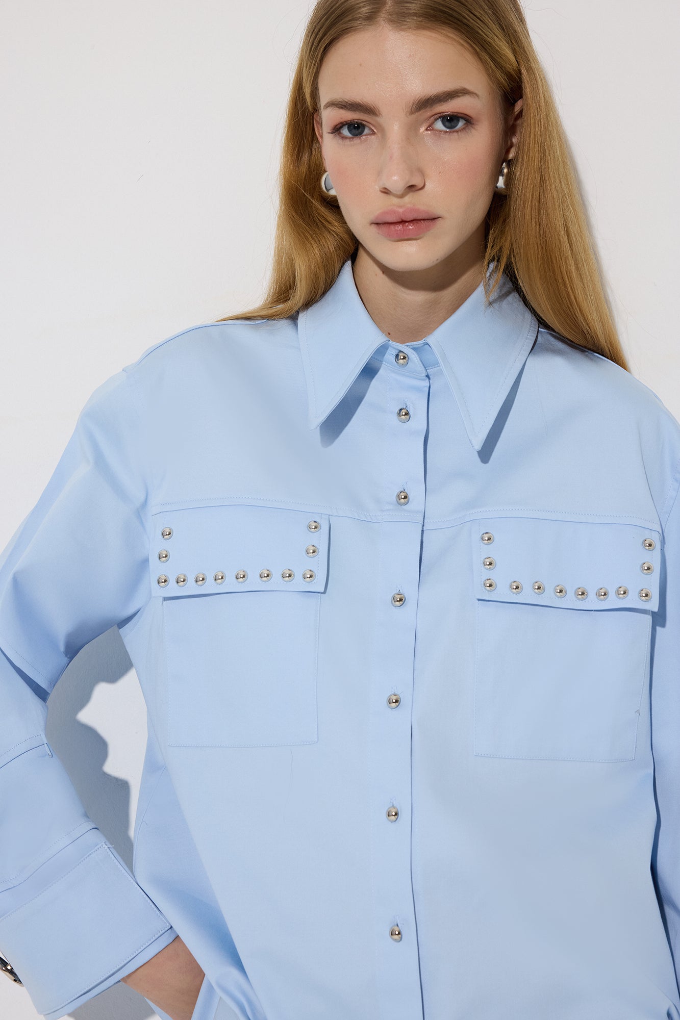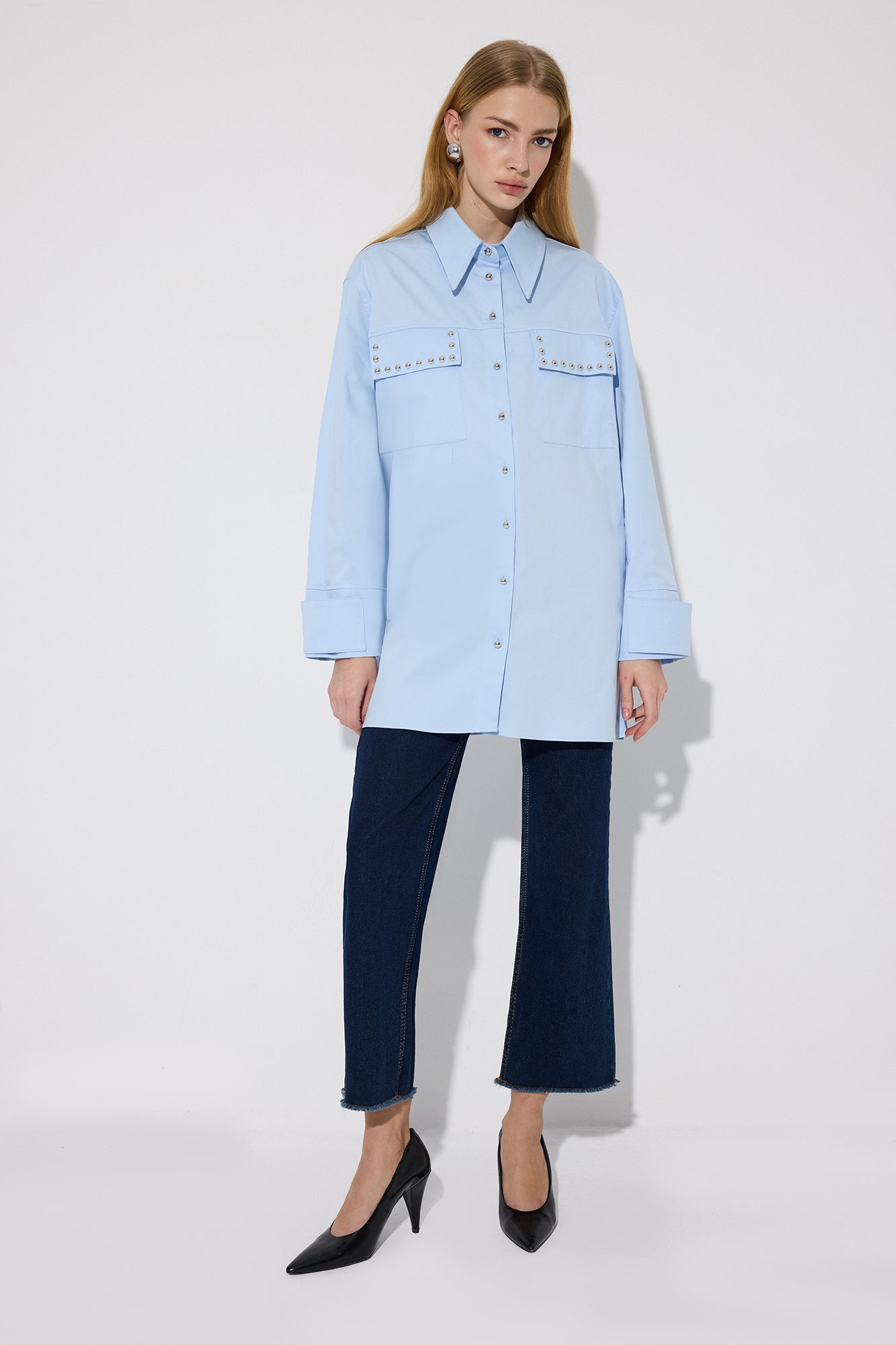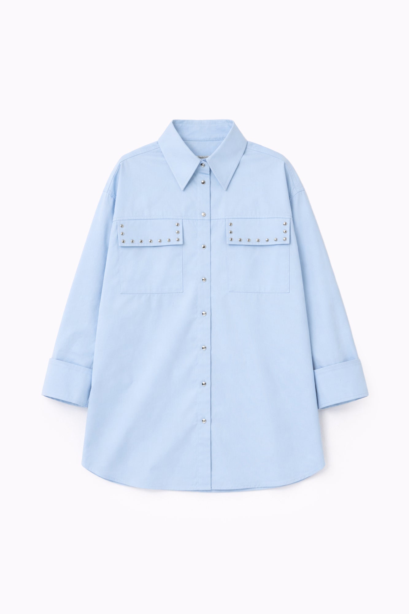Gömlek yaka. Önden düğme kapamalı. Kapaklı çift cep. Trok detaylı. Poplin gömlek.
