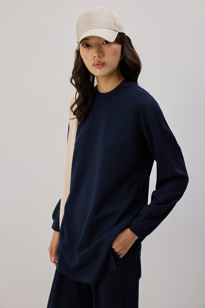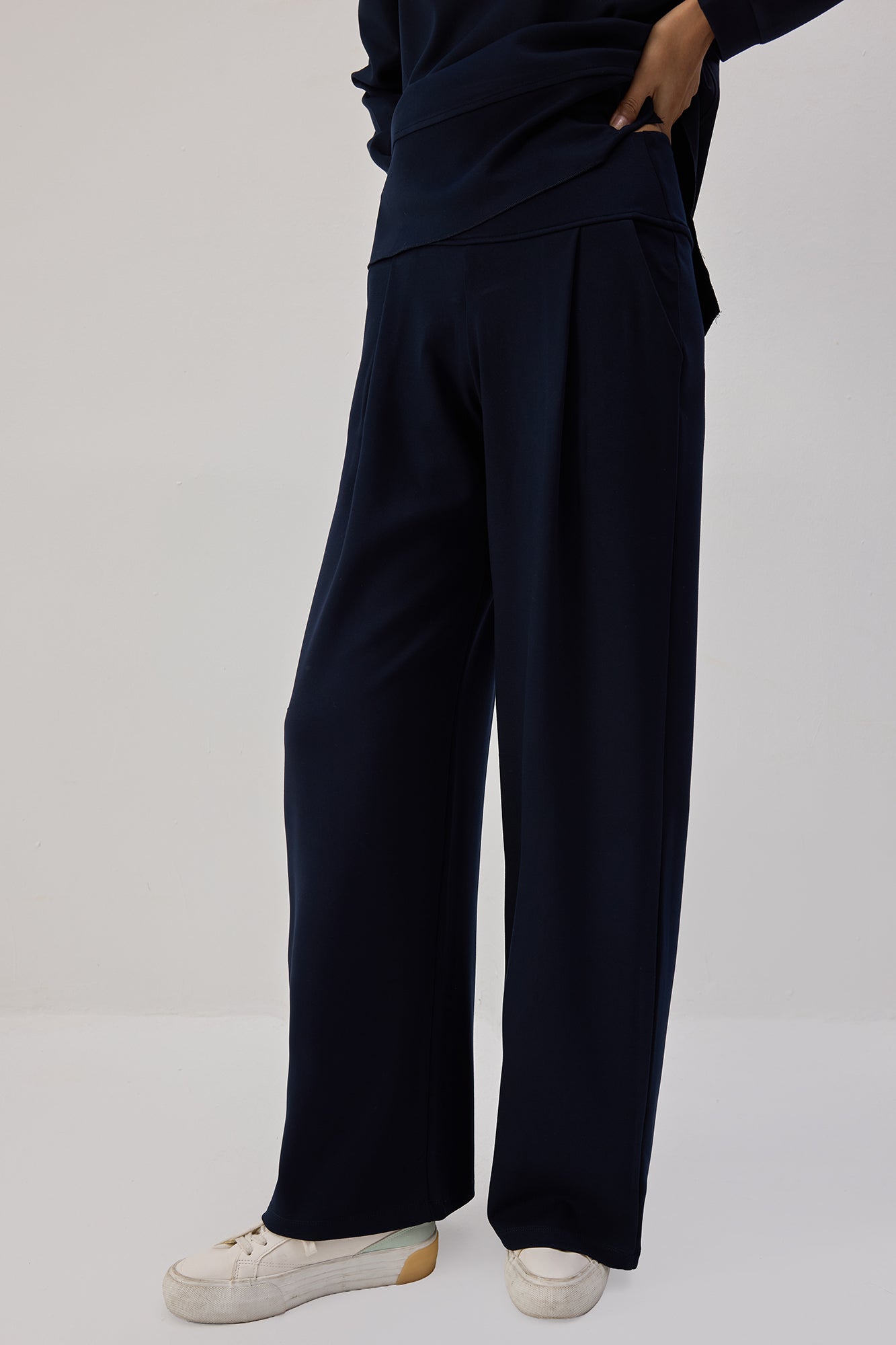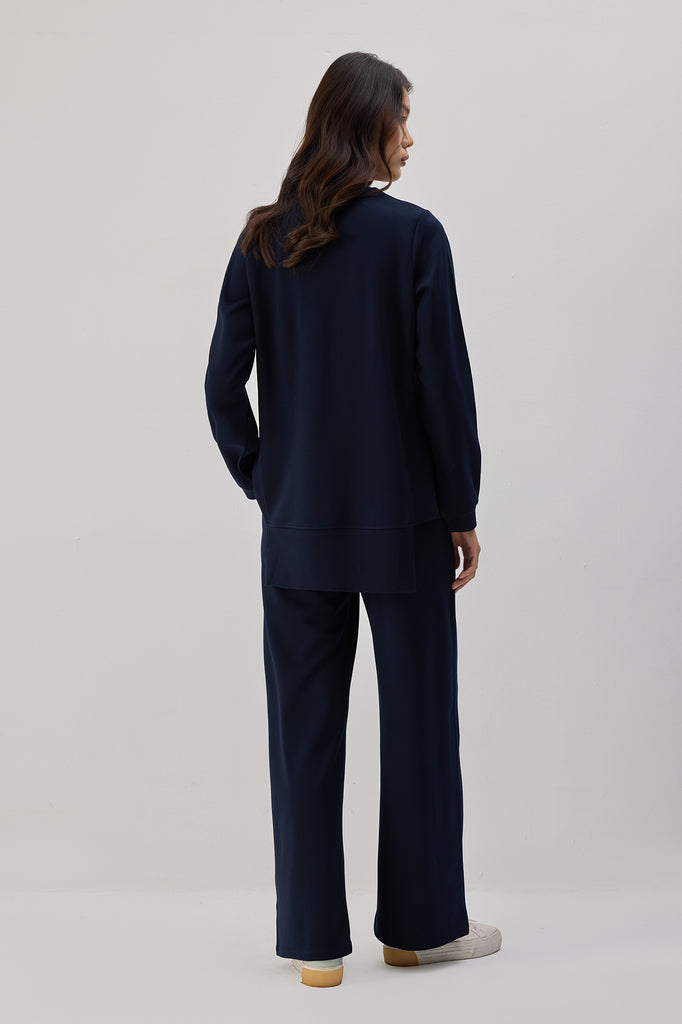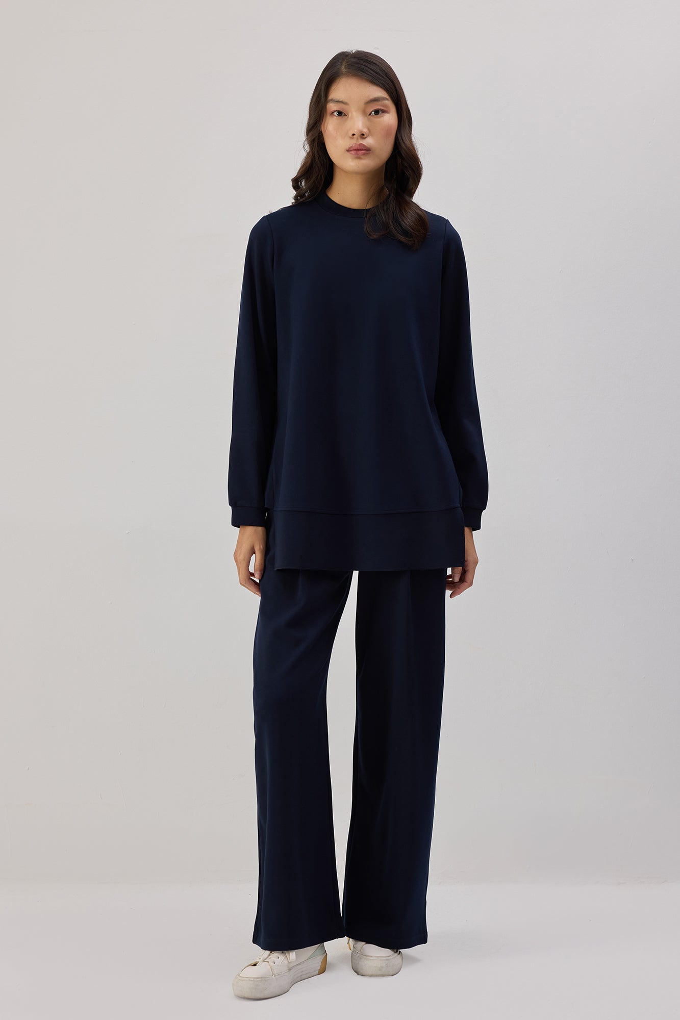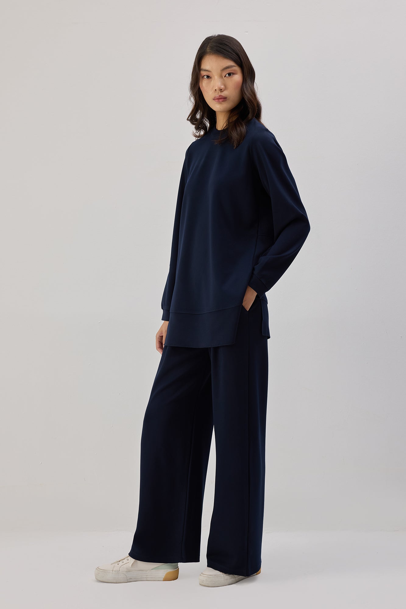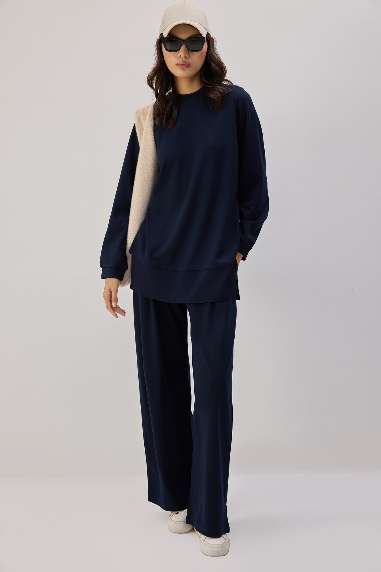 Geniş paça pantolon. Esnek bel. Cepli. Yuvarlak yaka. Uzun kollu.