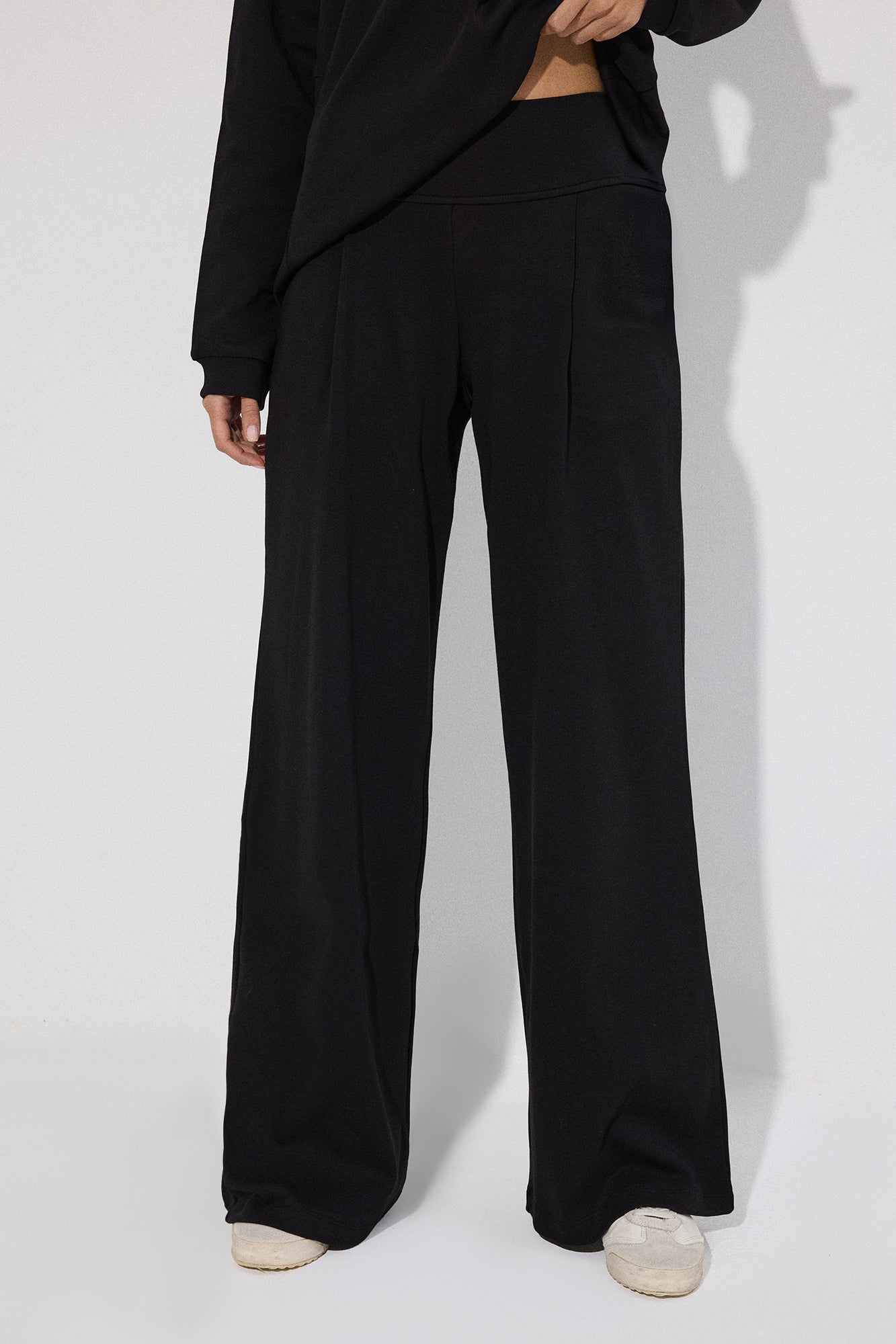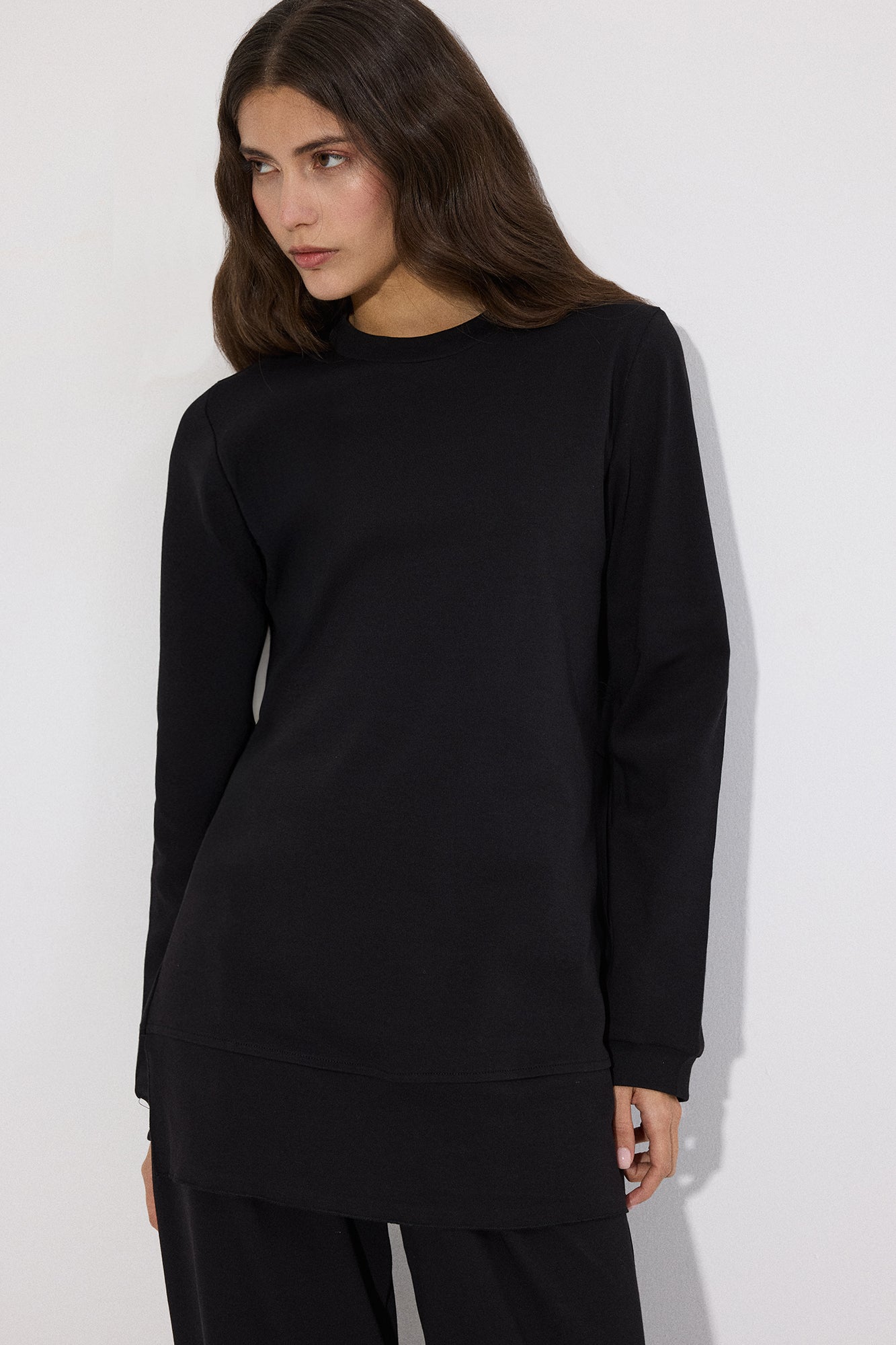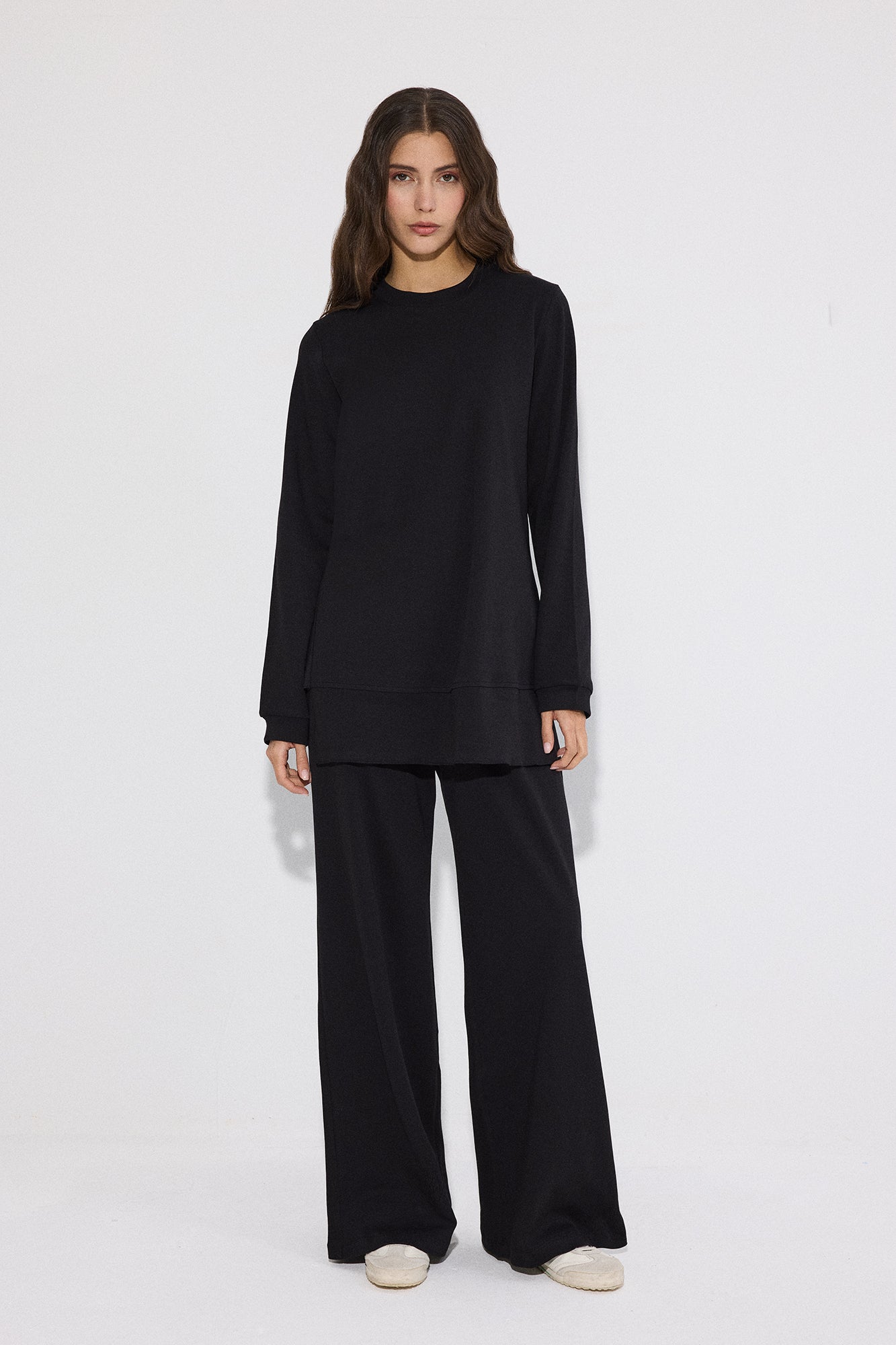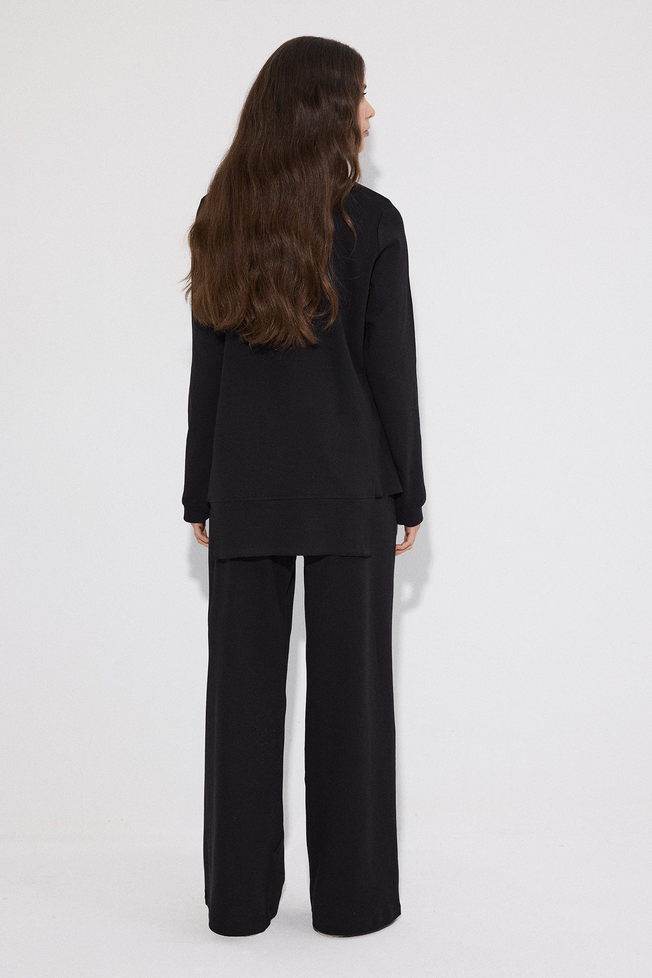Bisiklet yaka. Uzun kollu. Yanlardan hafif yırtmaçlı, volanlı/kat detaylı etek ucu. Yüksek bel pantolon. Geniş paça form.