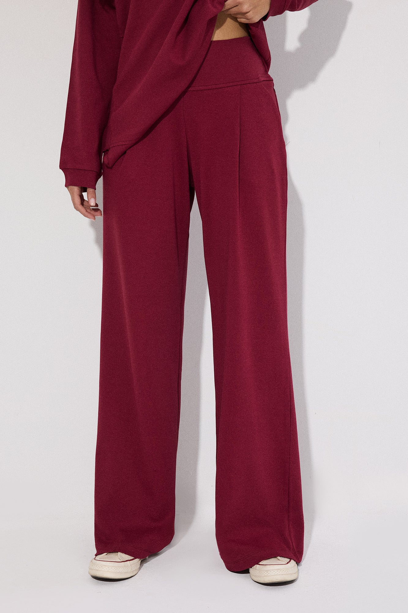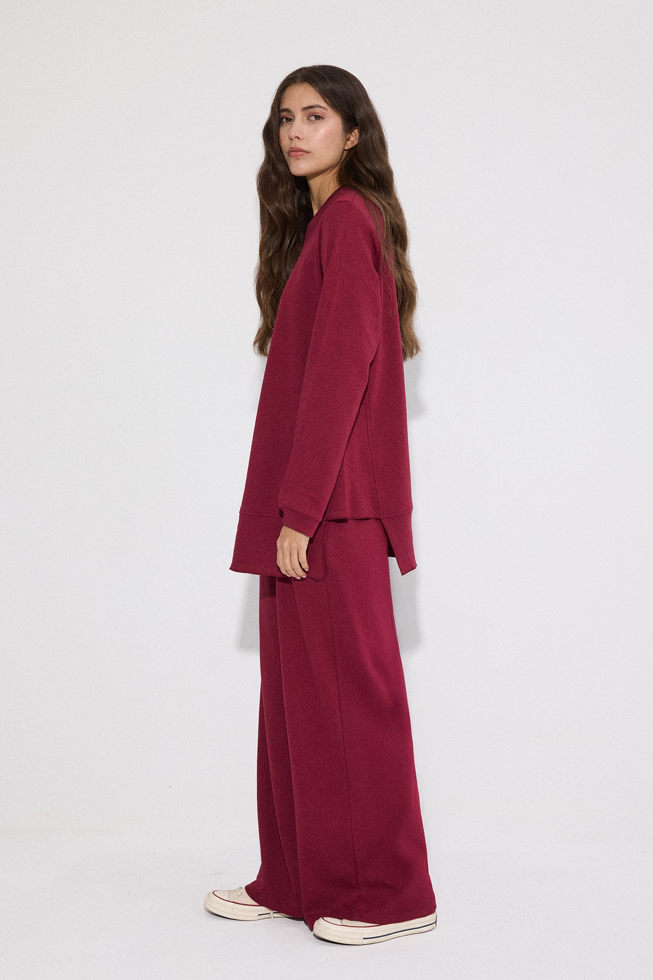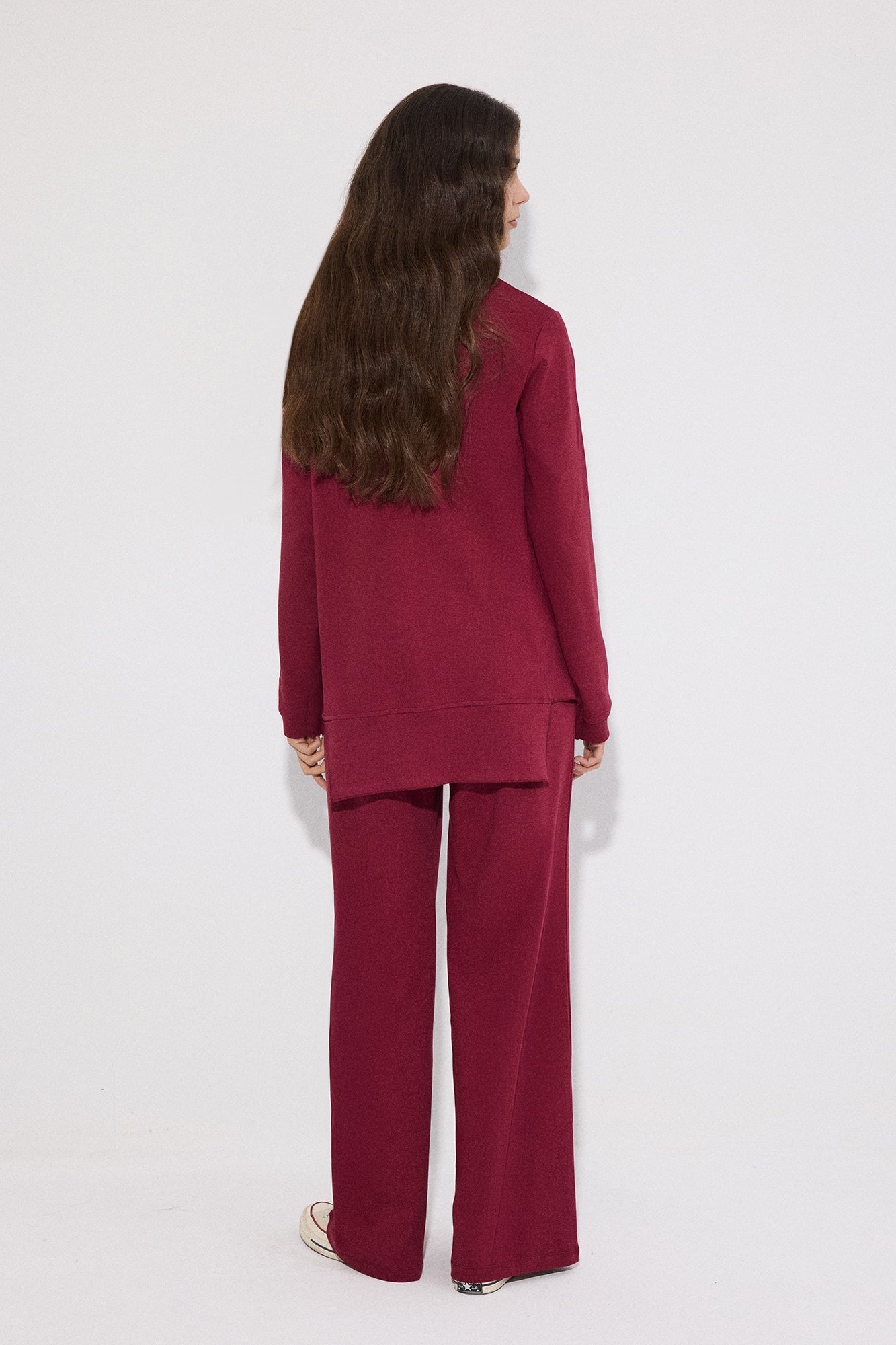 Bisiklet yaka. Uzun kollu. Yanlardan hafif yırtmaçlı, volanlı/kat detaylı etek ucu. Yüksek bel pantolon. Geniş paça form.