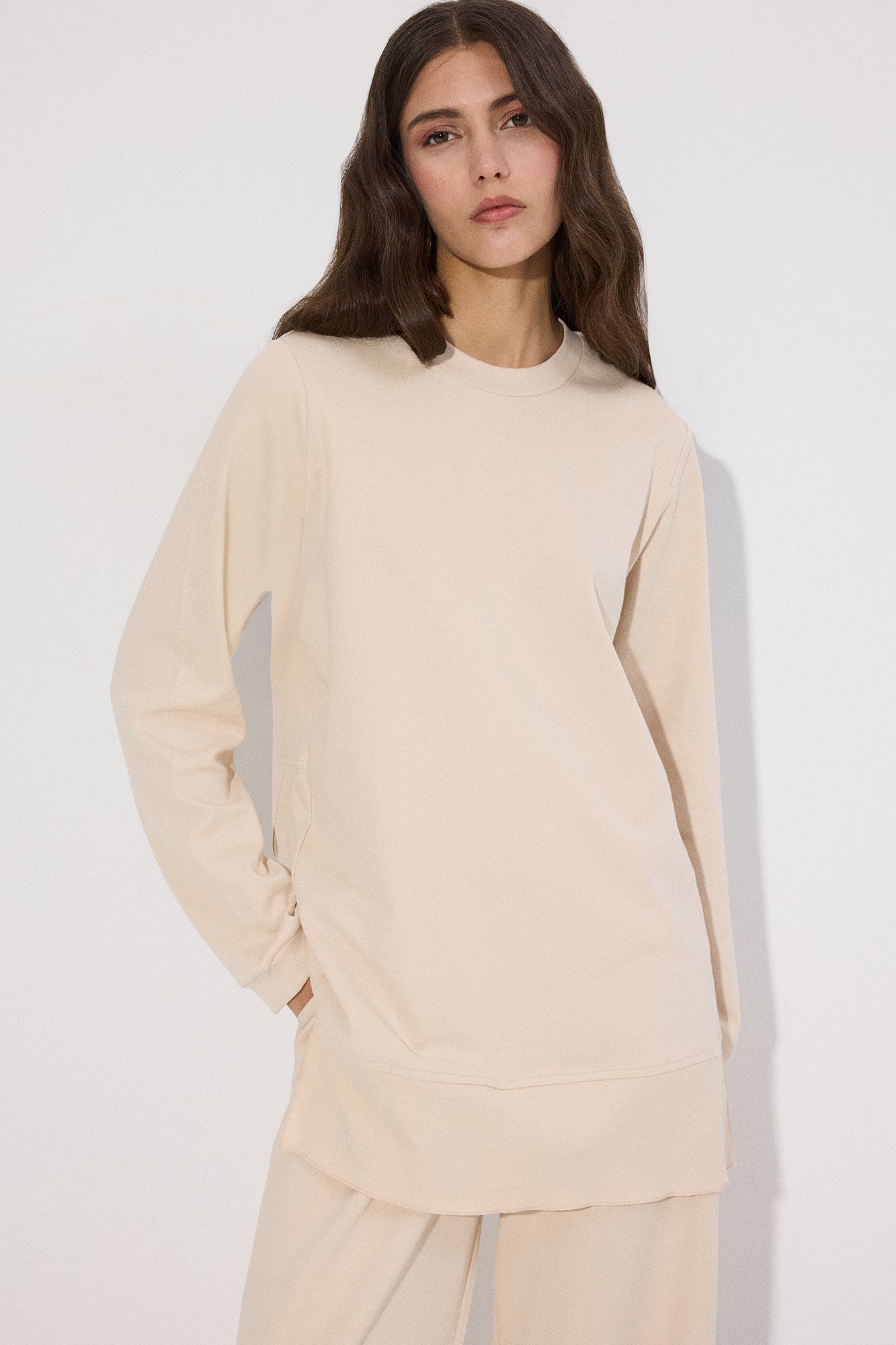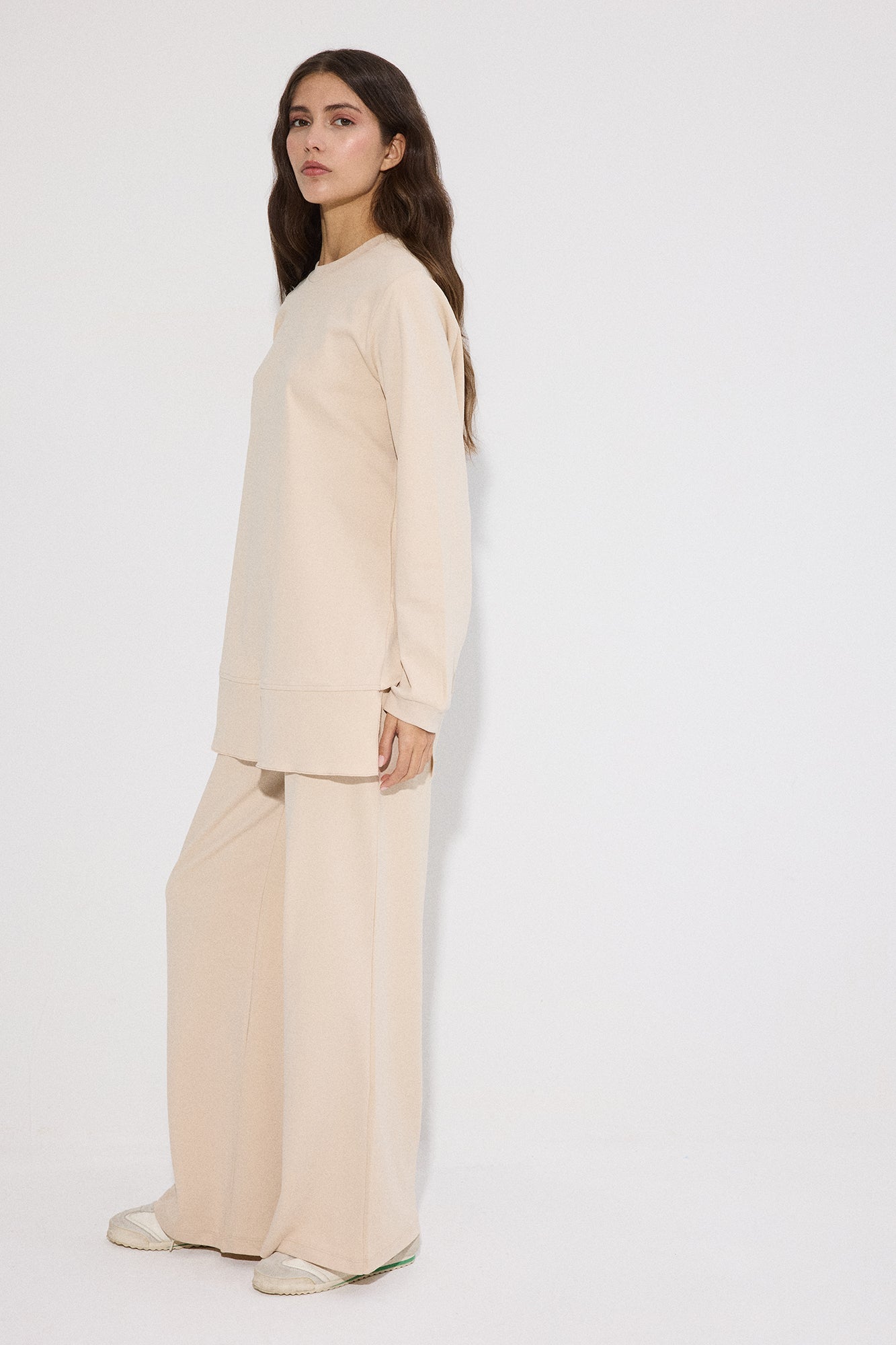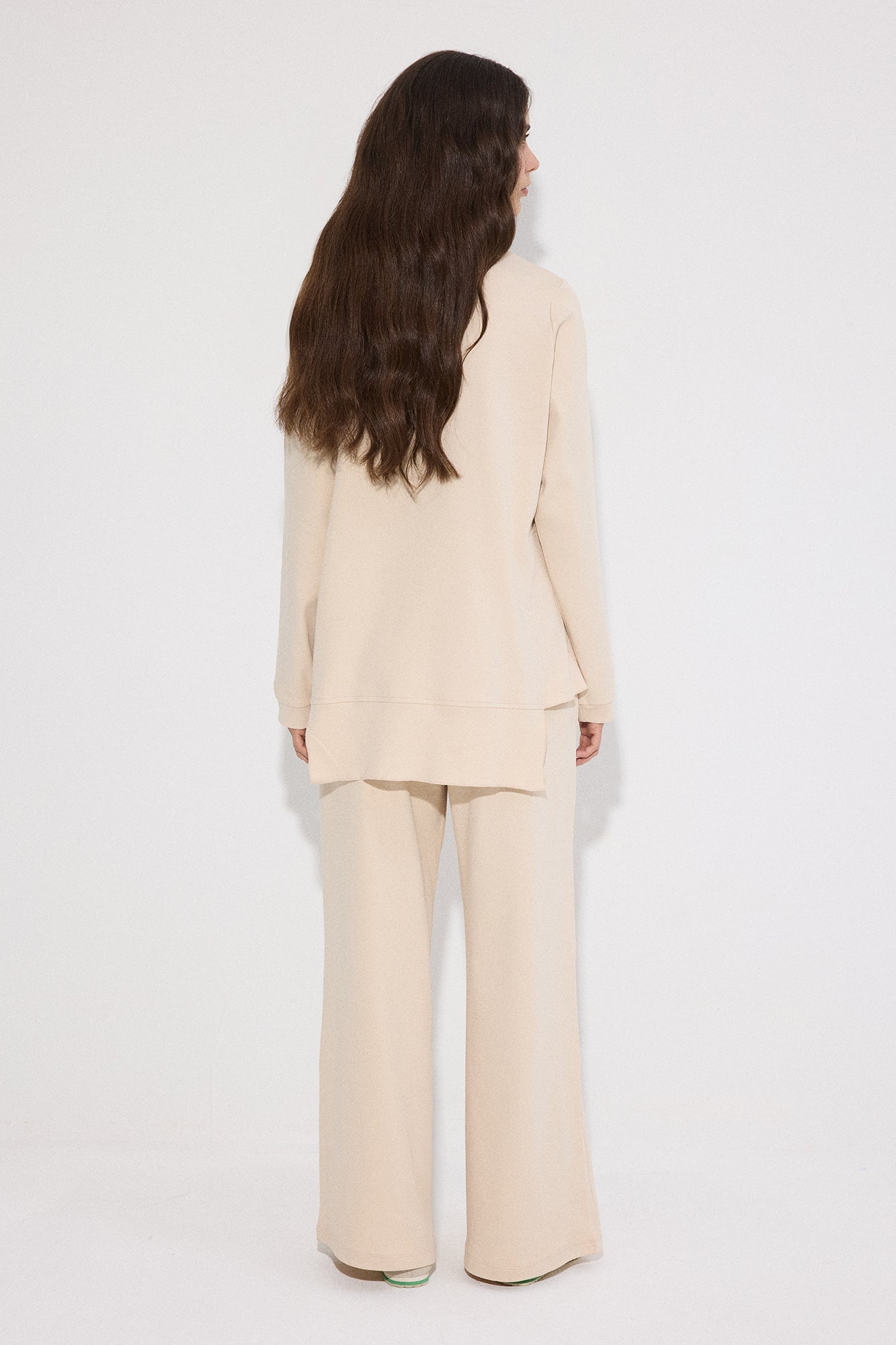 Bisiklet yaka. Uzun kollu. Yanlardan hafif yırtmaçlı, volanlı/kat detaylı etek ucu. Yüksek bel pantolon. Geniş paça form.