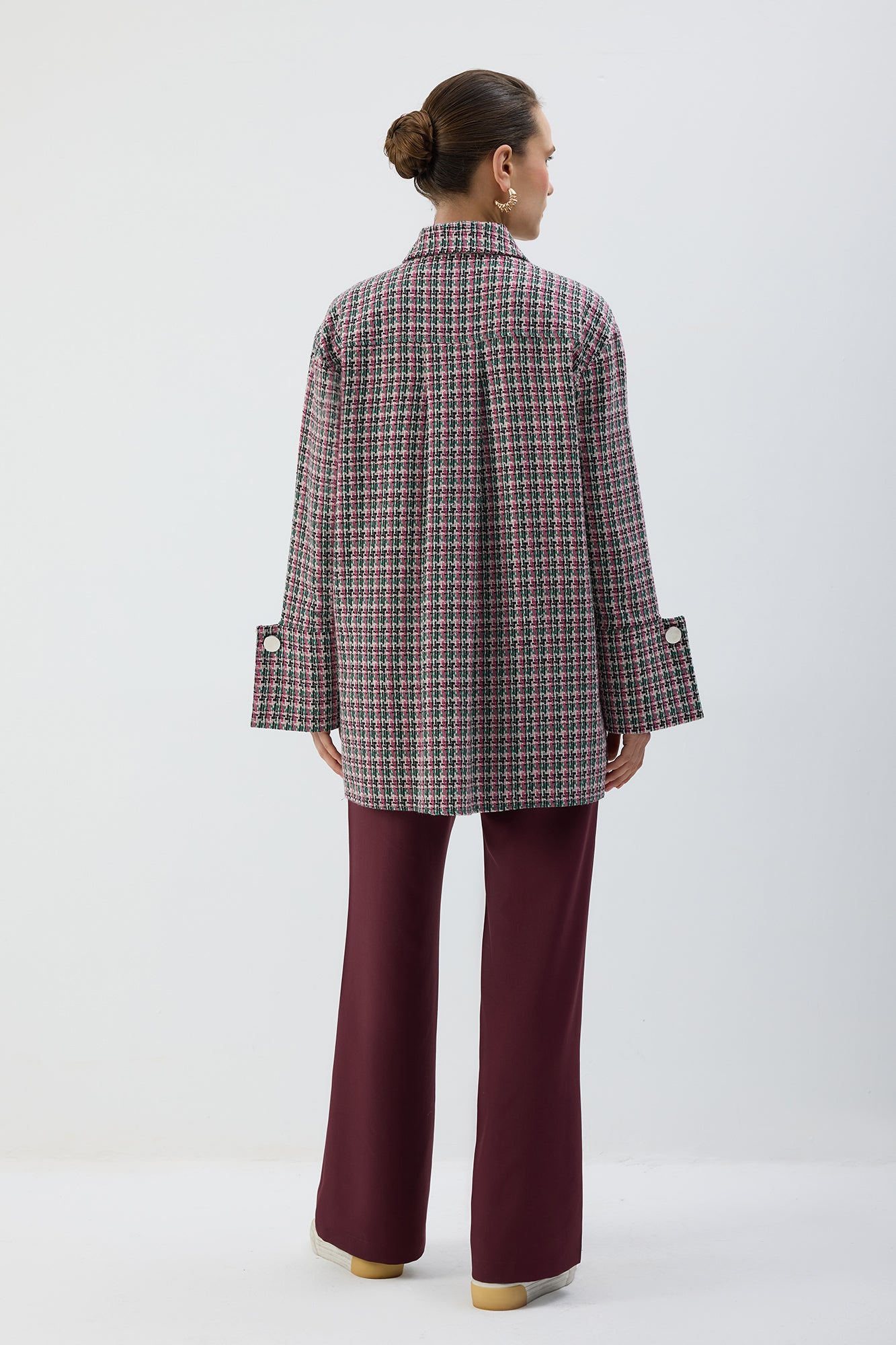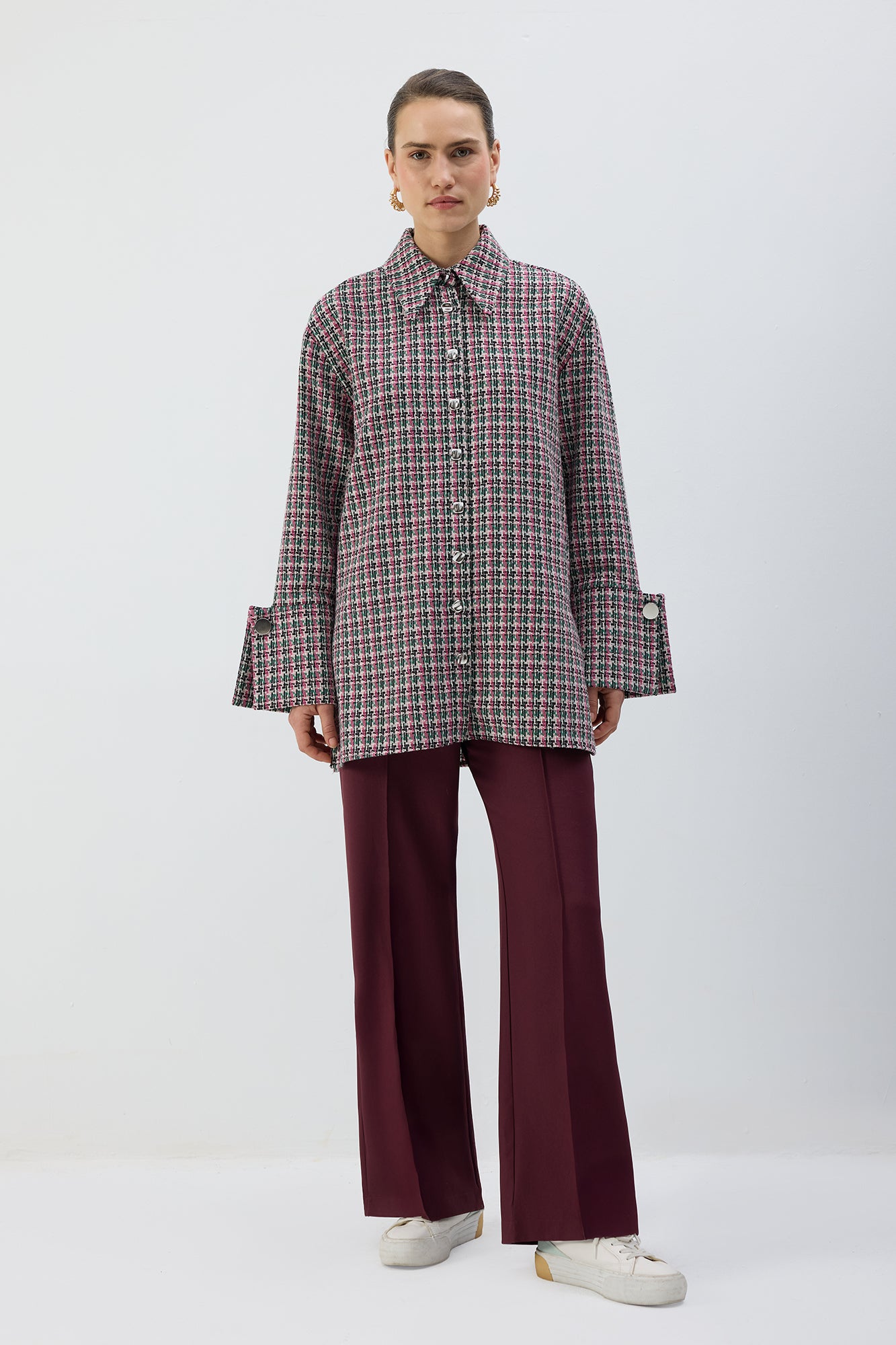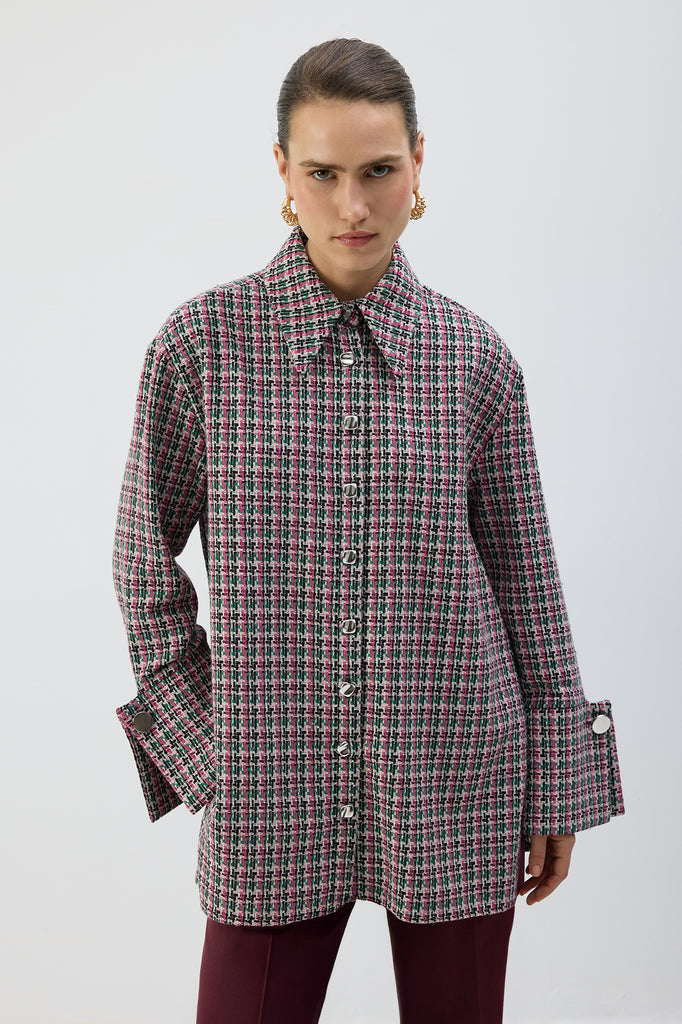 Tüvit, uzun kollu, düğmeli gömlek.